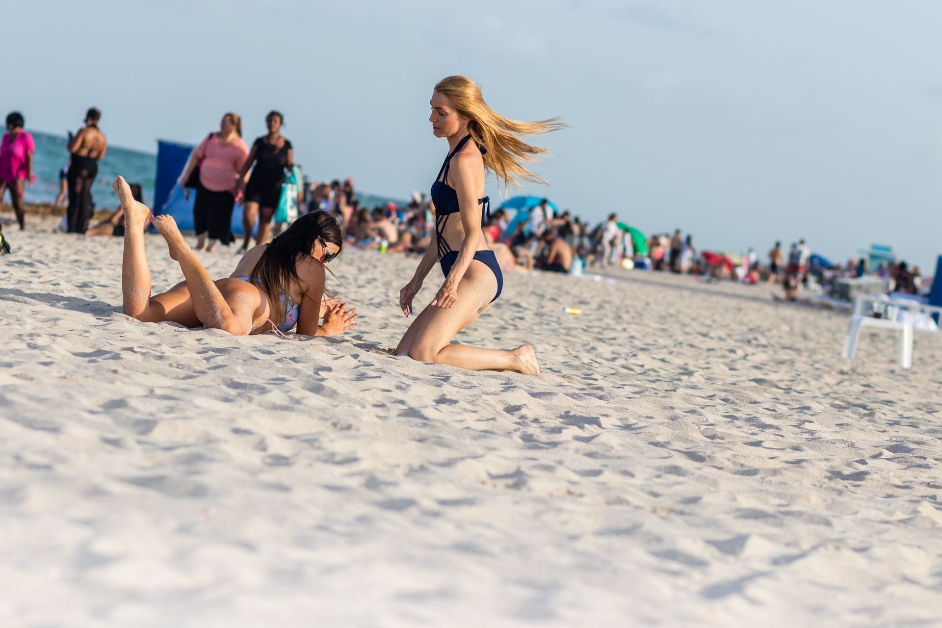 La estrella de la televisión de realidad Claudia Romani y la modelo italiana Lucia Luciano están charlando y paseando por South Beach, 08/08/2019. Claudia, como siempre, con un diminuto tanga y su amiga Lucia con un traje de baño a la moda, pasando un gran momento.