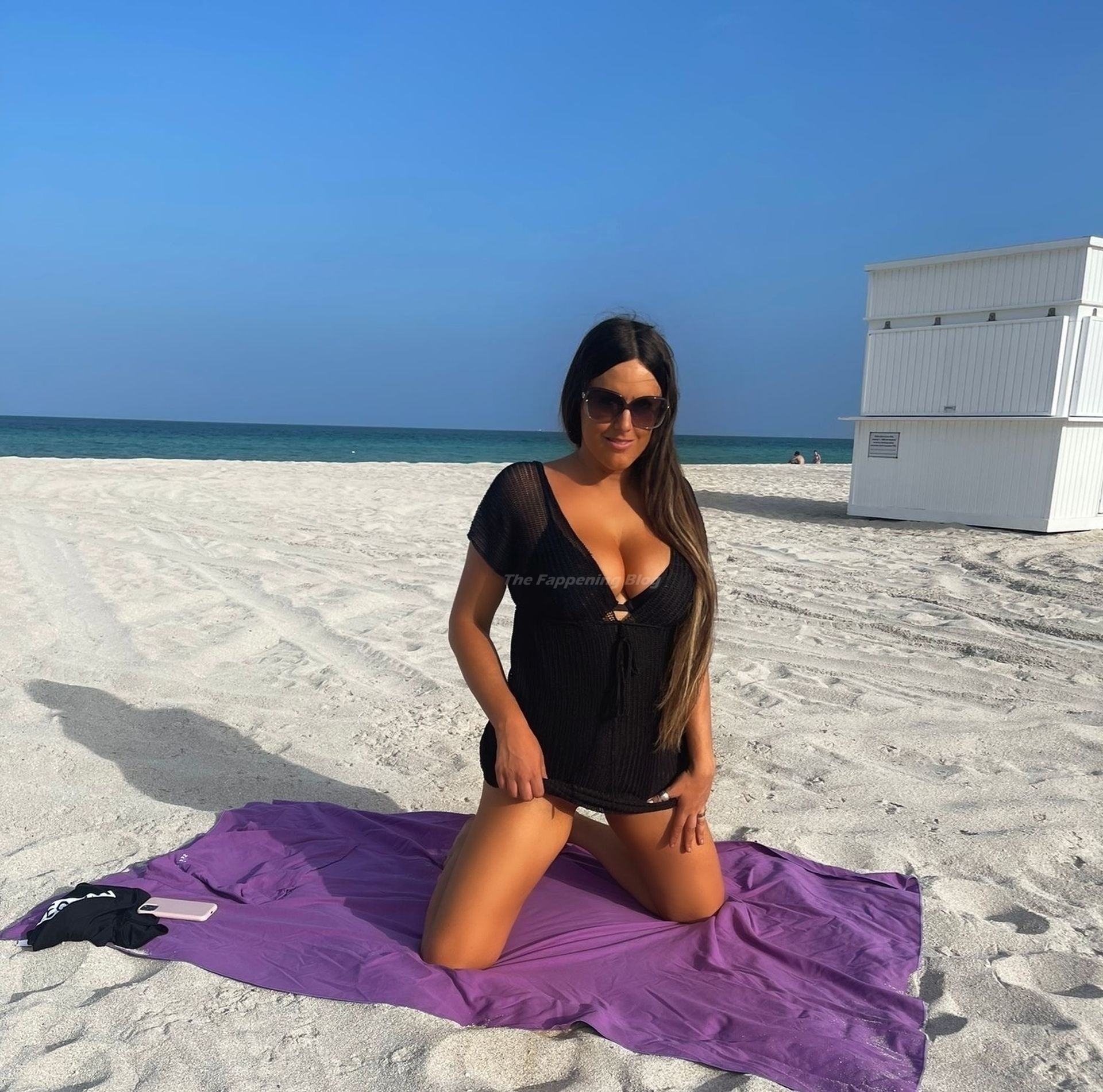 La modelo lleva un top corto de la marca combinado con un pequeño bikini lila que combina con la toalla de playa.