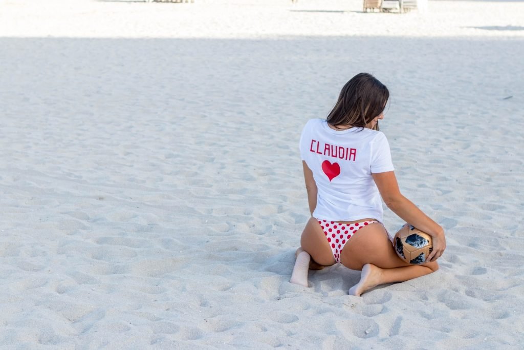Claudia Romani en South Beach justo antes de la final de la Copa del Mundo vistiendo una camiseta personalizada de Rusia 2018 y un bikini de lunares, 14/07/2018. La modelo de 36 años y personalidad de televisión estaba sonriente y mostrando sus curvas, divirtiéndose.