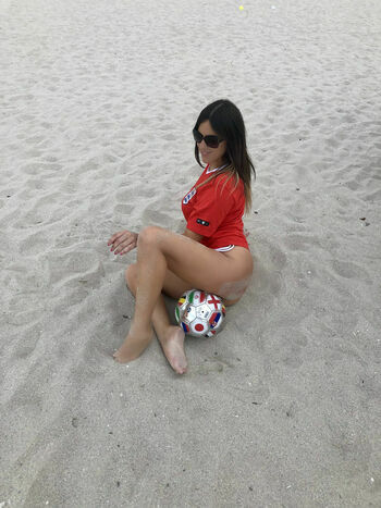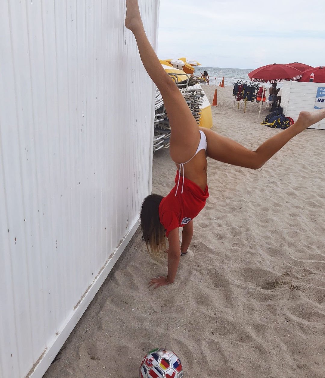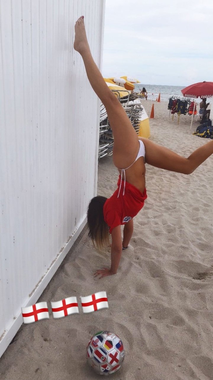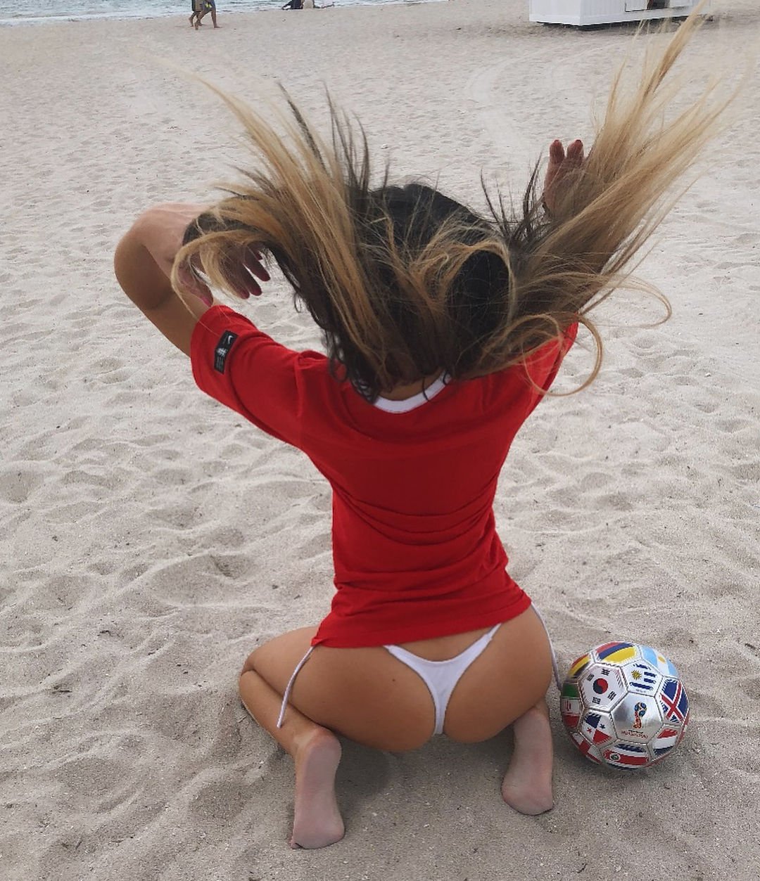 La modelo italiana y estrella del reality show ‘Secret Story 9’, Claudia Romani (36), fue vista el domingo por la tarde en Miami Beach vistiendo una camiseta de Inglaterra y jugando con un balón oficial de la Copa Mundial en Miami, 18/06/2018. La modelo y árbitra de fútbol es una gran aficionada al fútbol, y dado que Italia no se clasificó para la Copa Mundial, Claudia ha elegido apoyar a Inglaterra, habiendo vivido en Londres durante muchos años.