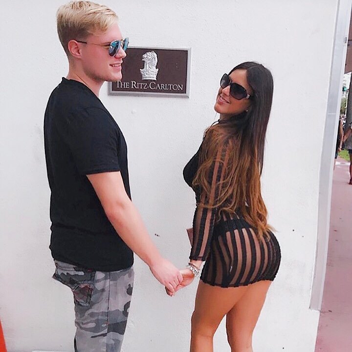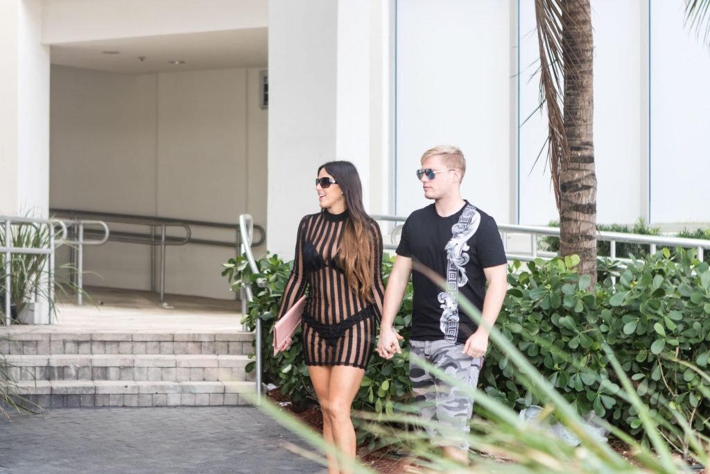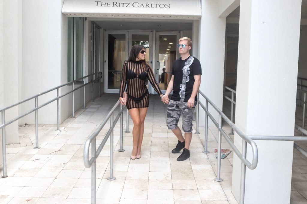 Estrella italiana de reality TV, modelo, residente de South Beach y reina del trasero Claudia Romani (35) vista hoy fuera del Ritz Carlton en South Beach con su joven novio Chris Johns. Ella llevaba un vestido completamente transparente, mostrando su tanga negra. La pareja parecía feliz, con mucho PDA en Miami, 25/10/2017.