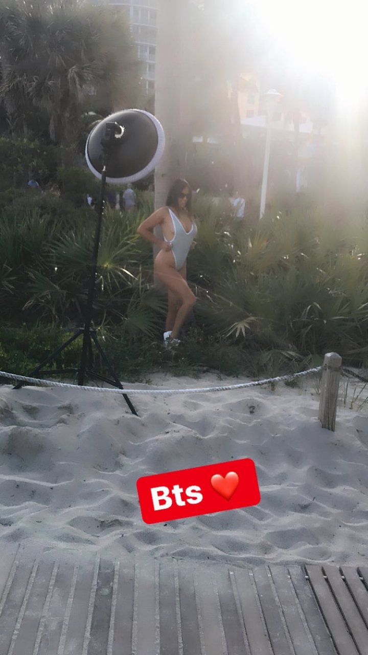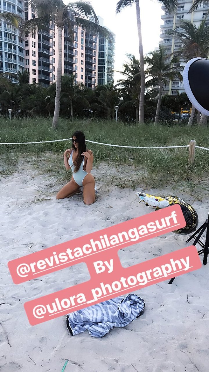 Model y estrella de telerrealidad Claudia Romani, 35, recibe el Año Nuevo con una sesión de fotos en South Beach, 31/12/2017. Claudia muestra sus atributos mientras posa con un traje de baño azul de una pieza y su globo de Nochevieja.