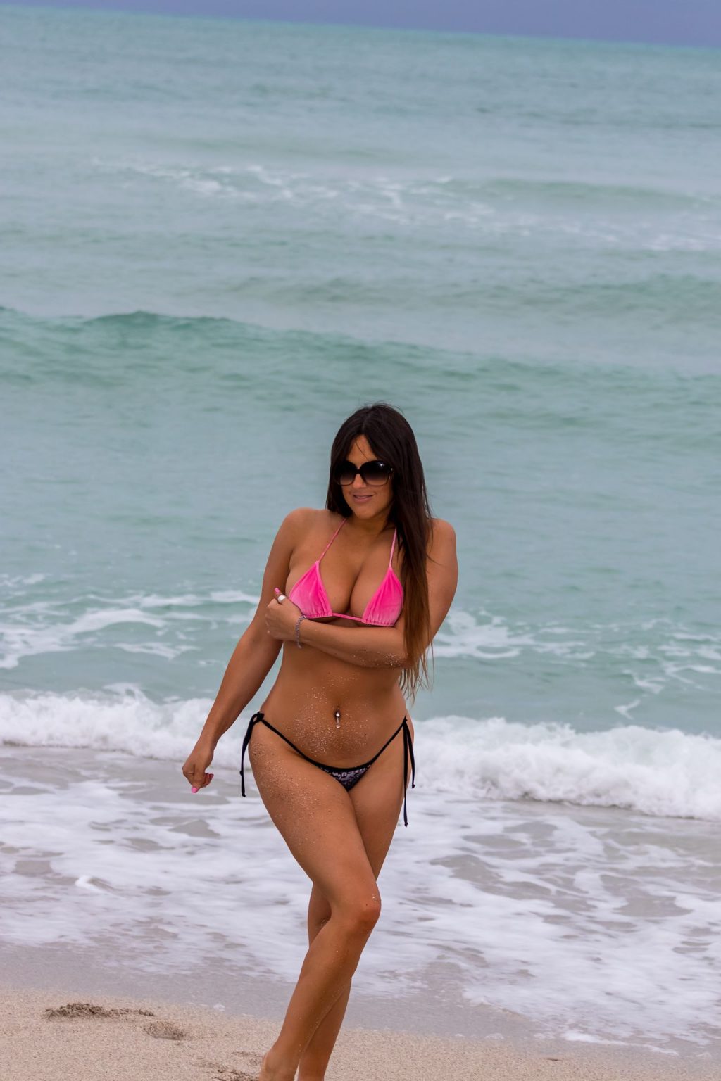 La modelo italoamericana y estrella de la televisión reality Claudia Romani está pasando el día en la playa durante el Festival de Vino y Comida en Miami Beach, 23/02/2020. Ella llevaba un bikini tanga desparejado mostrando sus curvas.