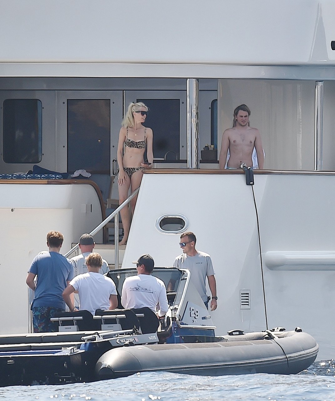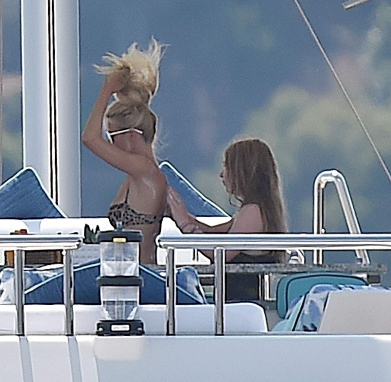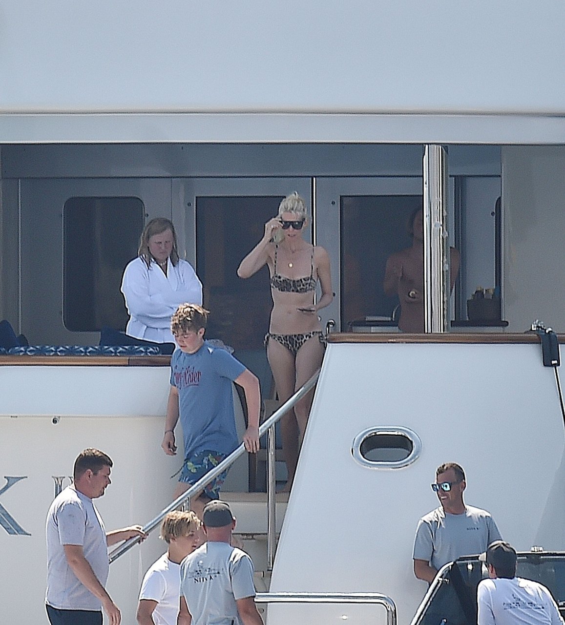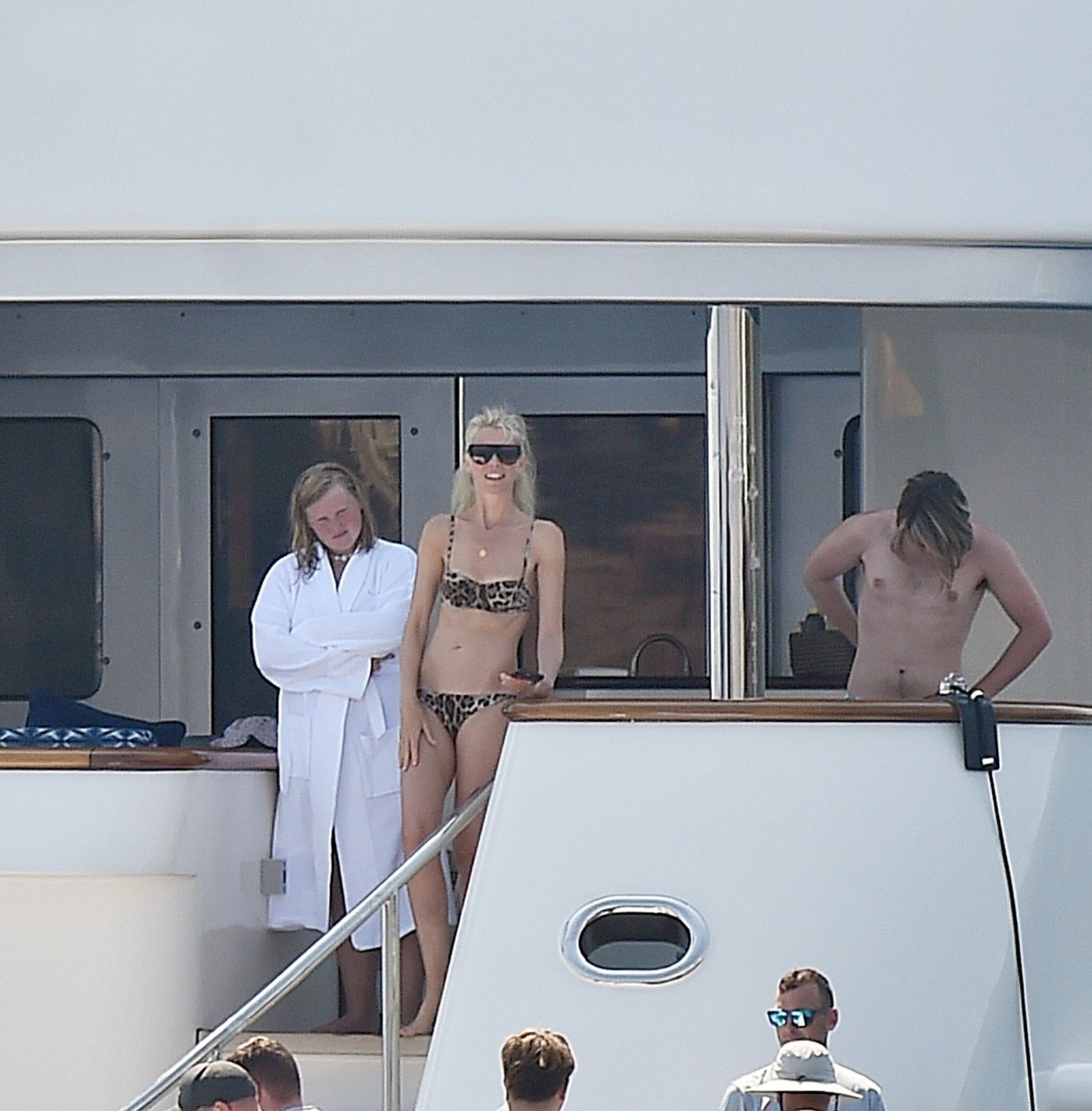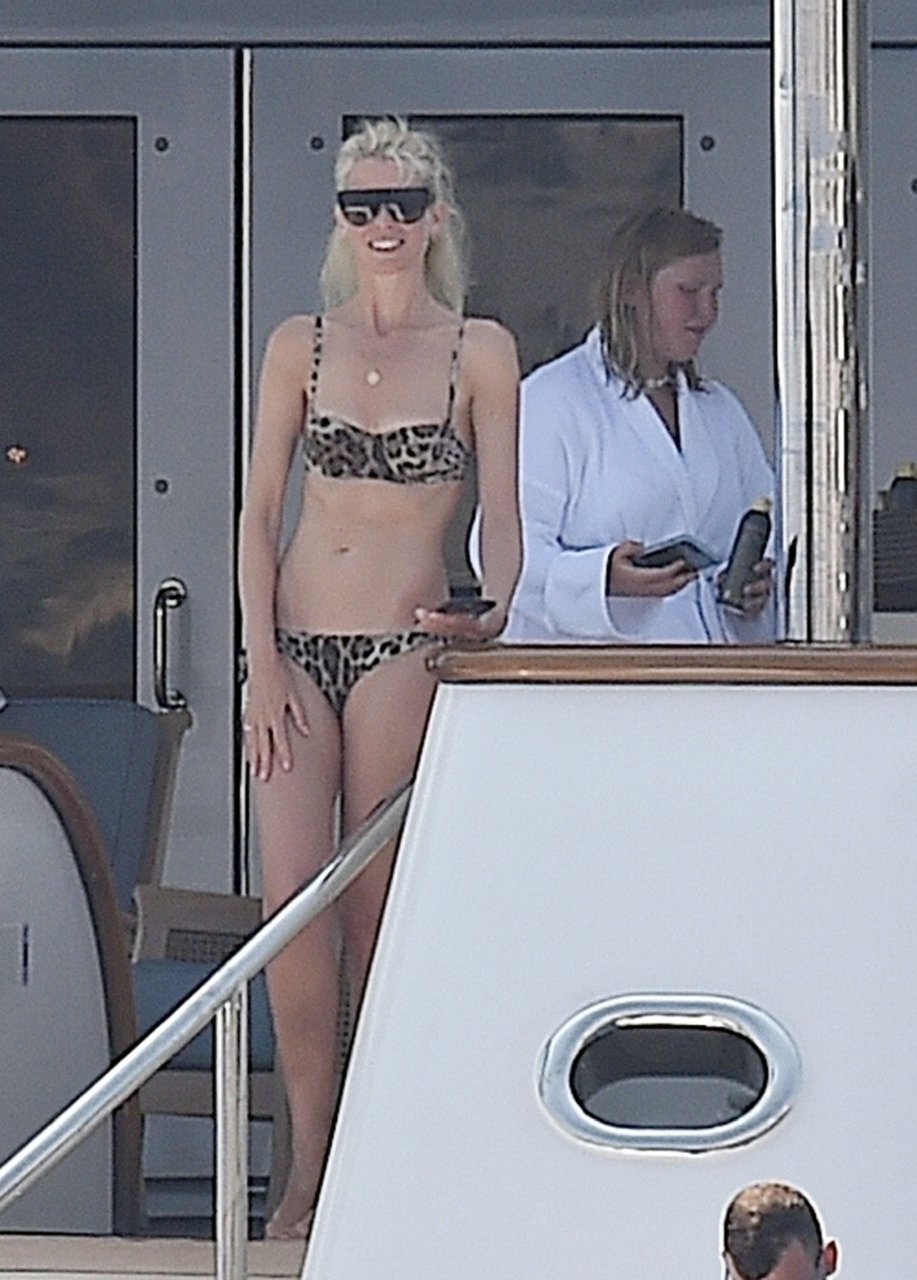 La modelo y actriz alemana Claudia Schiffer posando con su cuerpo tonificado en bikini de estampado animal mientras disfruta de unas vacaciones a bordo de un yate en Portofino, 19/09/2018. La modelo parecía relajada mientras se la veía con su esposo, el director inglés Matthew Vaughn, descansando en el Megayate durante sus vacaciones.