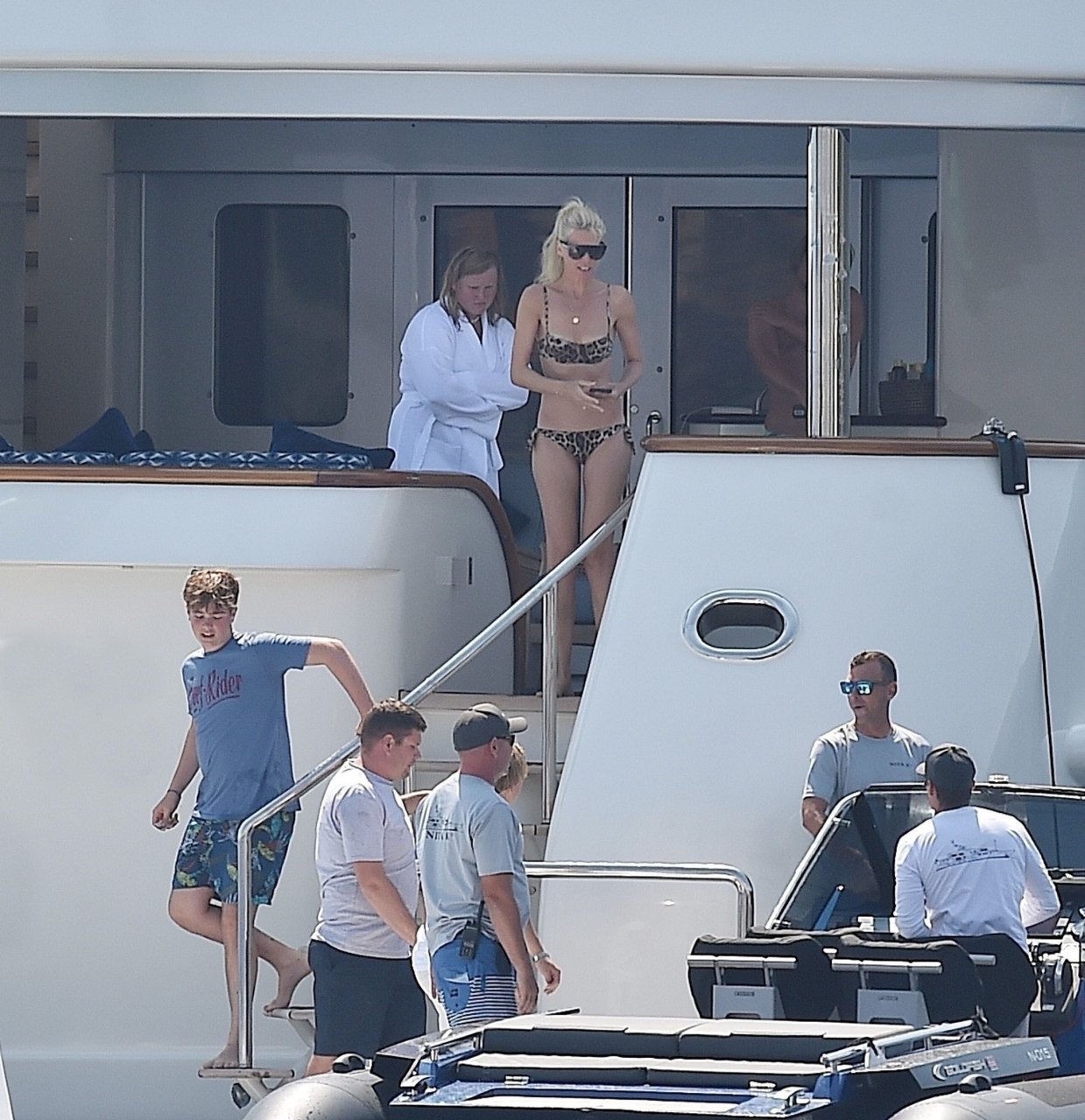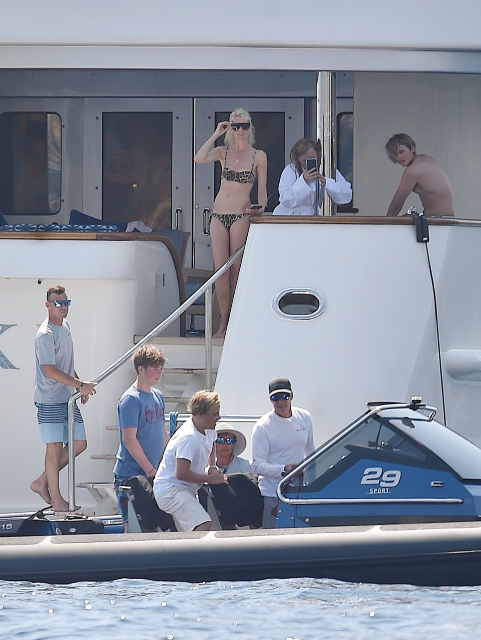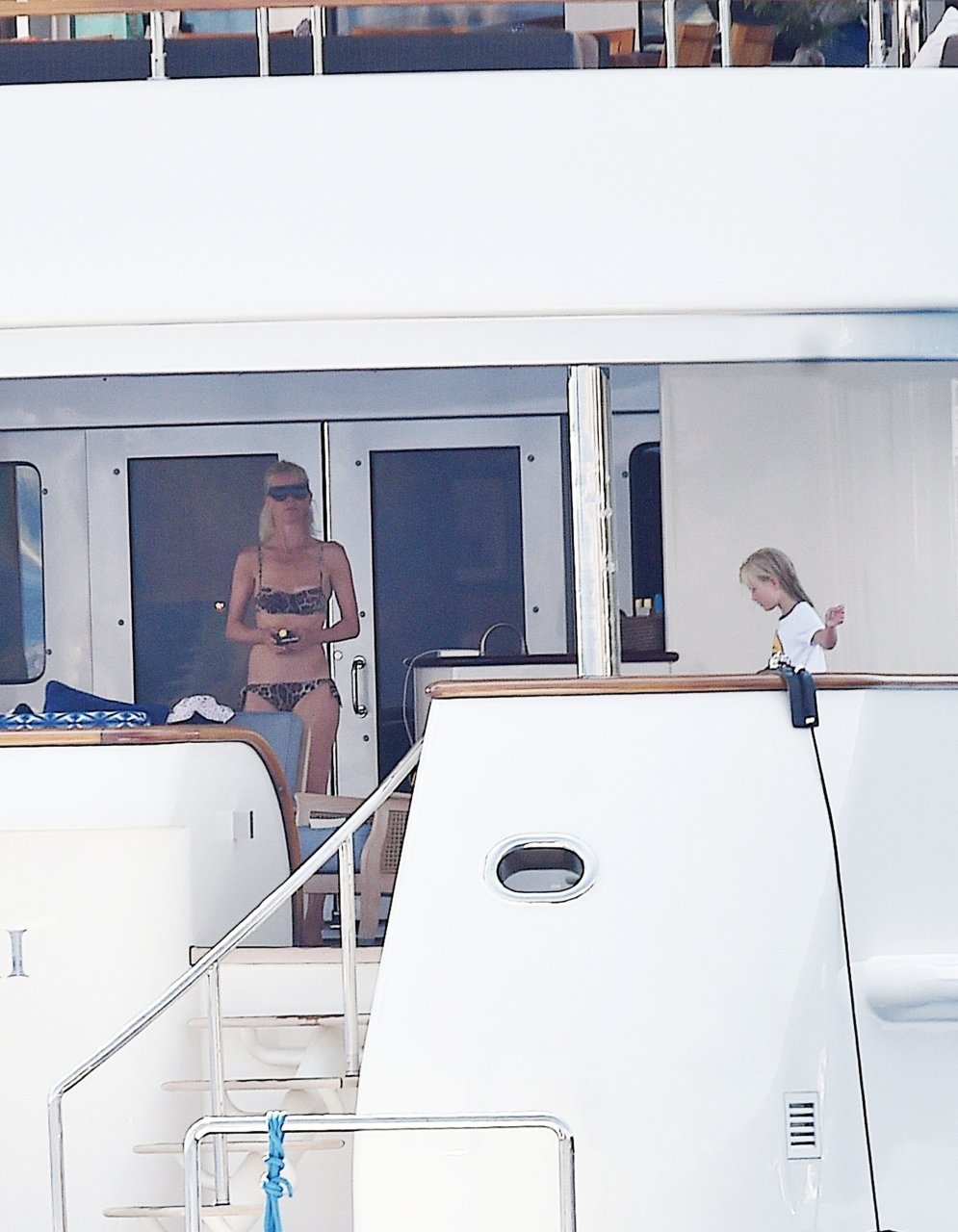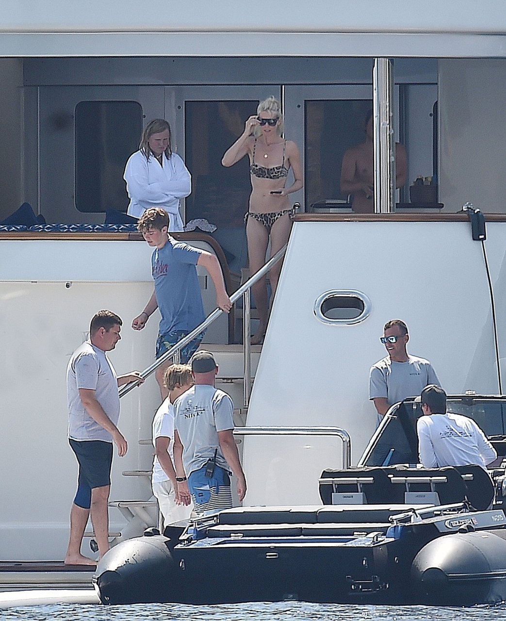 La modelo y actriz alemana Claudia Schiffer posando con su cuerpo tonificado en bikini de estampado animal mientras disfruta de unas vacaciones a bordo de un yate en Portofino, 19/09/2018. La modelo parecía relajada mientras se la veía con su esposo, el director inglés Matthew Vaughn, descansando en el Megayate durante sus vacaciones.
