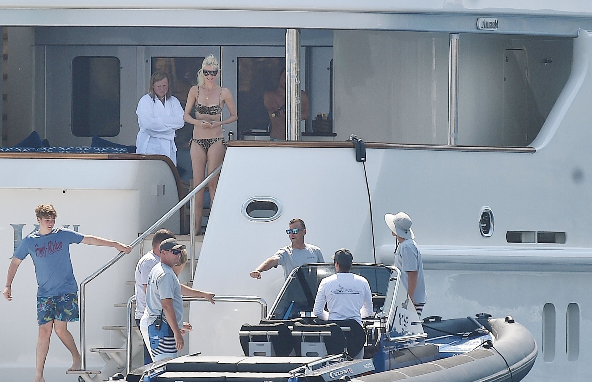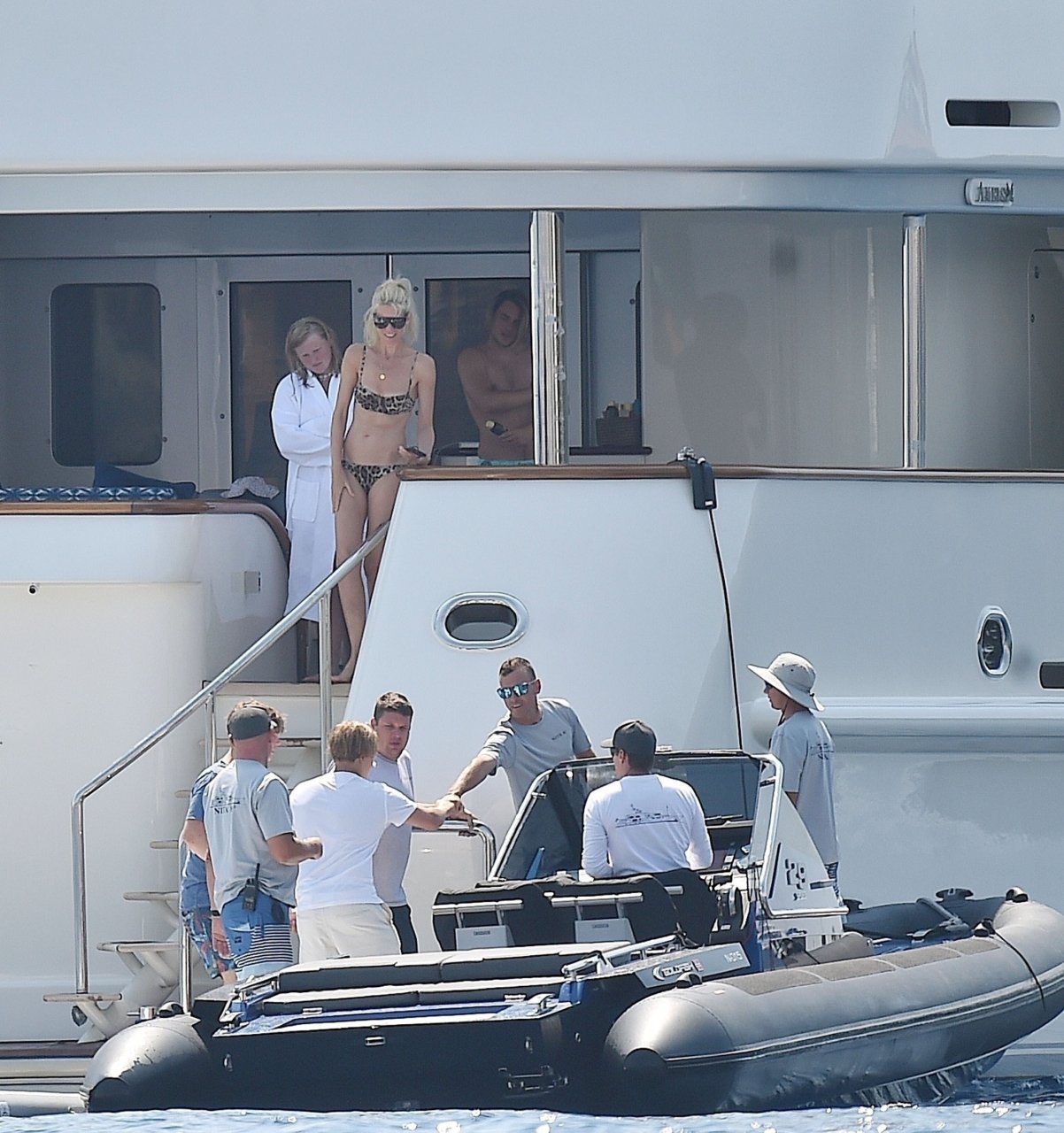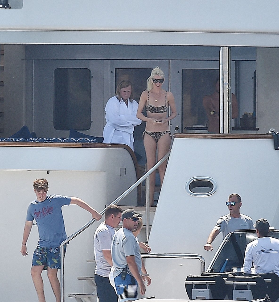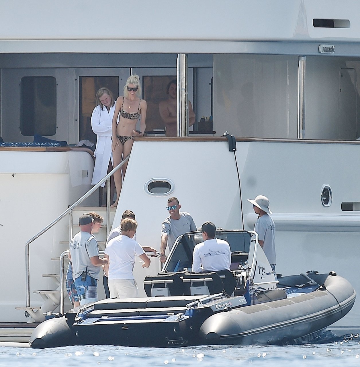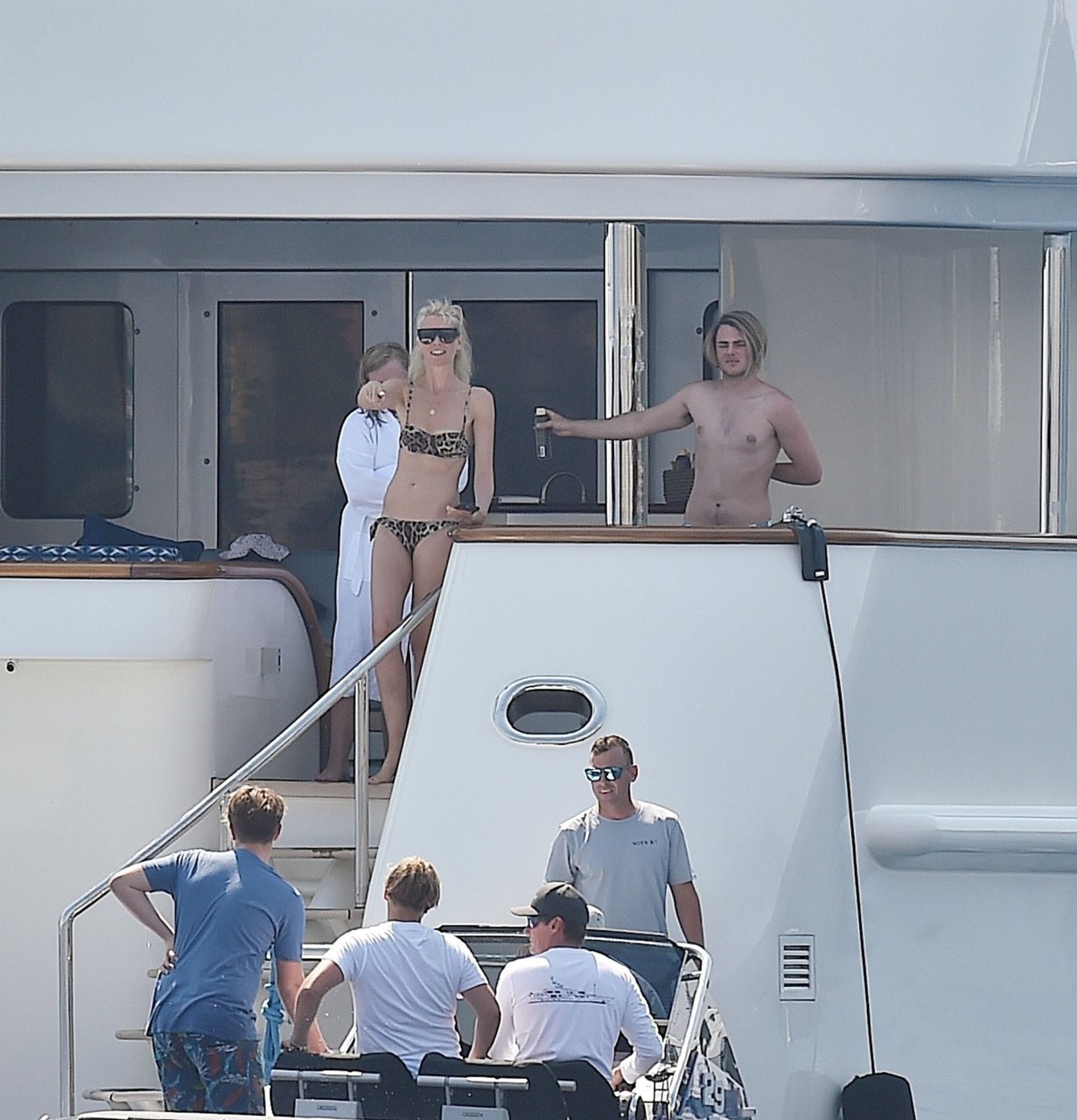 La modelo y actriz alemana Claudia Schiffer posando con su cuerpo tonificado en bikini de estampado animal mientras disfruta de unas vacaciones a bordo de un yate en Portofino, 19/09/2018. La modelo parecía relajada mientras se la veía con su esposo, el director inglés Matthew Vaughn, descansando en el Megayate durante sus vacaciones.