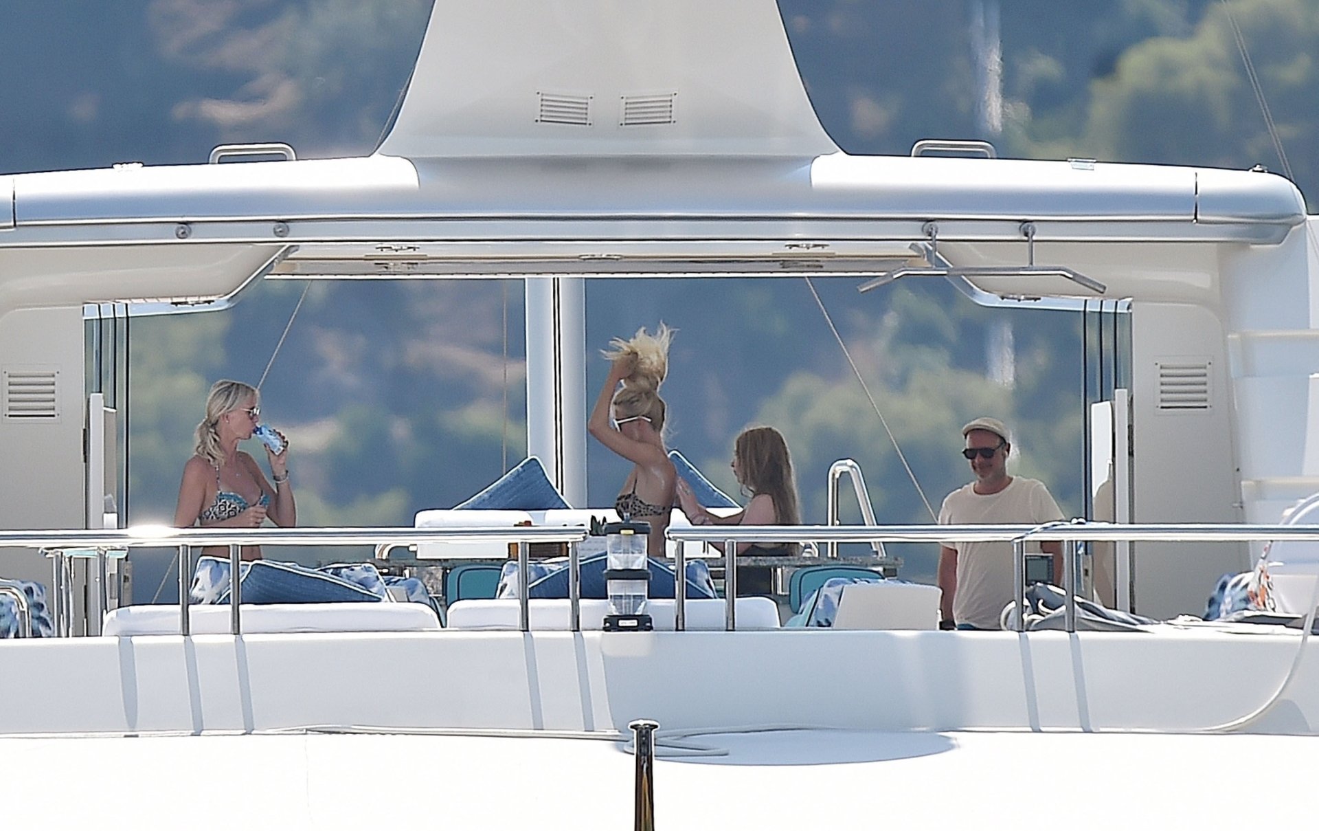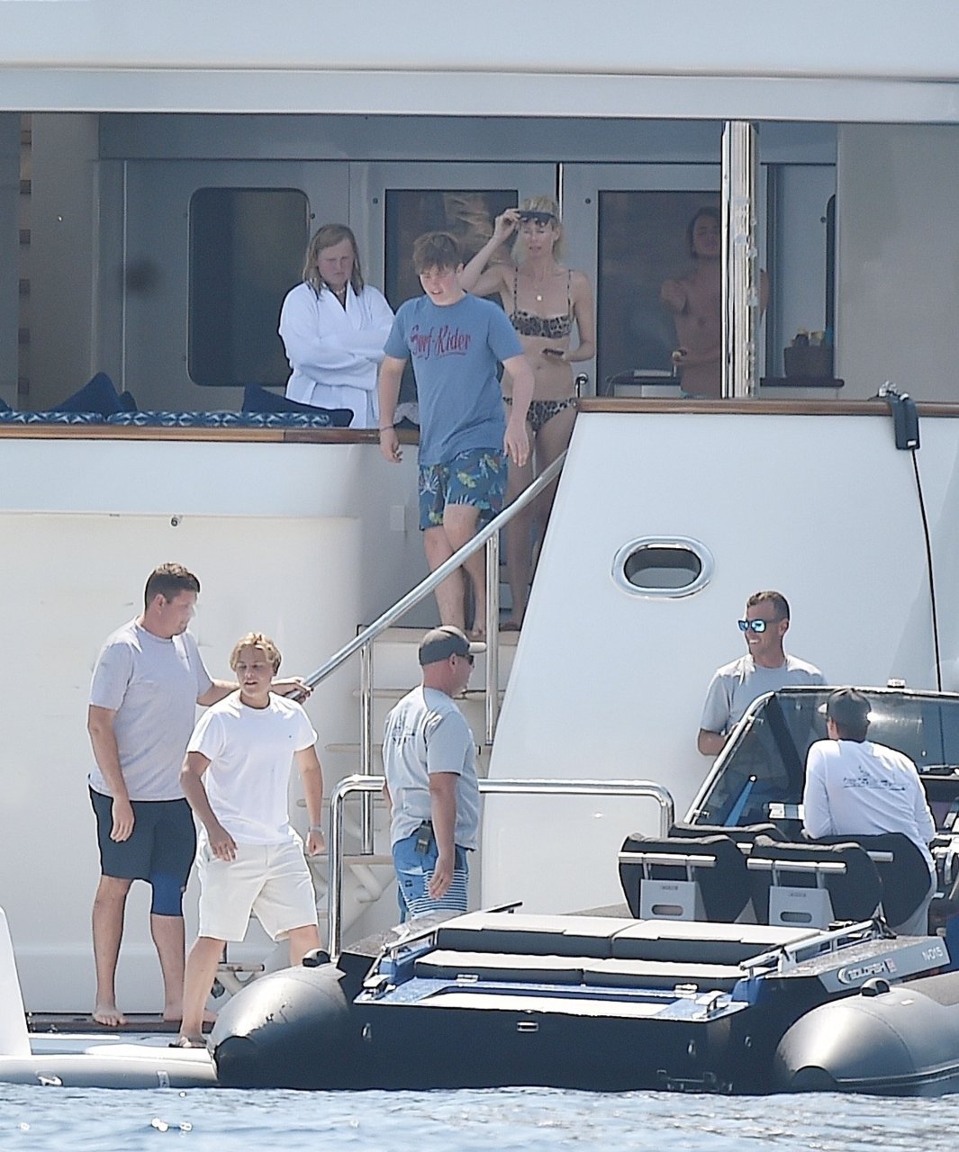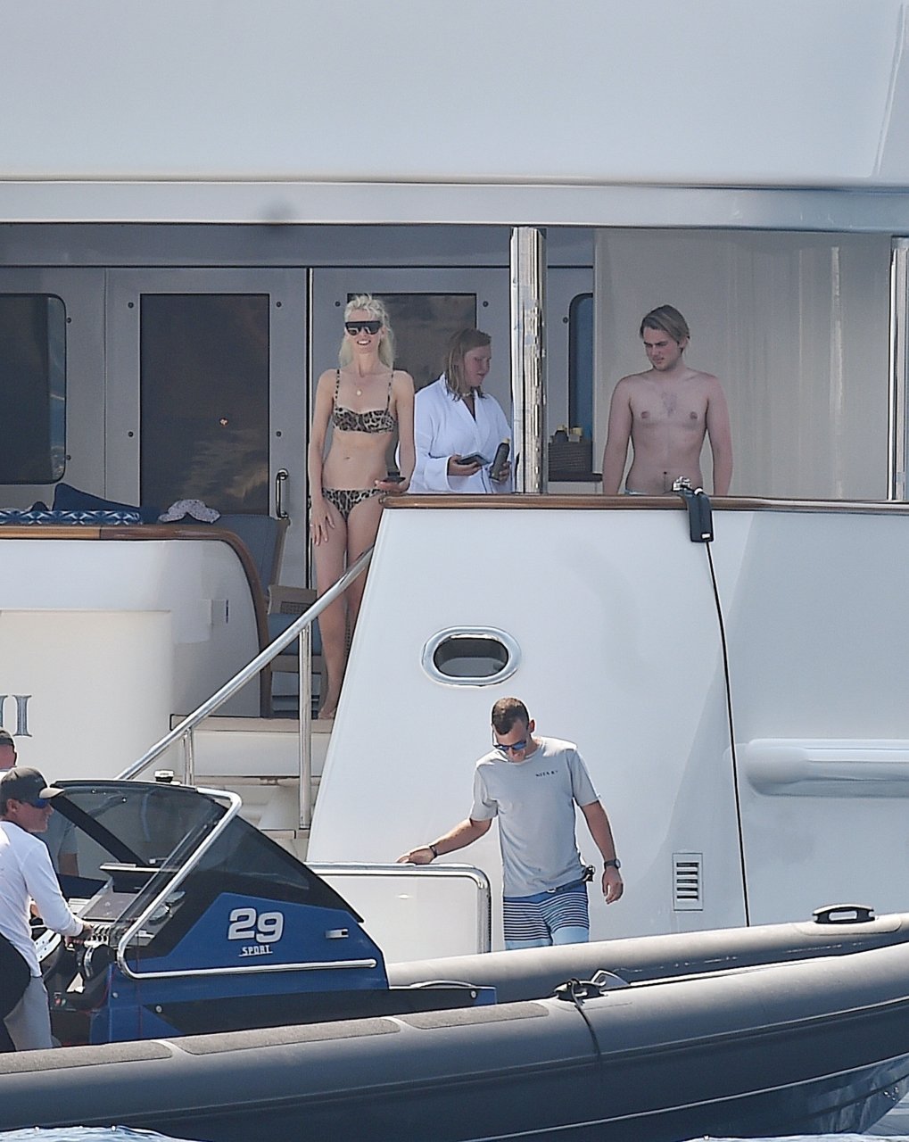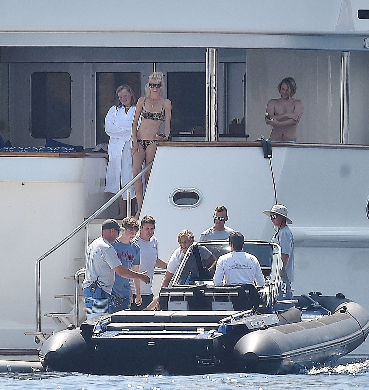 La modelo y actriz alemana Claudia Schiffer posando con su cuerpo tonificado en bikini de estampado animal mientras disfruta de unas vacaciones a bordo de un yate en Portofino, 19/09/2018. La modelo parecía relajada mientras se la veía con su esposo, el director inglés Matthew Vaughn, descansando en el Megayate durante sus vacaciones.