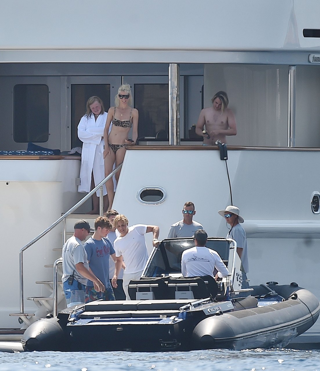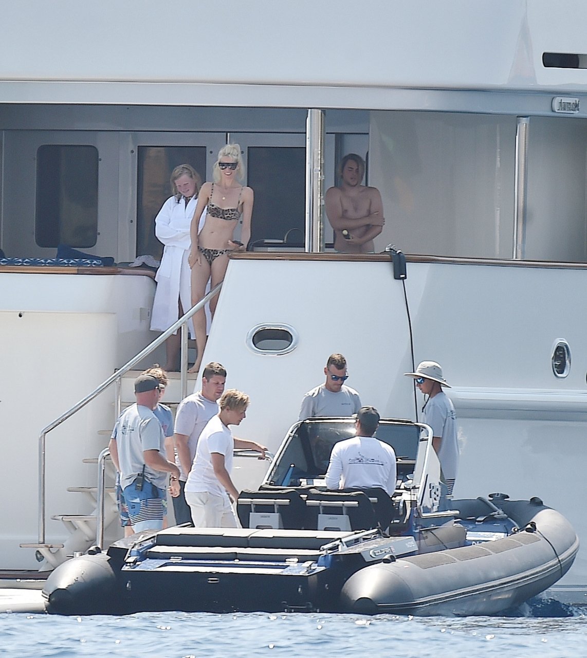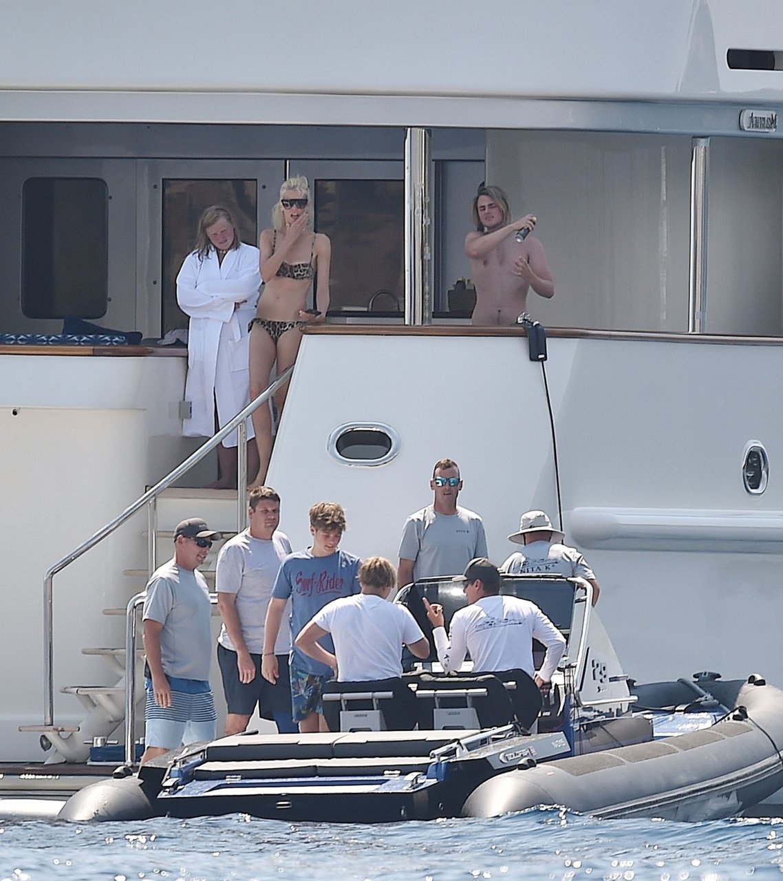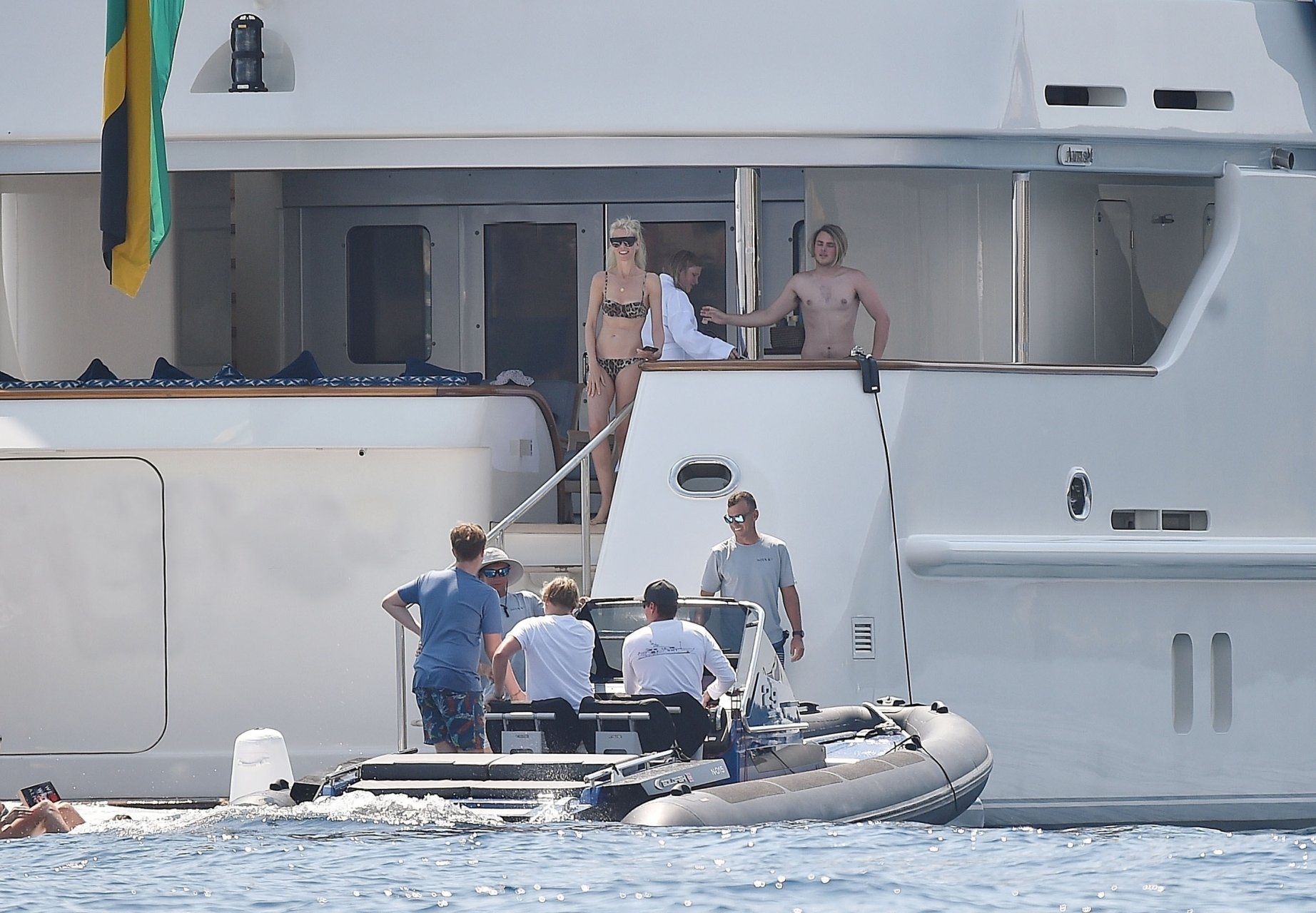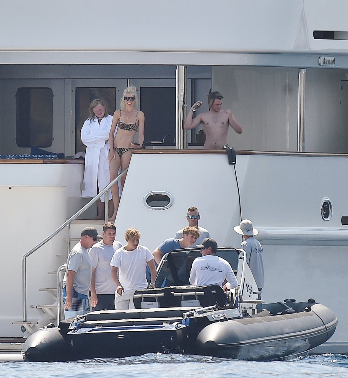 La modelo y actriz alemana Claudia Schiffer posando con su cuerpo tonificado en bikini de estampado animal mientras disfruta de unas vacaciones a bordo de un yate en Portofino, 19/09/2018. La modelo parecía relajada mientras se la veía con su esposo, el director inglés Matthew Vaughn, descansando en el Megayate durante sus vacaciones.