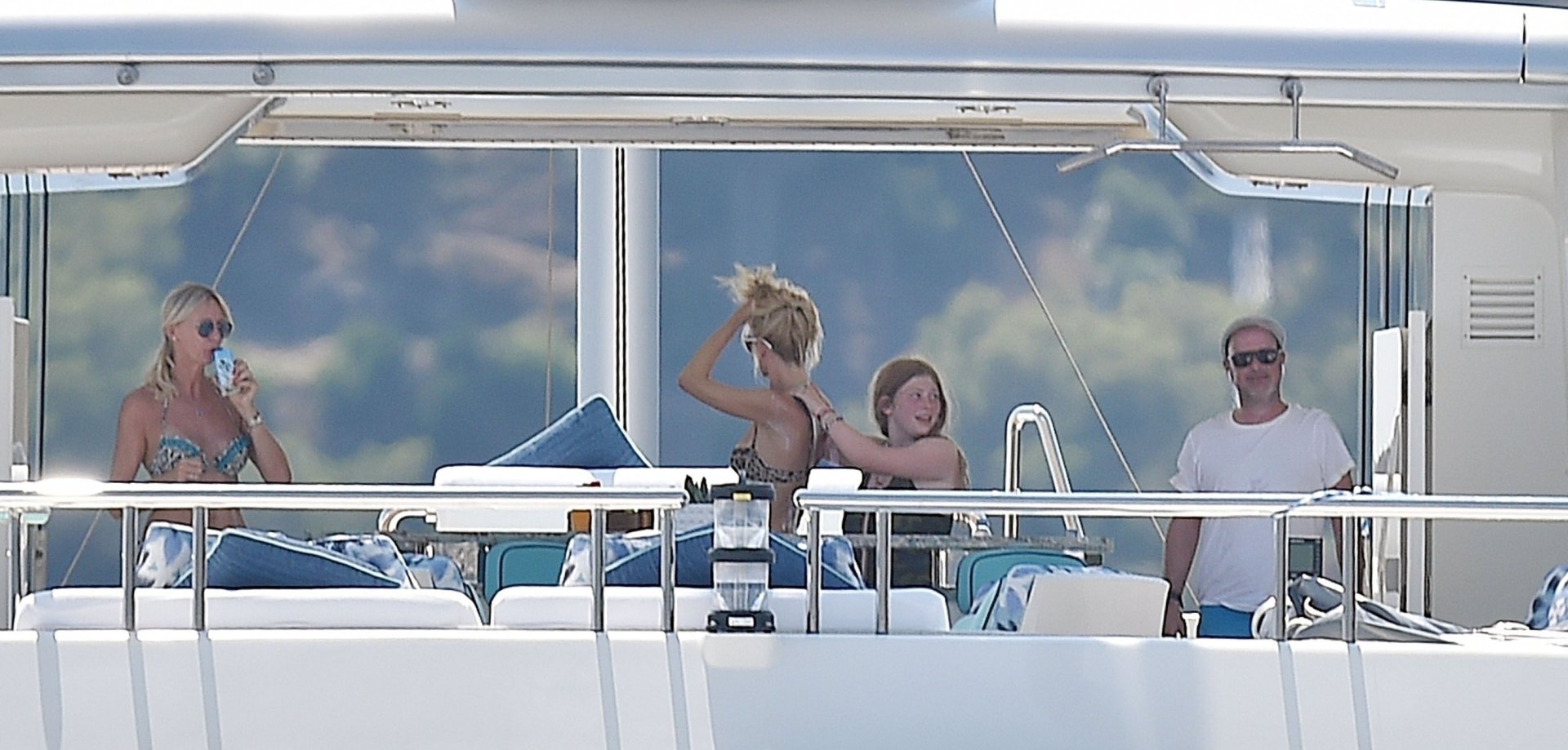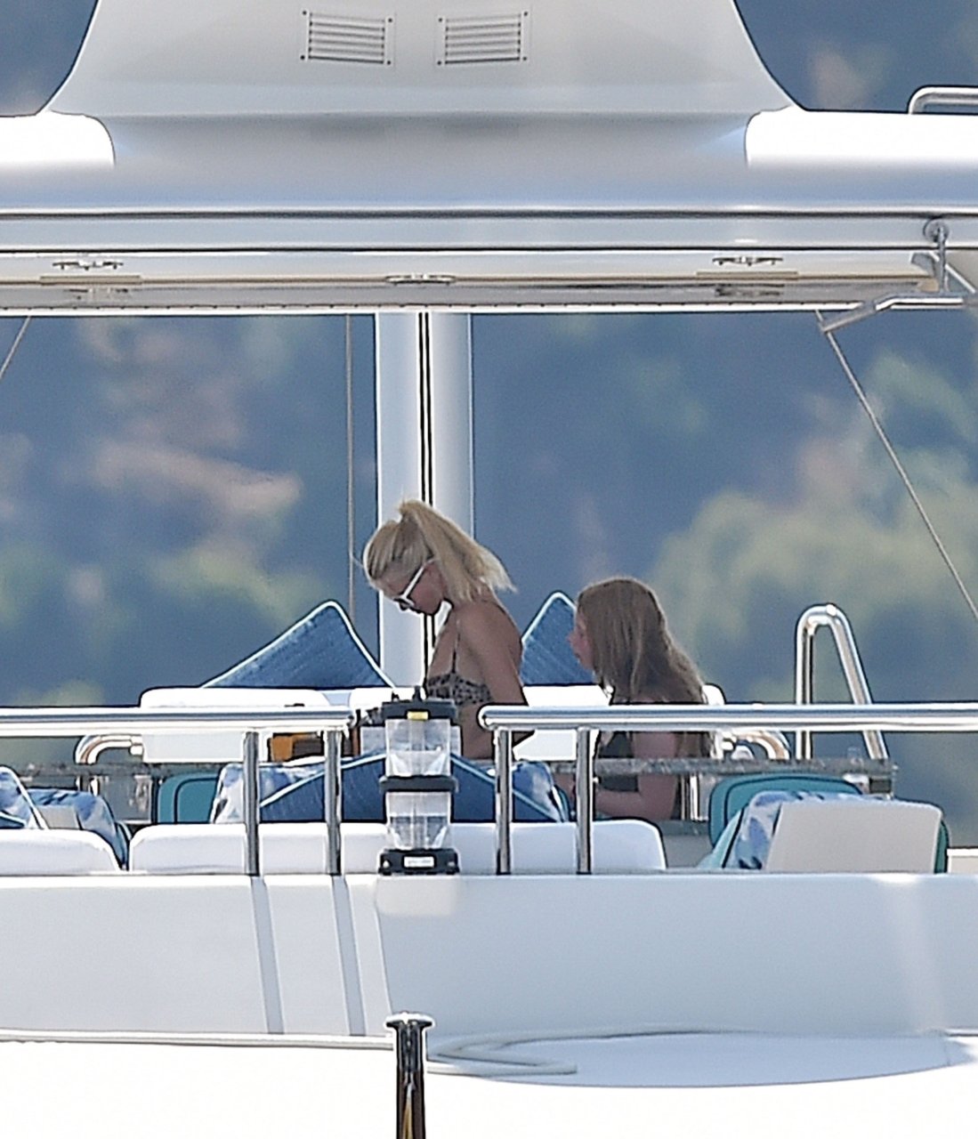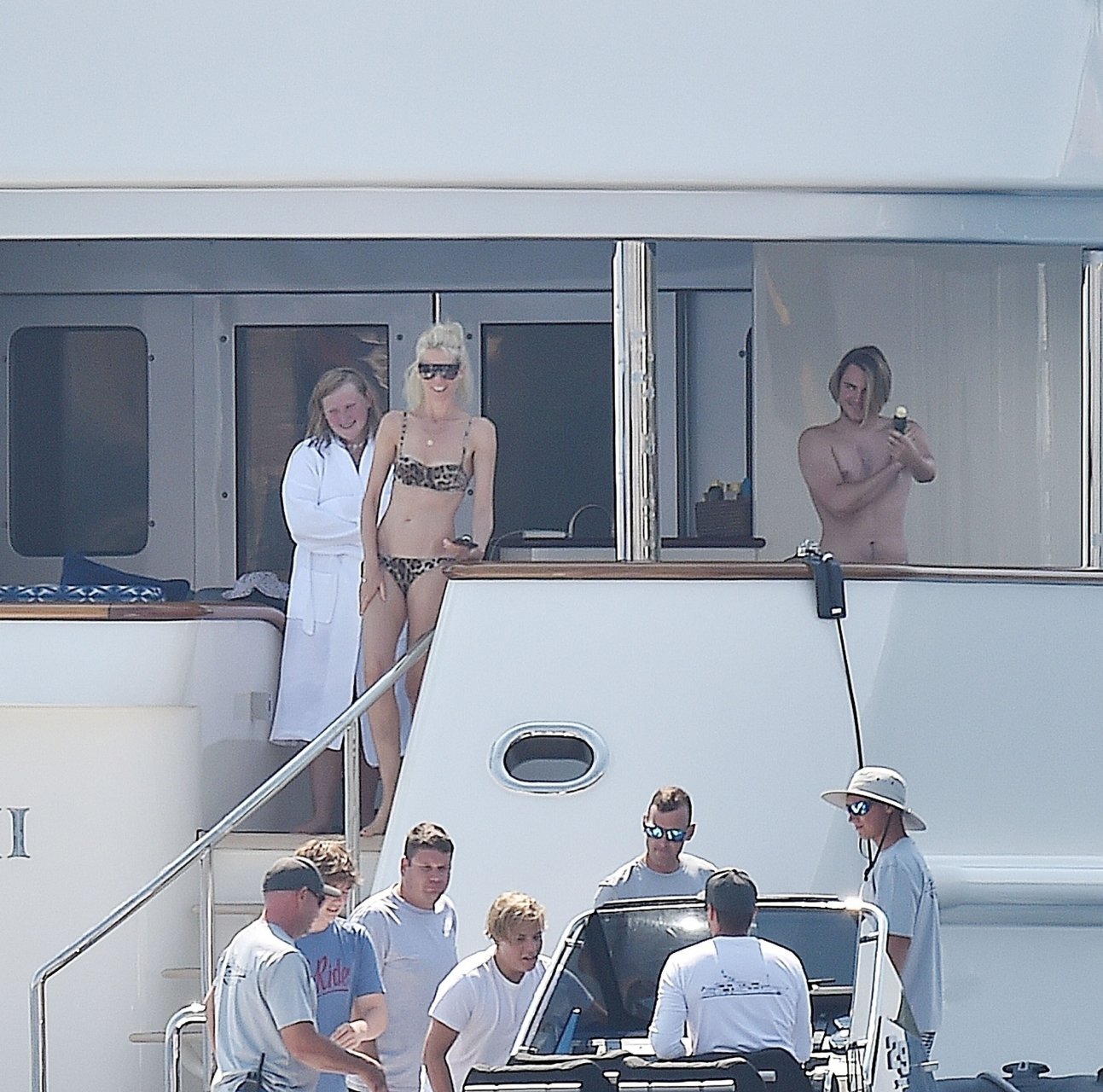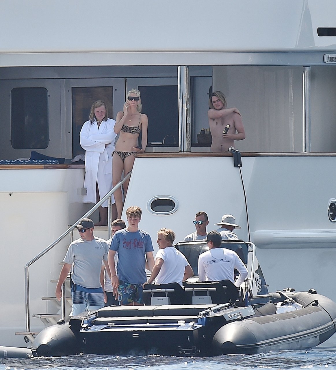 La modelo y actriz alemana Claudia Schiffer posando con su cuerpo tonificado en bikini de estampado animal mientras disfruta de unas vacaciones a bordo de un yate en Portofino, 19/09/2018. La modelo parecía relajada mientras se la veía con su esposo, el director inglés Matthew Vaughn, descansando en el Megayate durante sus vacaciones.