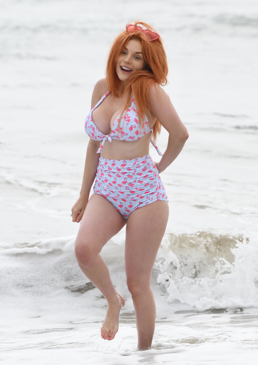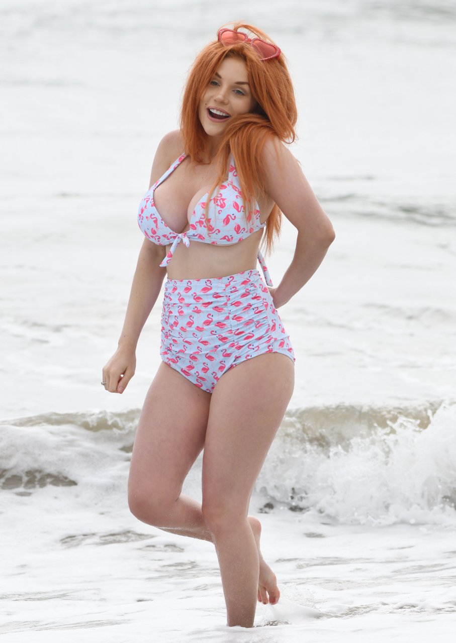 Ember, anteriormente Courtney Stodden, presenta su nuevo look mientras practica boogie board con un bikini de flamenco rosa en una salida a la playa con su cachorro original de Pomerania blanco Cartier en Malibu, 24/06/2018. La joven de 23 años, Ember, también llevaba un bolso Louis Vuitton en su excursión a la playa. Su bikini de flamenco rosa es en honor a su nueva canción Pink Flamingo en su nuevo álbum. Su nuevo cachorro Cartier lleva el nombre de la costosa marca de relojes Cartier.