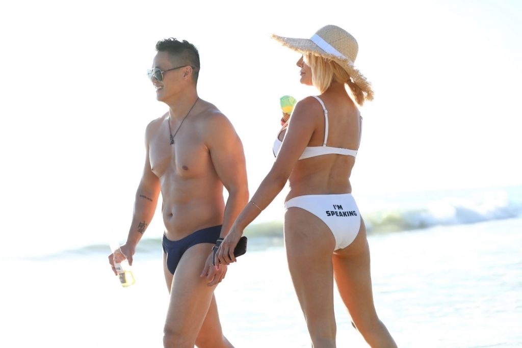 Courtney está encantada con Kamala Harris como la nueva Vicepresidenta y lleva un bikini con su rostro y eslogan en la parte trasera de la parte inferior del bikini.