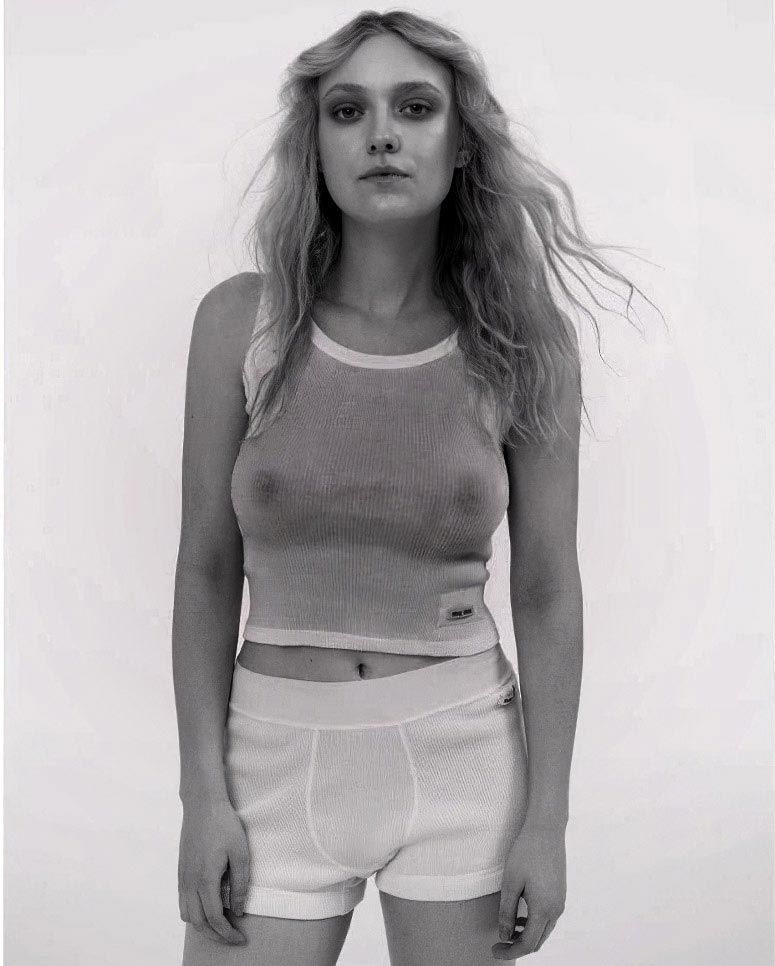 Esta chica simplemente se niega a usar sujetador. Y no solo eso, sino que parece que todo su guardarropa está hecho de camisas delgadas y transparentes. Estas exponen completamente los pechos desnudos de Dakota Fanning y sus pezones duros bajo la tela fina.