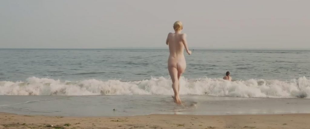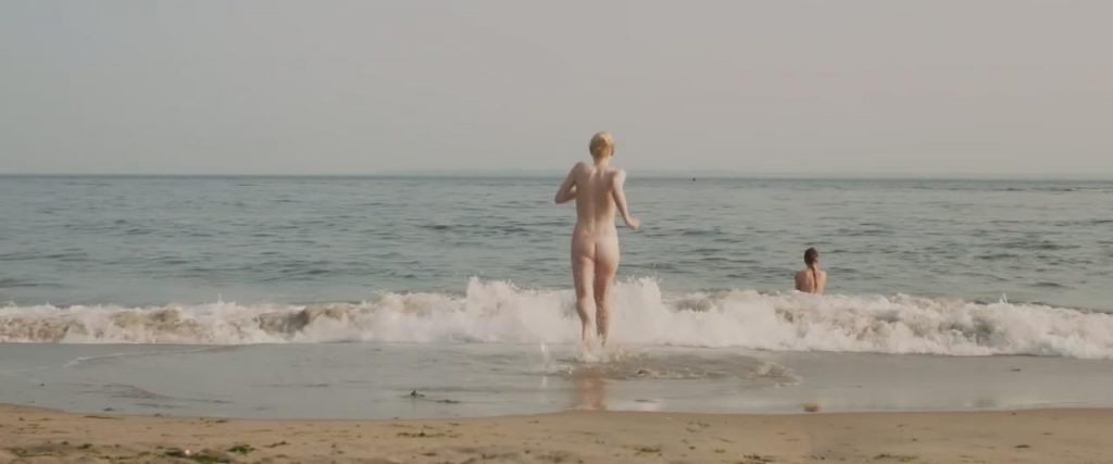 Dakota Fanning y Elizabeth Olsen en la playa donde Elizabeth está topless mientras oculta sus pechos y anima a Dakota a desnudarse para nadar desnuda. Una escena de Very Good Girls.