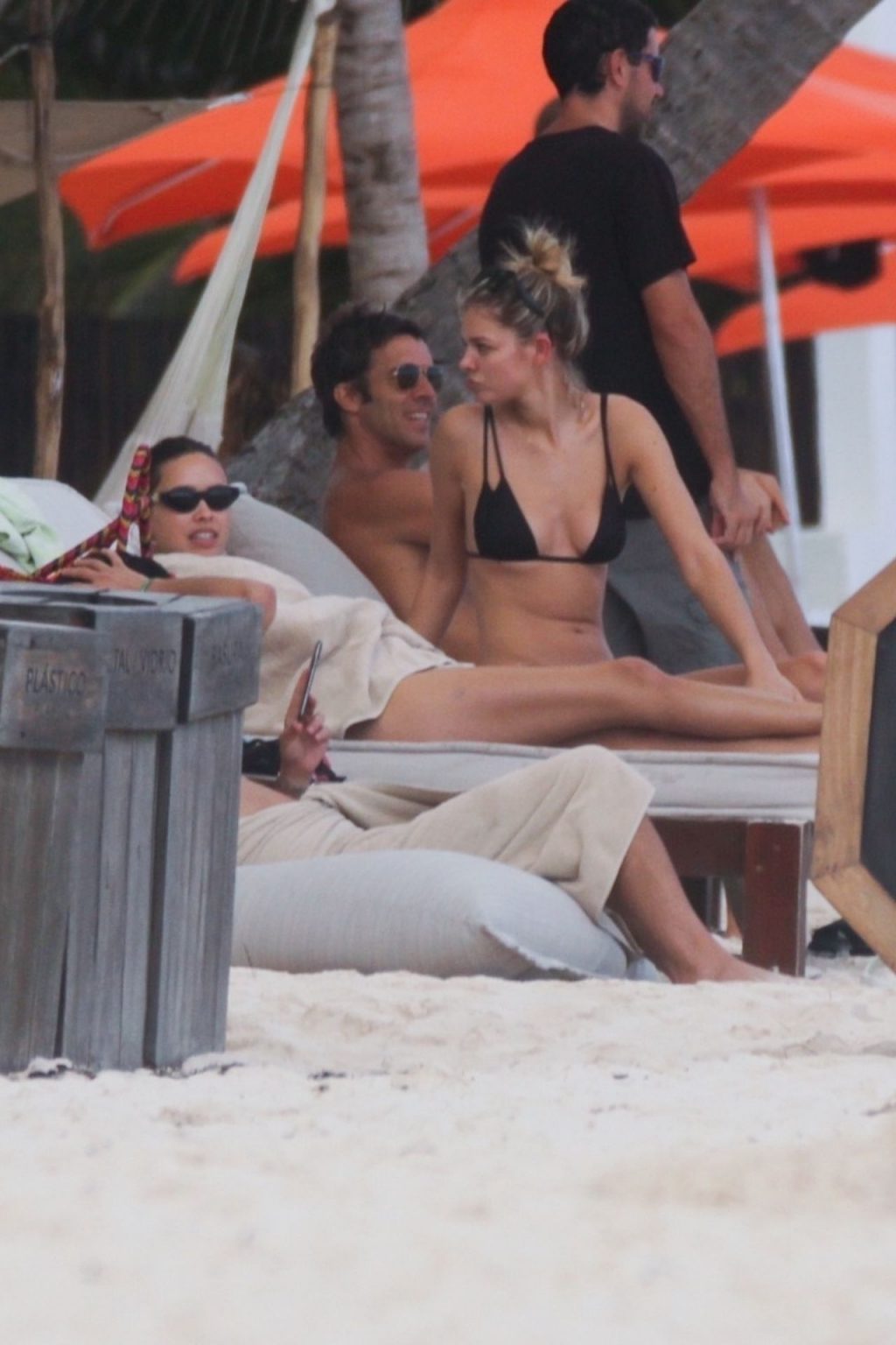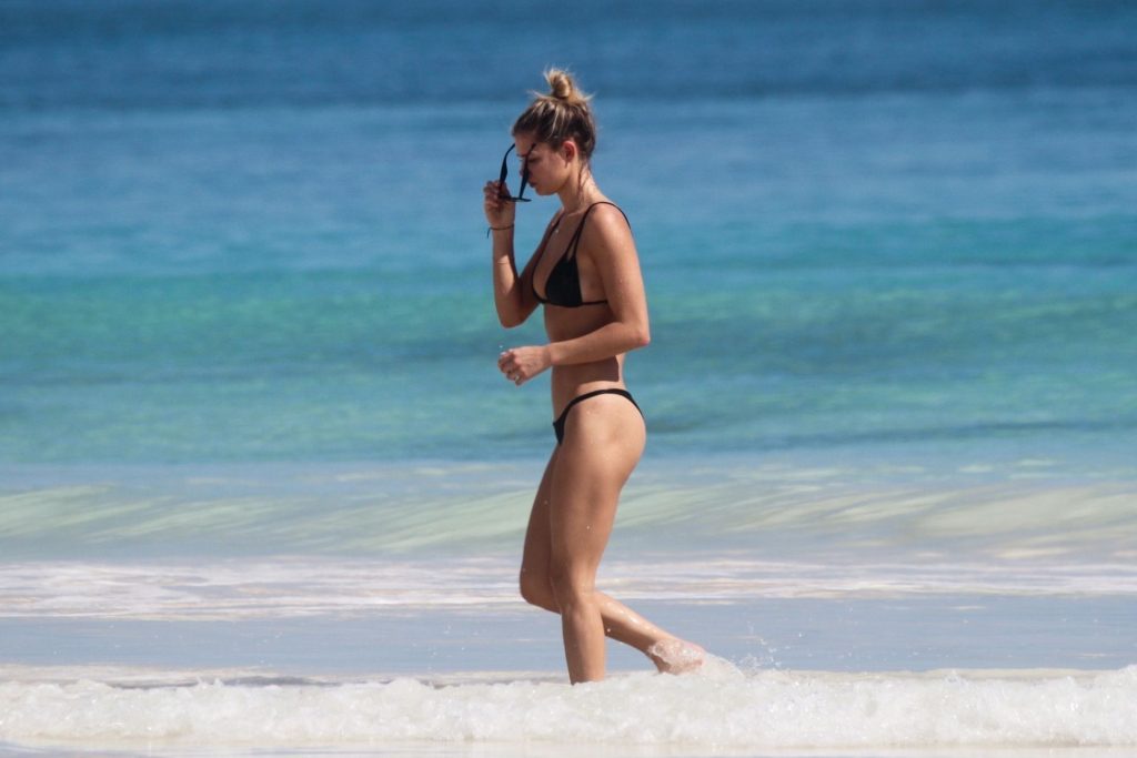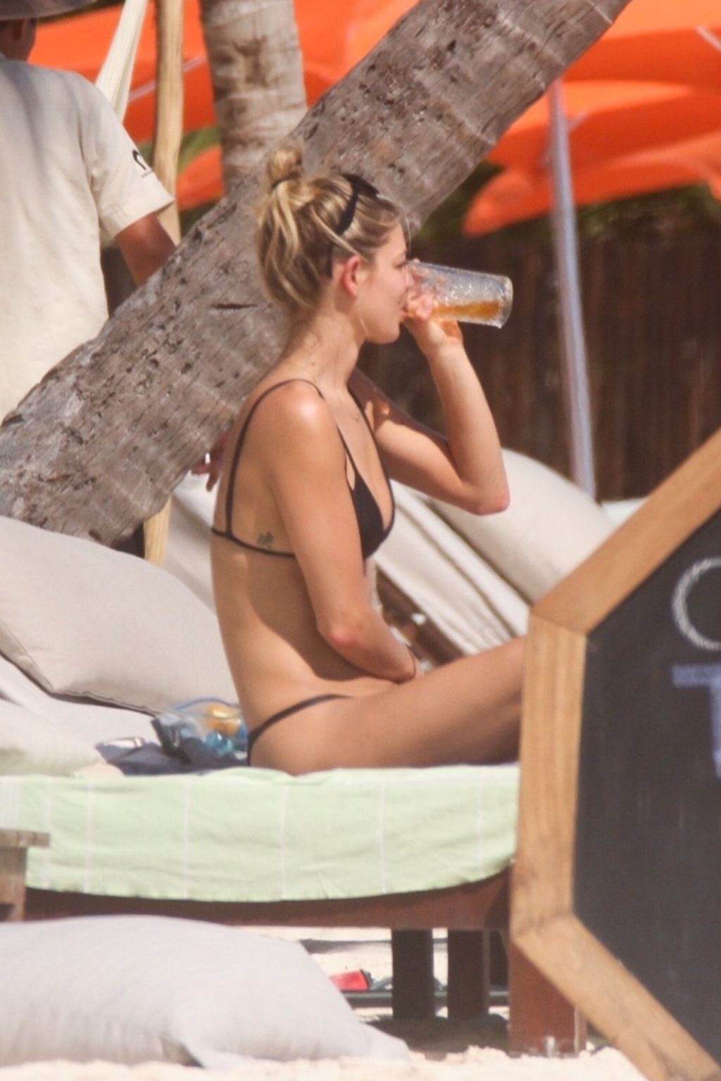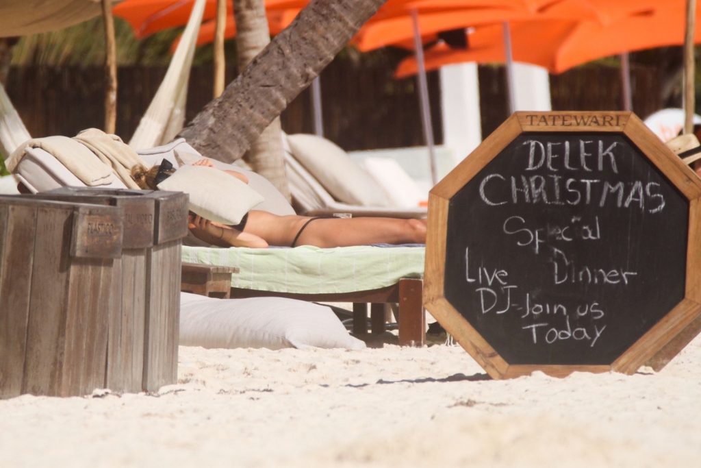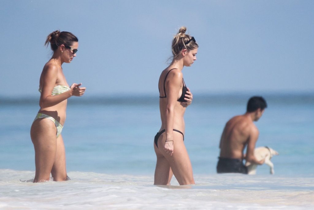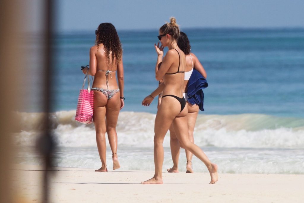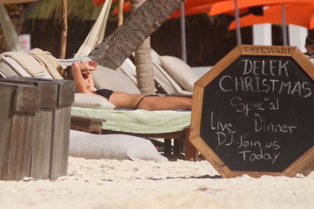Danielle Knudson deslumbra con un bikini tanga negro para celebrar una Navidad tropical en Tulum, 25/12/2019. La modelo canadiense y novia del tenista canadiense Milos Raonic se lanzó a las olas con amigos para refrescarse bajo el sol caliente.