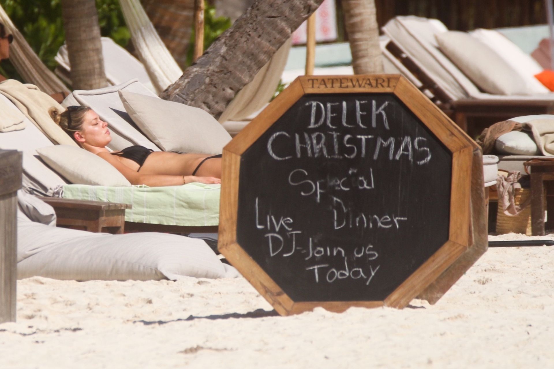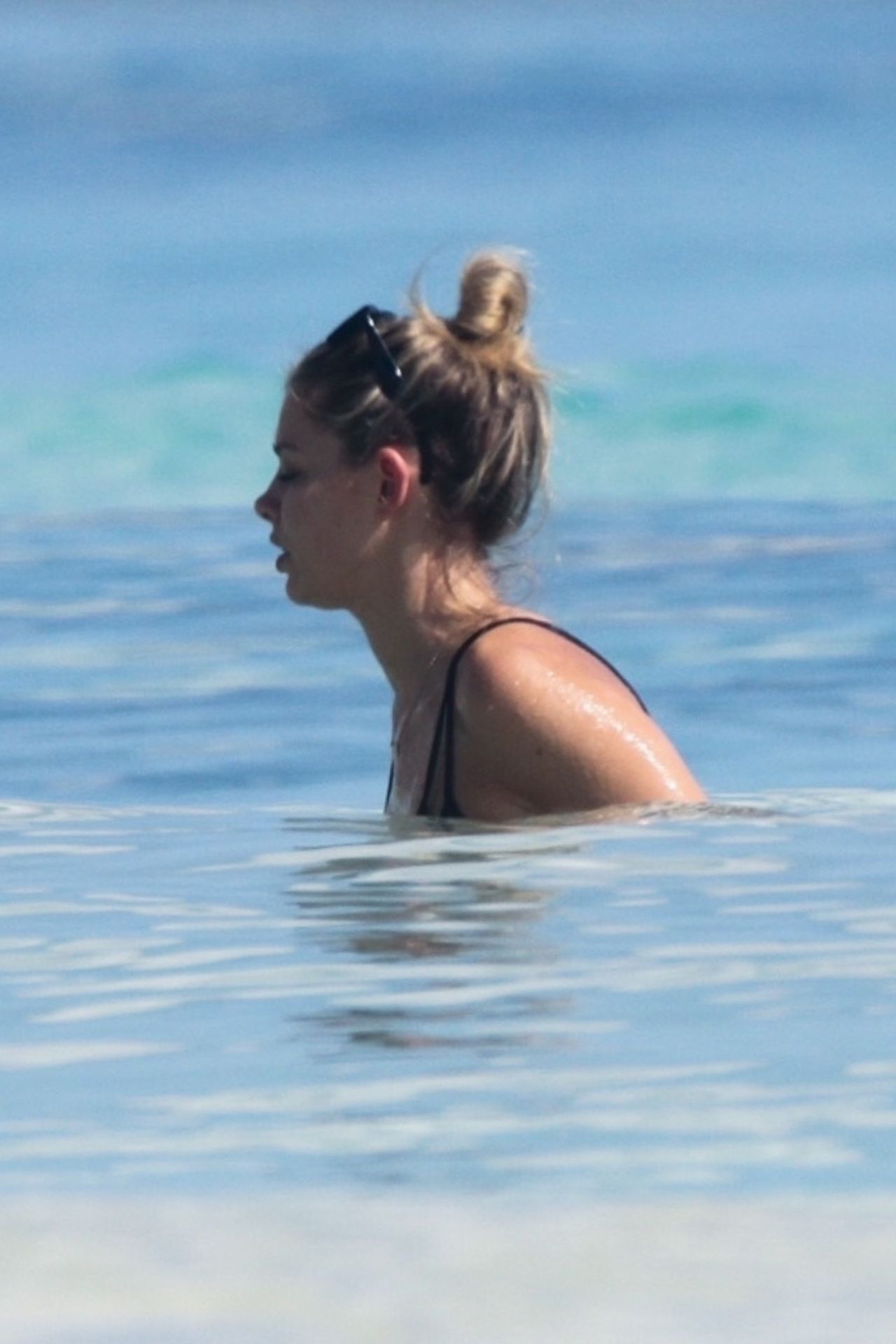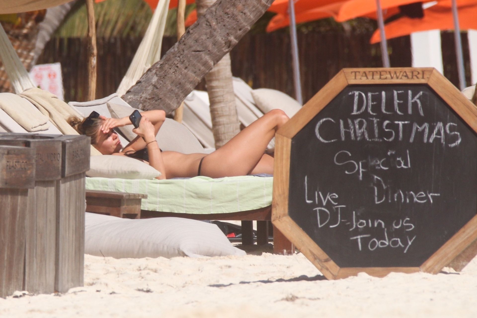 Danielle Knudson deslumbra con un bikini tanga negro para celebrar una Navidad tropical en Tulum, 25/12/2019. La modelo canadiense y novia del tenista canadiense Milos Raonic se lanzó a las olas con amigos para refrescarse bajo el sol caliente.