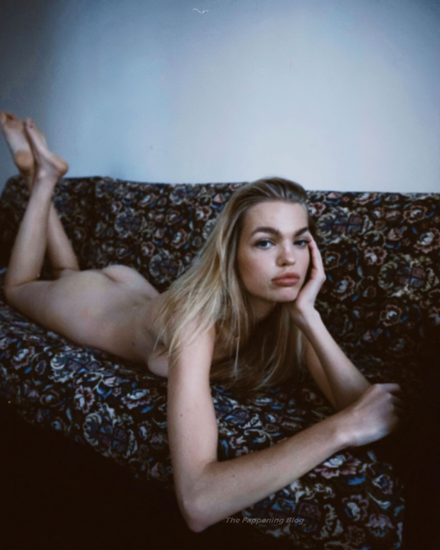 La modelo holandesa Daphne Groeneveld posa completamente desnuda en un sofá, mostrando sus pechos desnudos (censurados) y trasero en una nueva sesión de fotos de Kat Irlin (2021).