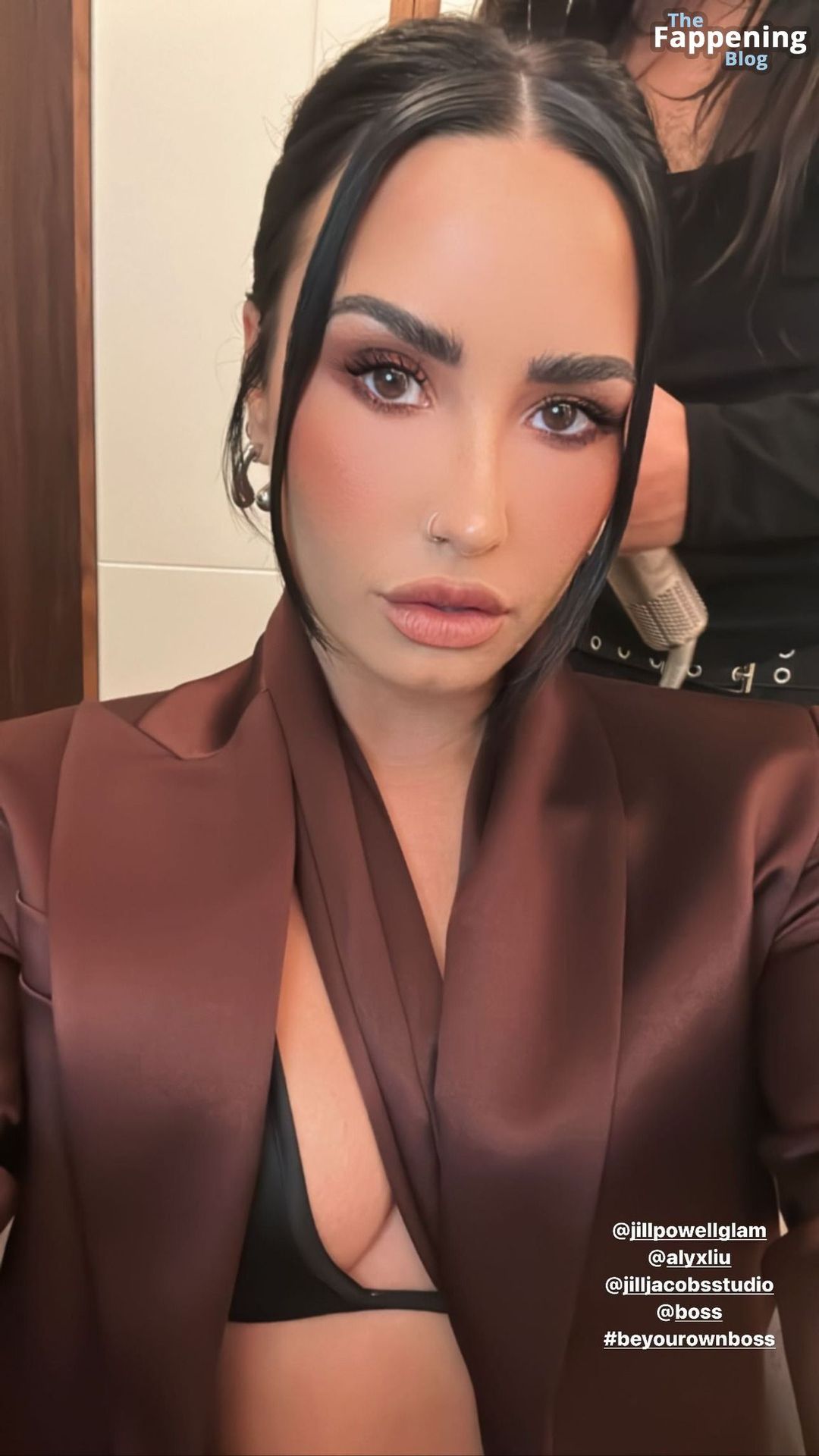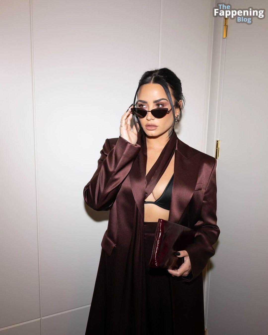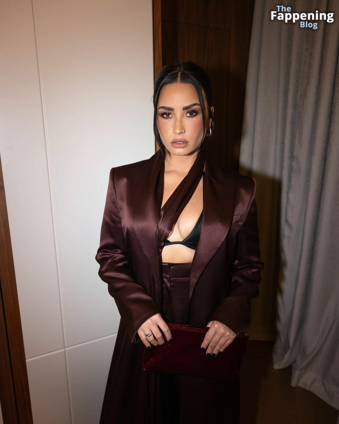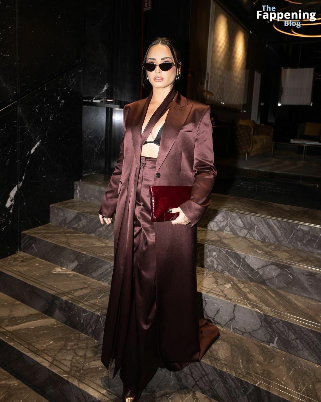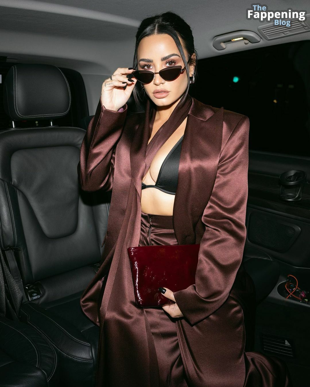 Demi Lovato luce un escote impresionante, mostrando sus naturales pechos en un sexy sostén negro y chaqueta abierta mientras sale.