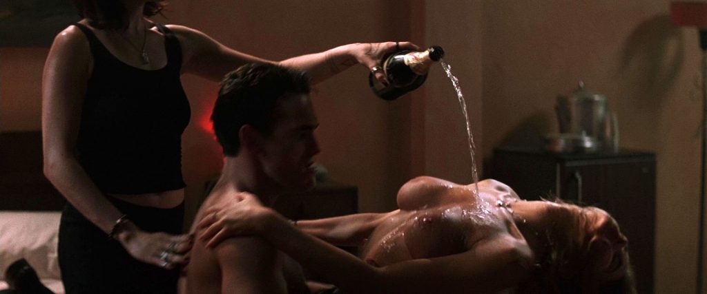Esa escena de trío fue la base de toda la película, y los pechos de plástico de Denise Richard fueron el centro de esa escena. Qué pena que todo dependiera de un par de tetas tan falsas. No se nota mucho en estas capturas, pero mira la película y verás que parecen dos bolsas llenas de serpientes.
