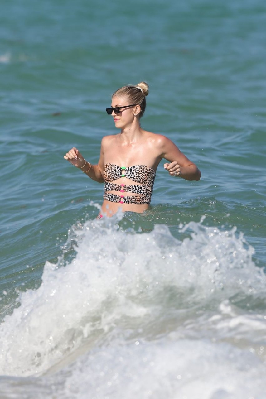 La hermosa modelo de Victoria’s Secret llevó el cabello recogido en un moño y lució su figura con un diseño de estampado de leopardo con hebillas neón. Gabby, que acababa de llegar de un vuelo, llevaba un bikini negro sencillo.