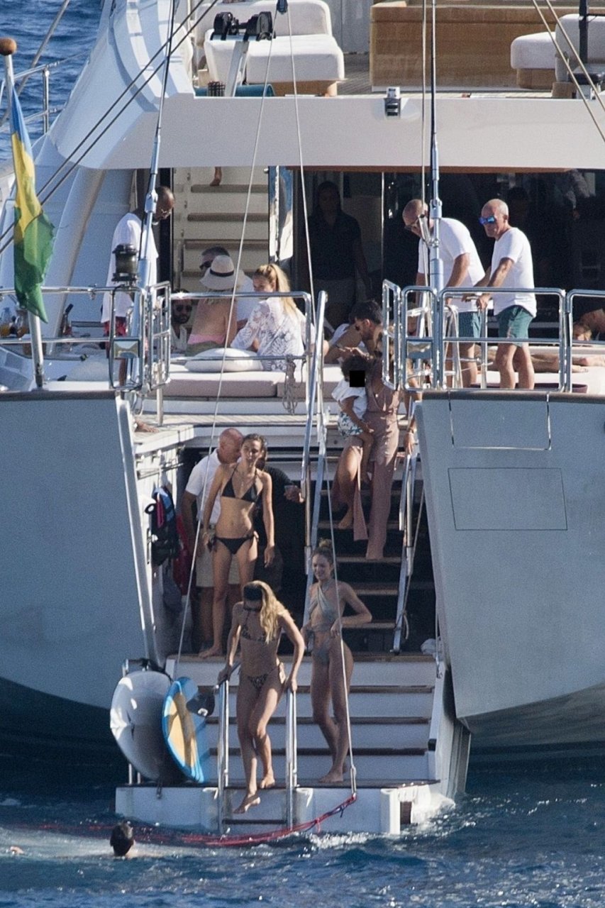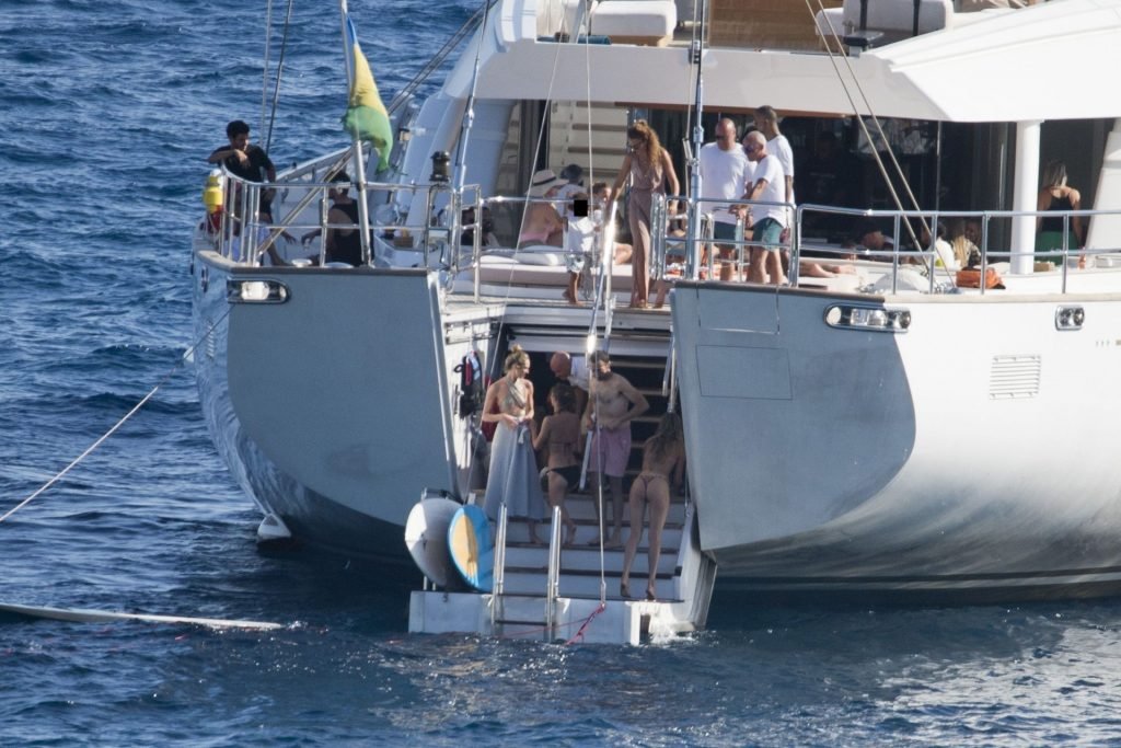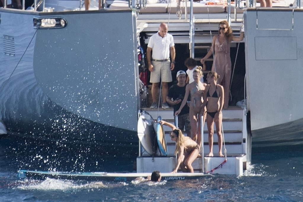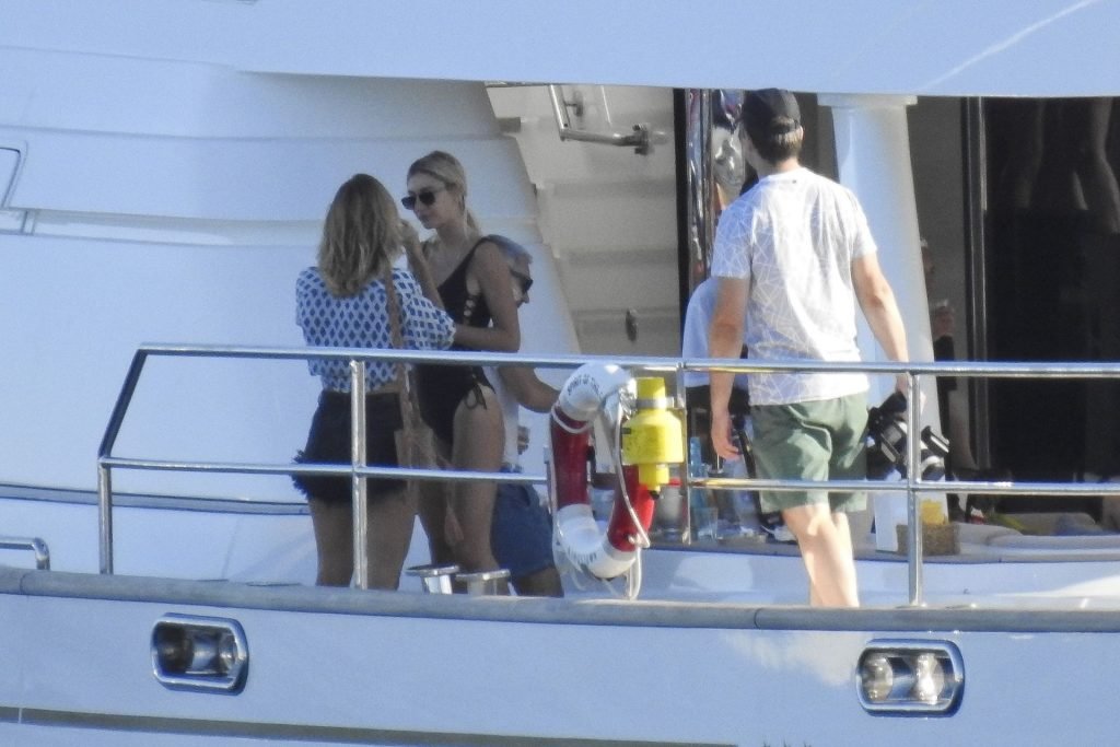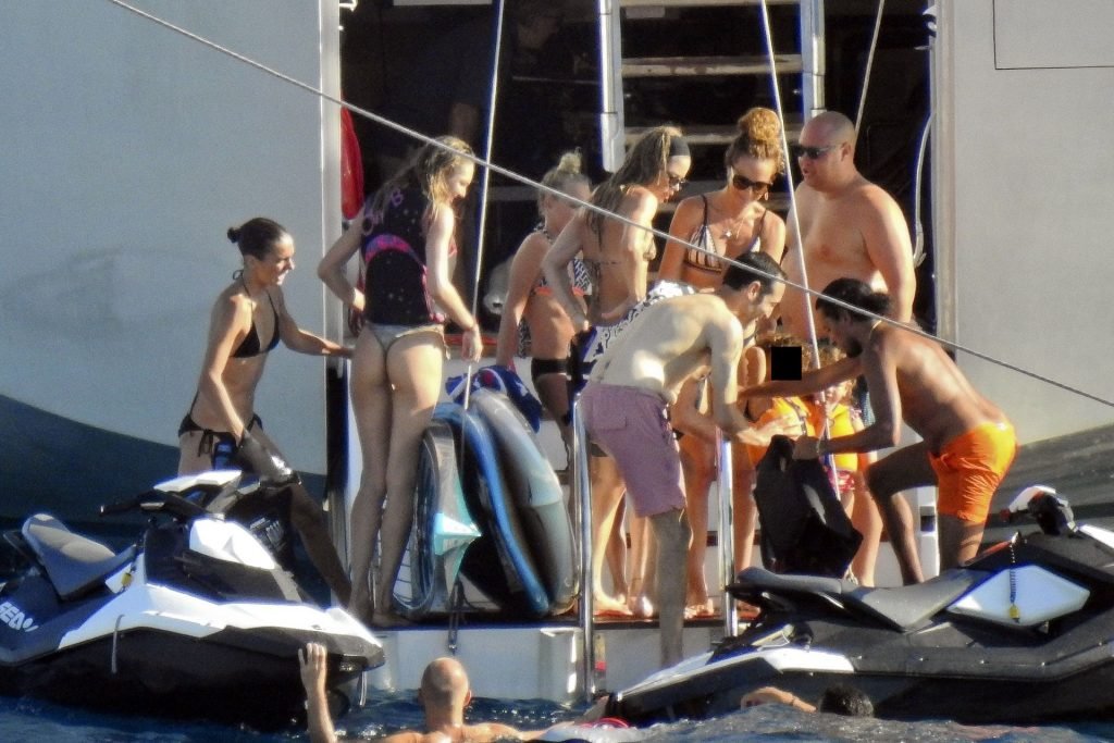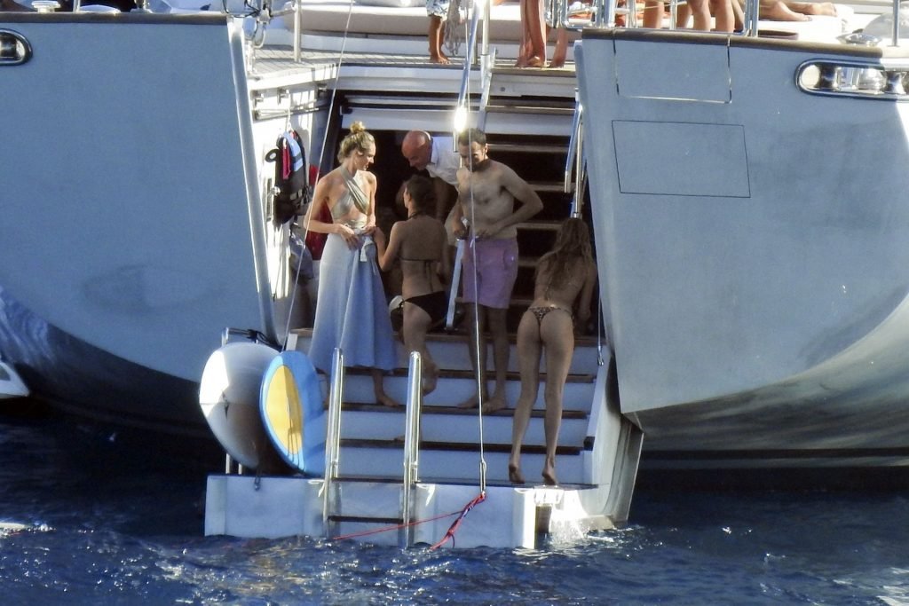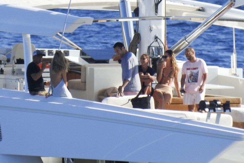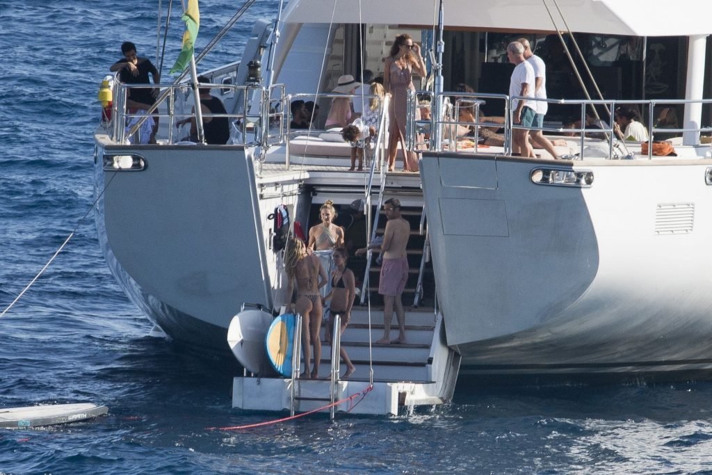 DJs Sunnery James y Ryan Marciano, el actor Glenn Powell y las supermodelos Doutzen Kroes, Candice Swanepoel, Joan Smalls comienzan la fiesta a bordo de una embarcación de lujo en Ibiza, 14/08/2019. También a bordo están el productor de cine Mohamed al Turki y el socialité Richie Akiva.