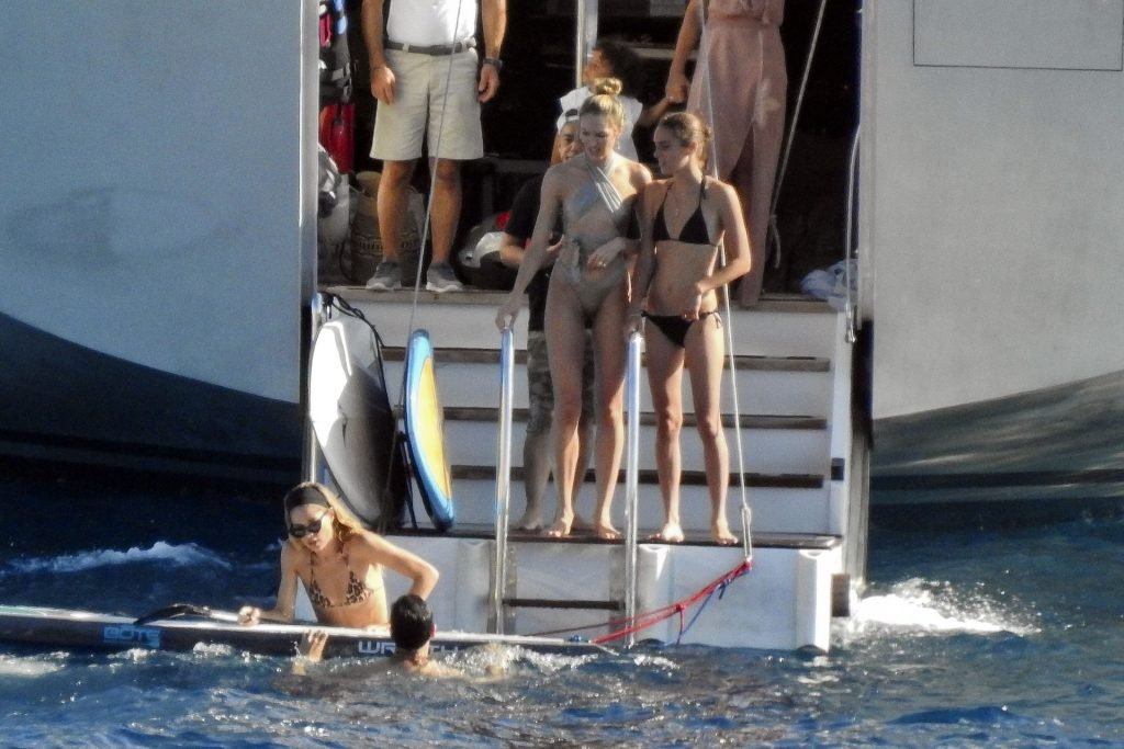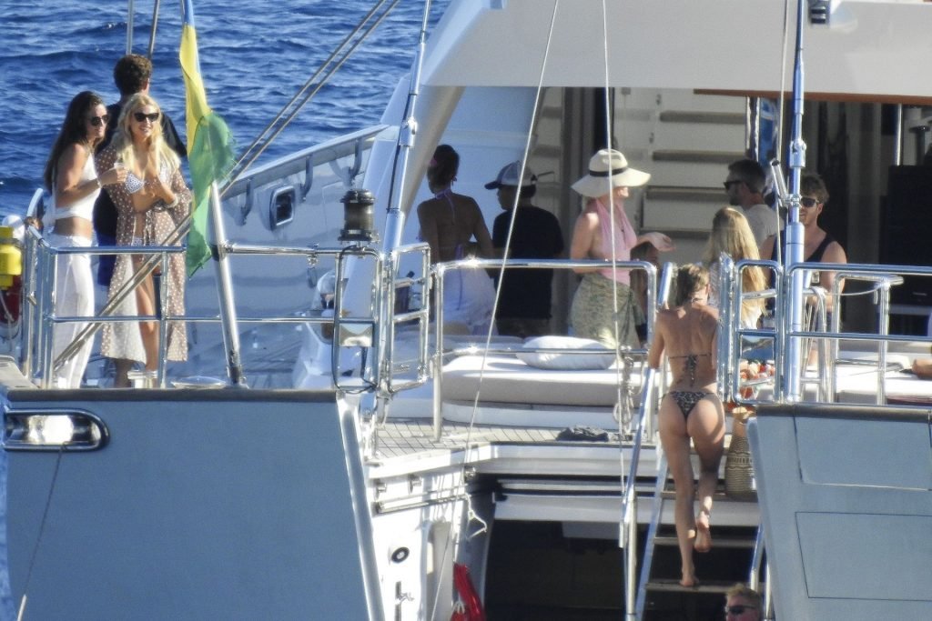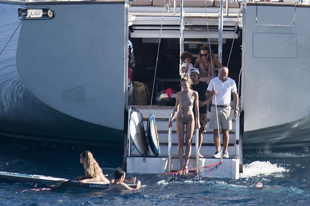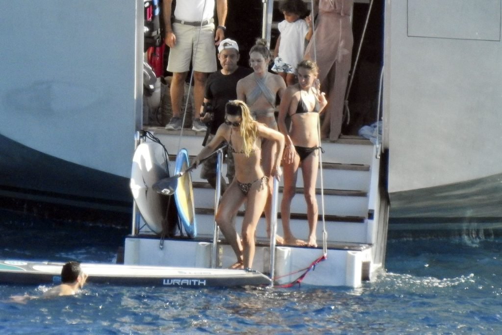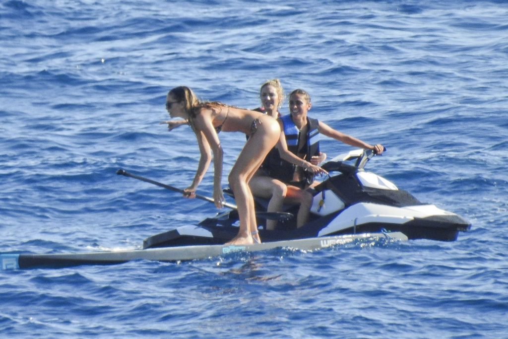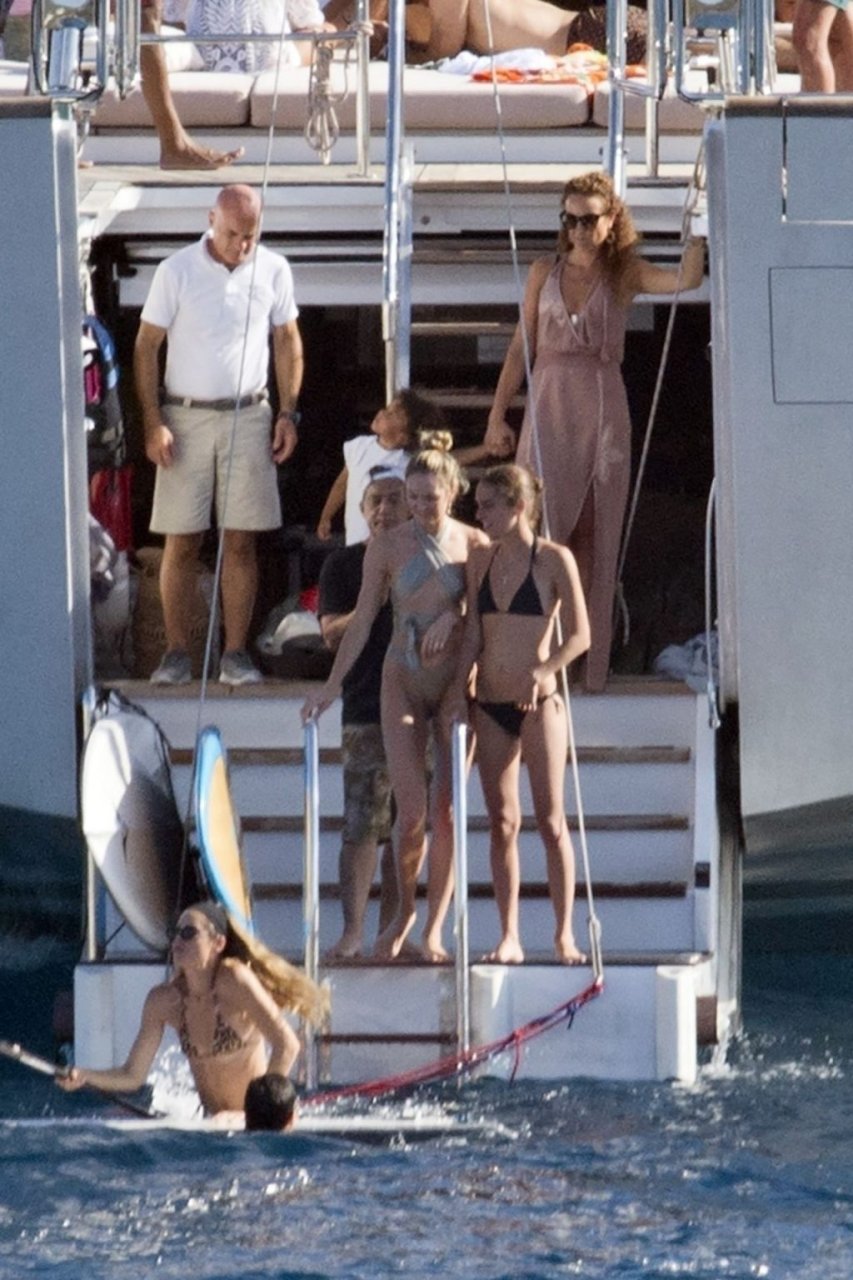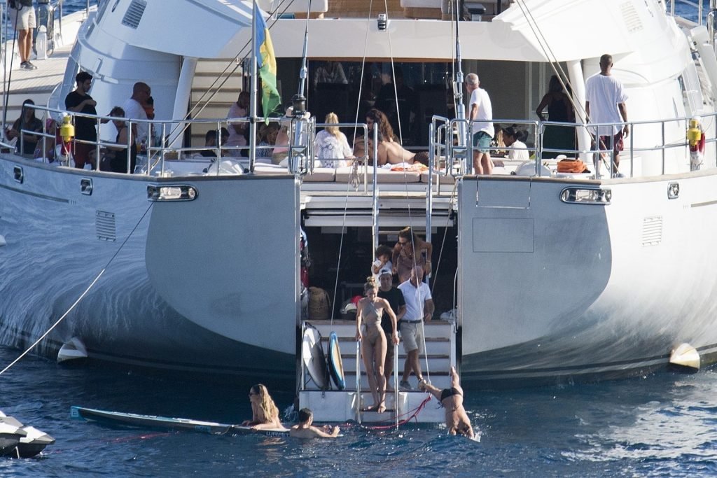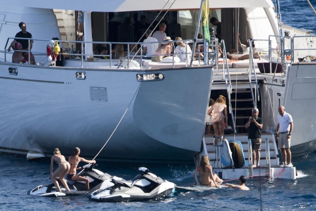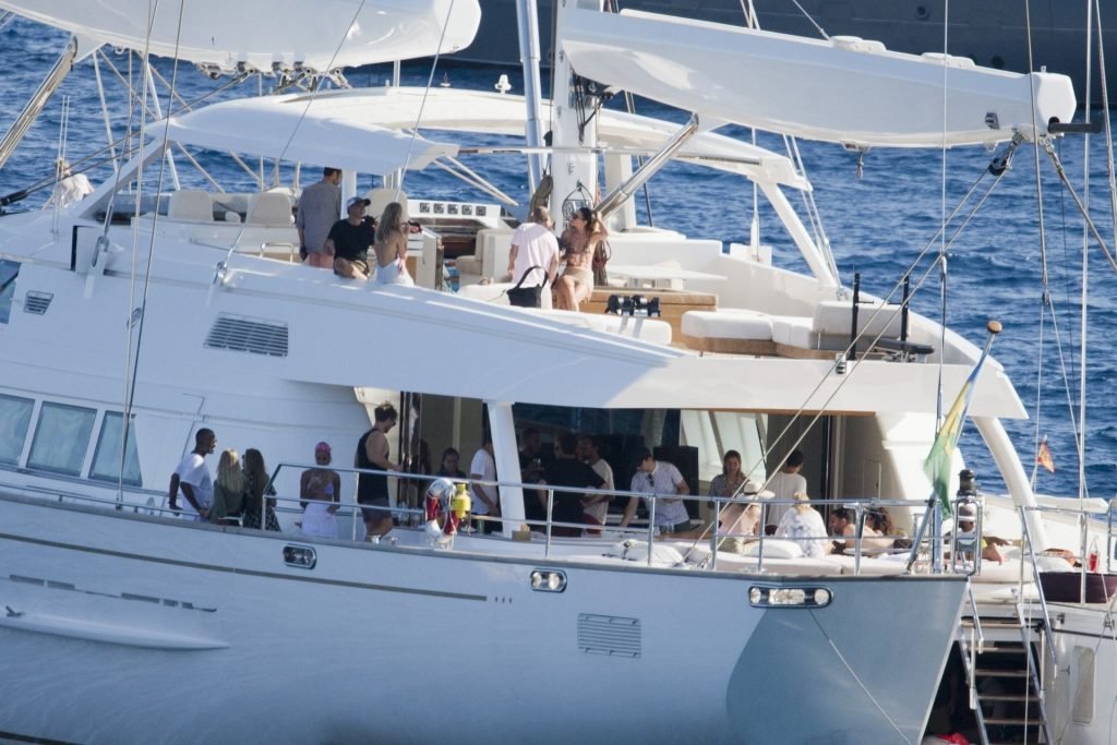DJs Sunnery James y Ryan Marciano, el actor Glenn Powell y las supermodelos Doutzen Kroes, Candice Swanepoel, Joan Smalls comienzan la fiesta a bordo de una embarcación de lujo en Ibiza, 14/08/2019. También a bordo están el productor de cine Mohamed al Turki y el socialité Richie Akiva.