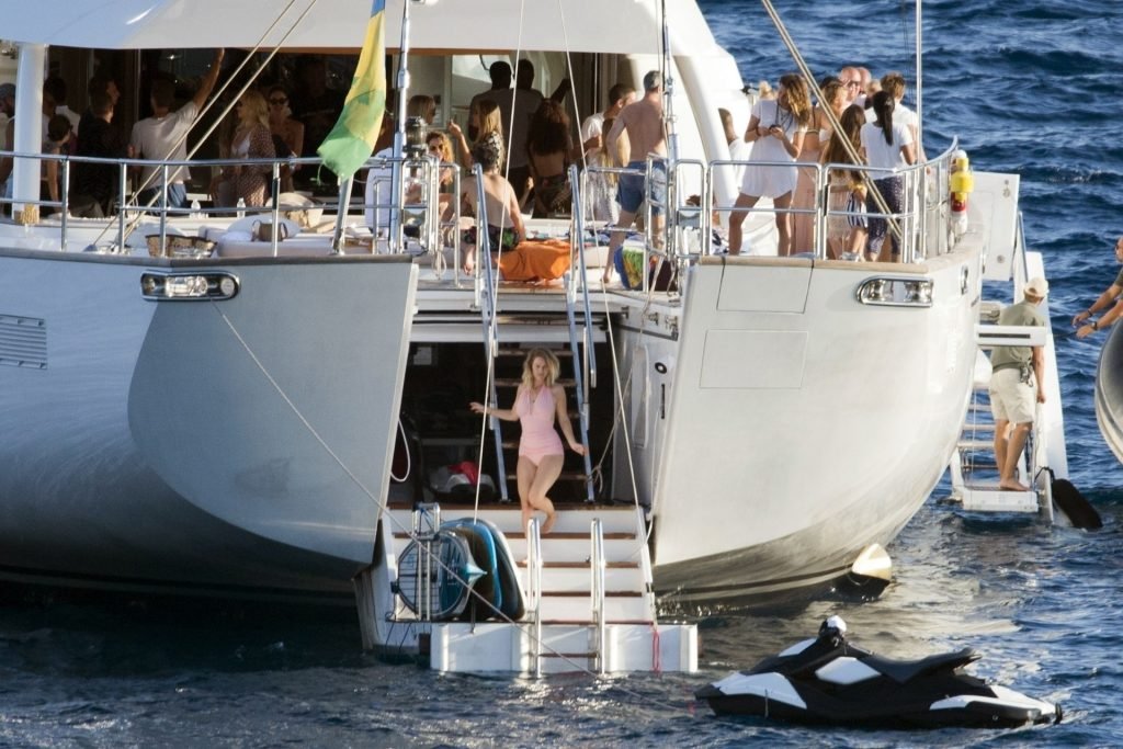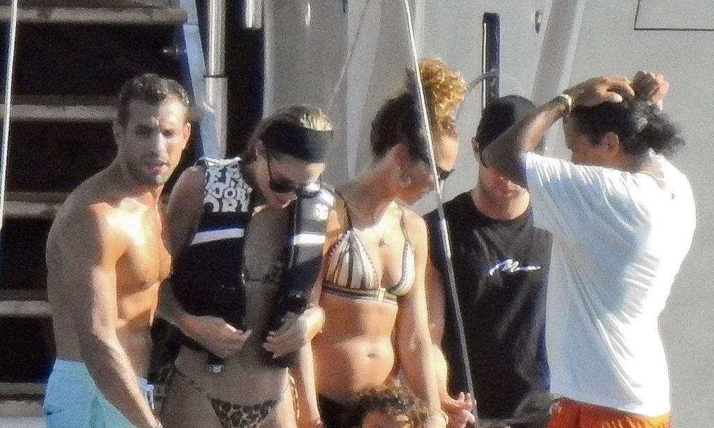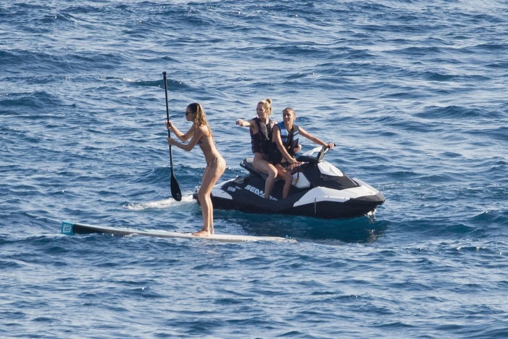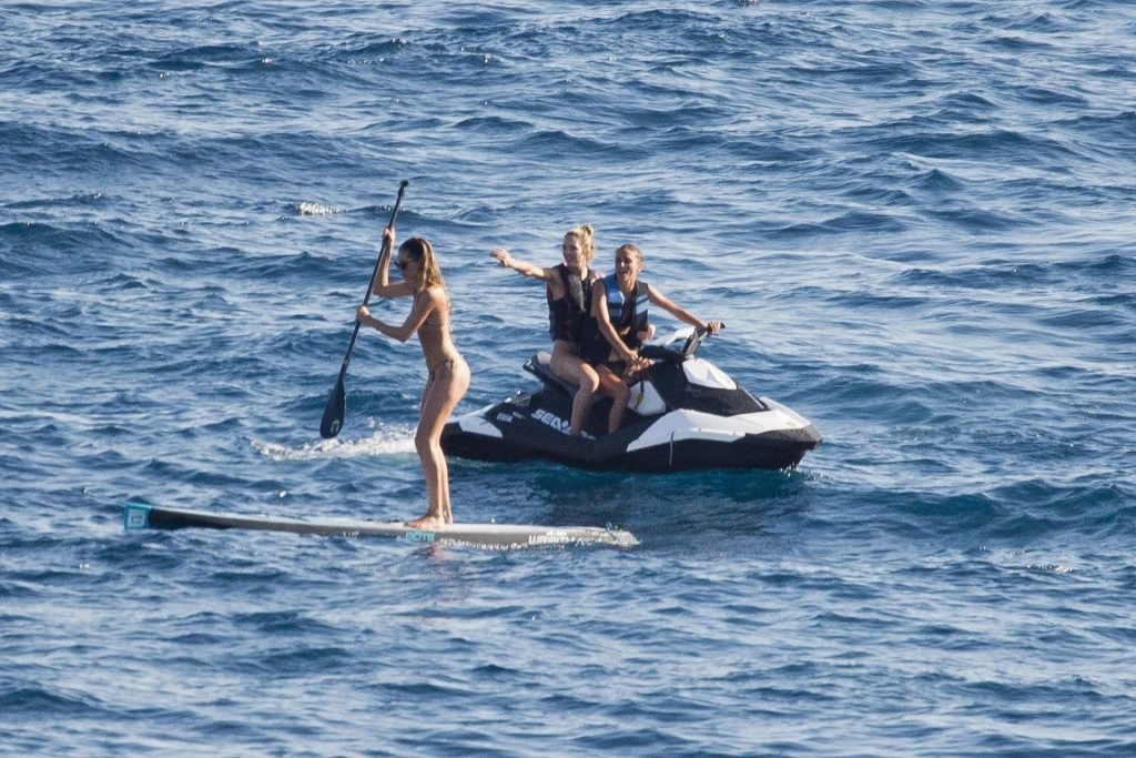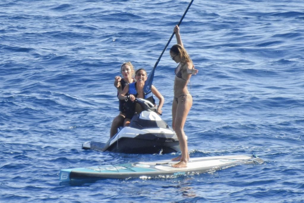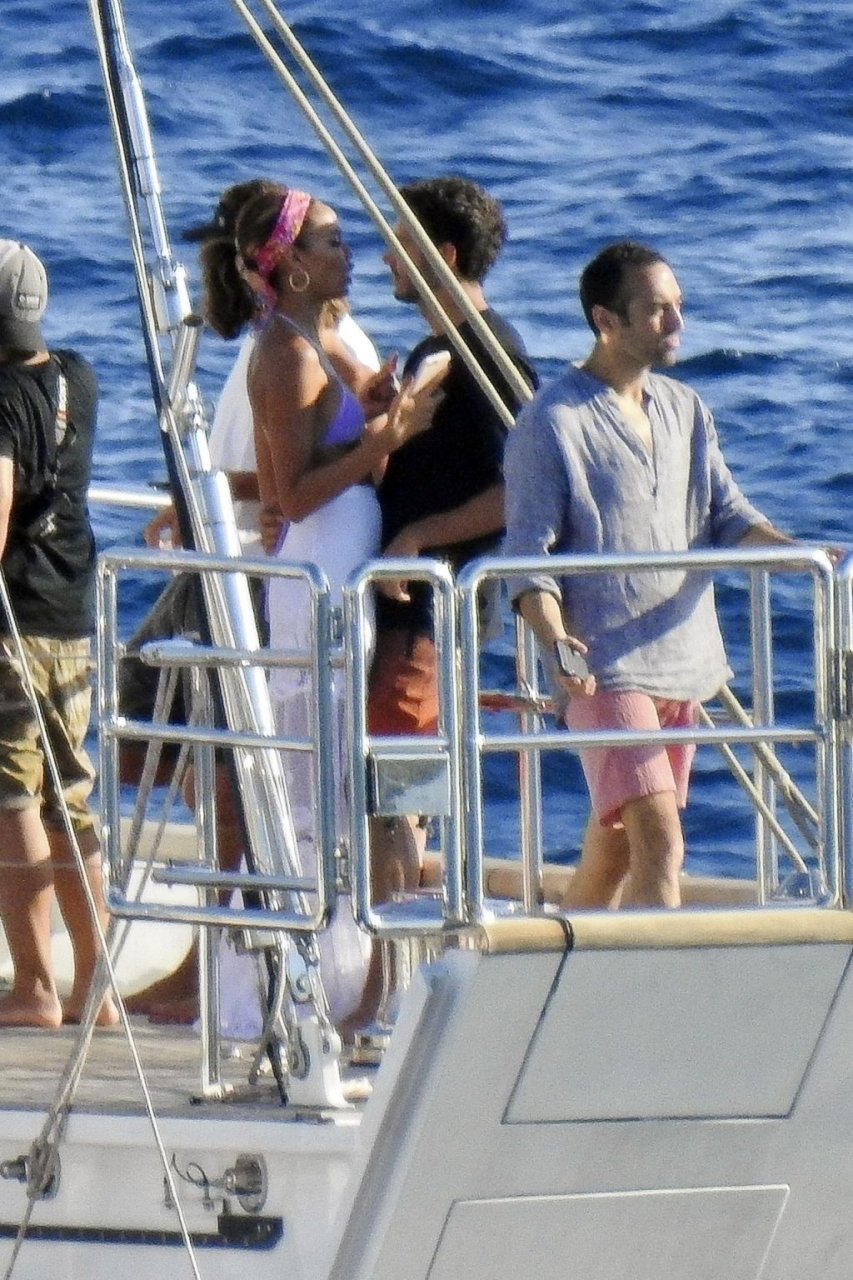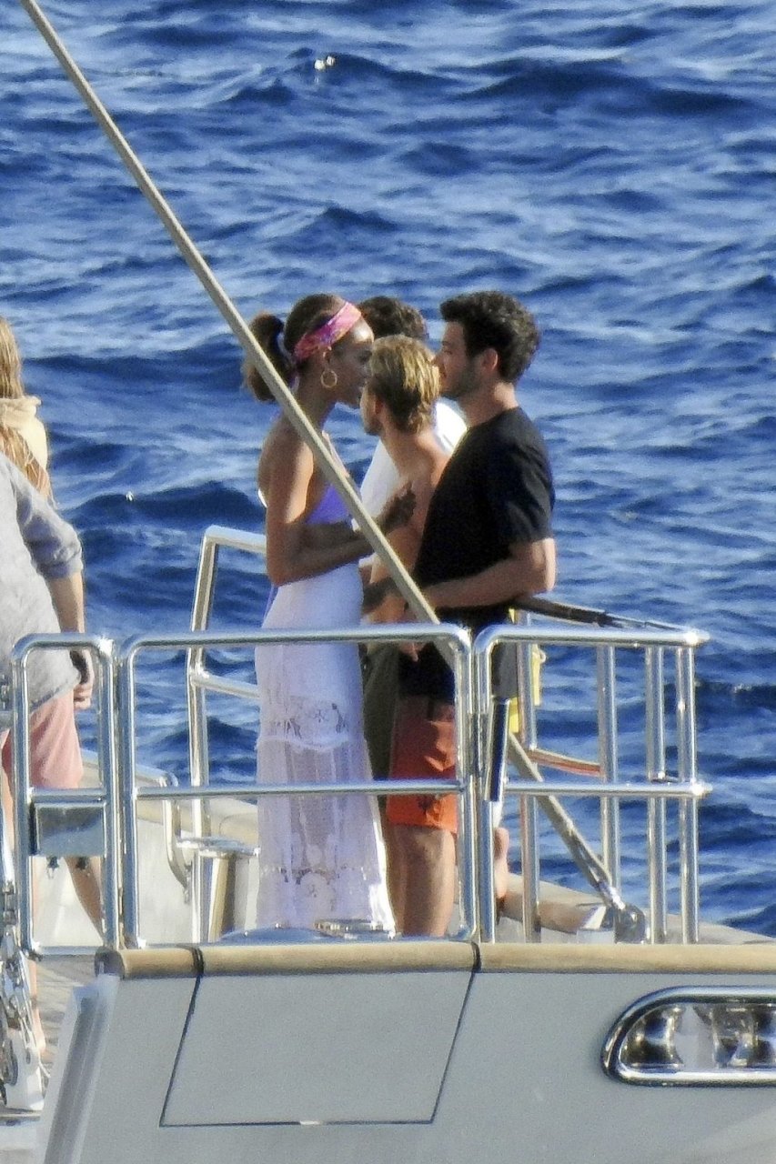 DJs Sunnery James y Ryan Marciano, el actor Glenn Powell y las supermodelos Doutzen Kroes, Candice Swanepoel, Joan Smalls comienzan la fiesta a bordo de una embarcación de lujo en Ibiza, 14/08/2019. También a bordo están el productor de cine Mohamed al Turki y el socialité Richie Akiva.