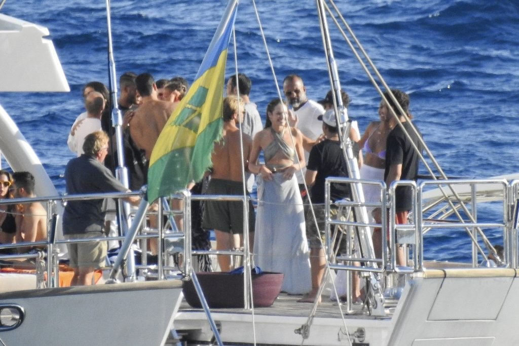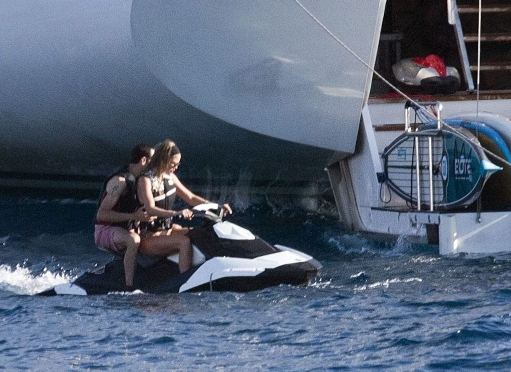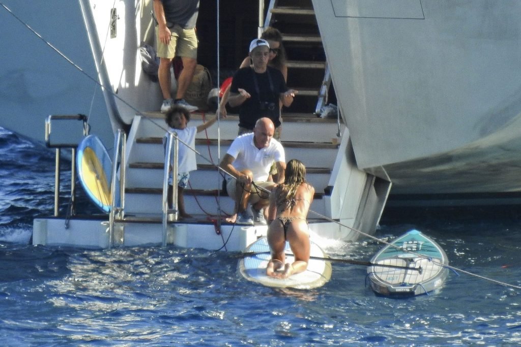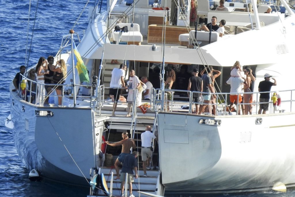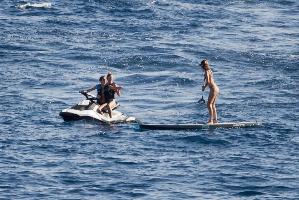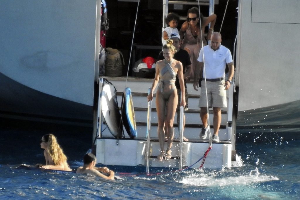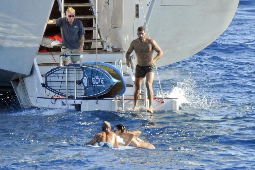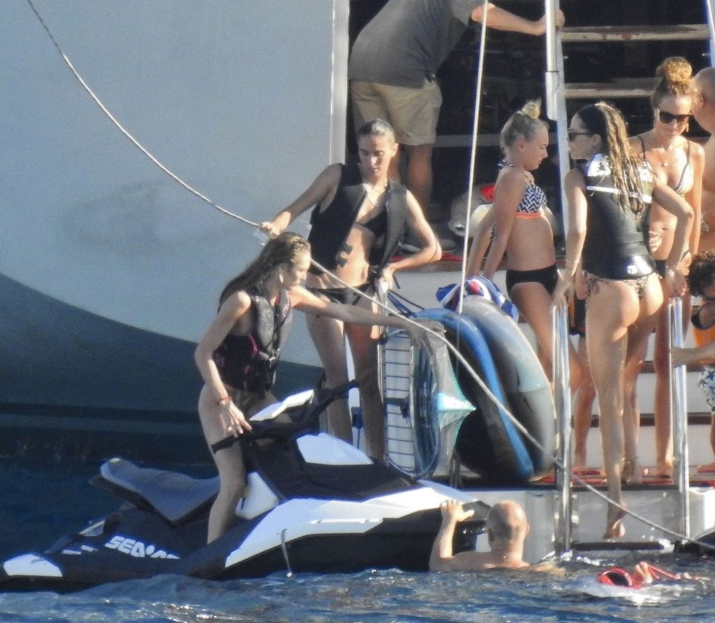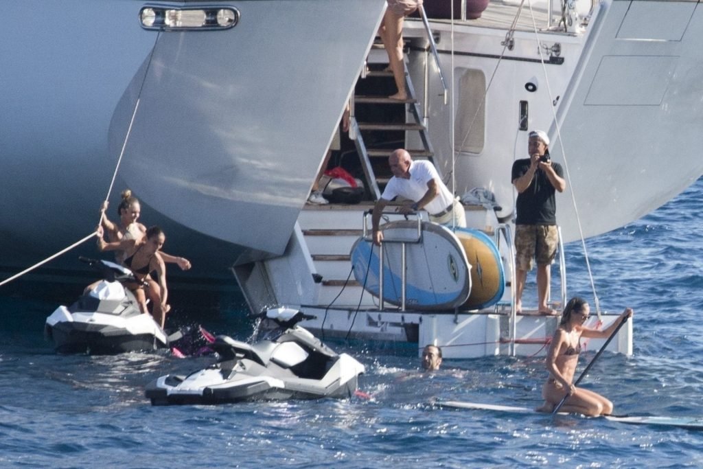 DJs Sunnery James y Ryan Marciano, el actor Glenn Powell y las supermodelos Doutzen Kroes, Candice Swanepoel, Joan Smalls comienzan la fiesta a bordo de una embarcación de lujo en Ibiza, 14/08/2019. También a bordo están el productor de cine Mohamed al Turki y el socialité Richie Akiva.