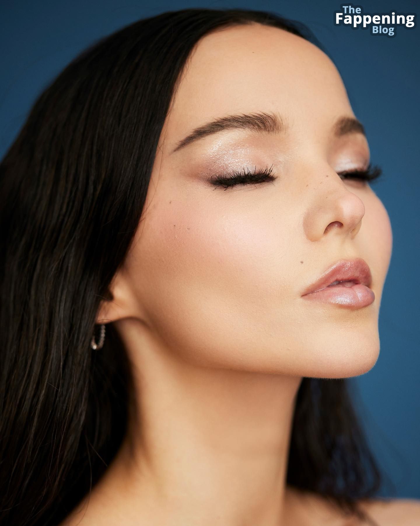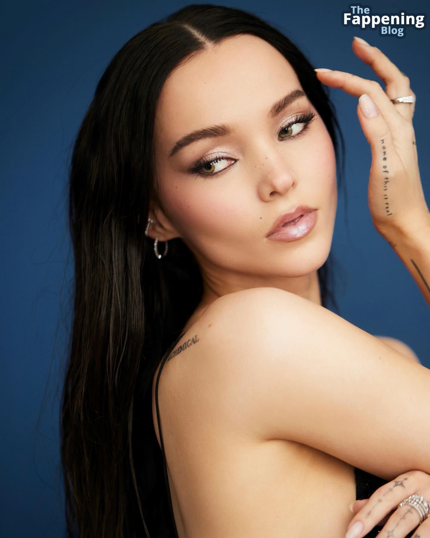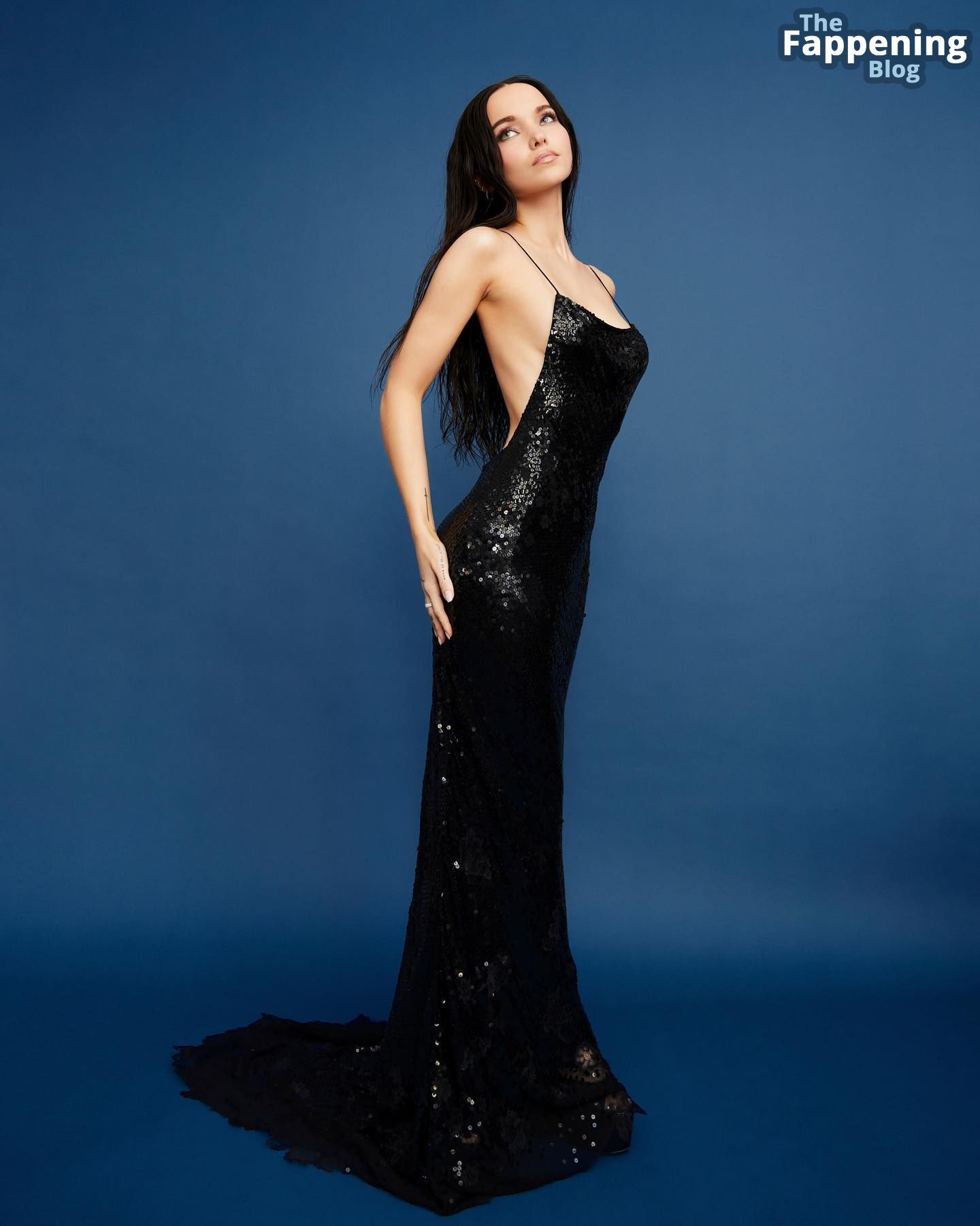 Dove Cameron está arrasando con un escote impresionante y grandes pechos a la vista en un sexy vestido negro sin espalda para una sesión de fotos en los MTV Video Music Awards.