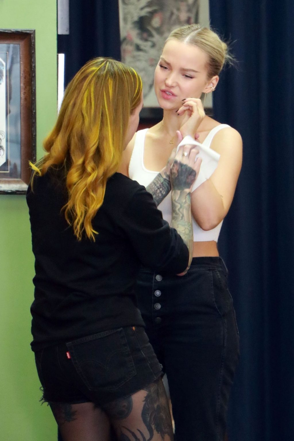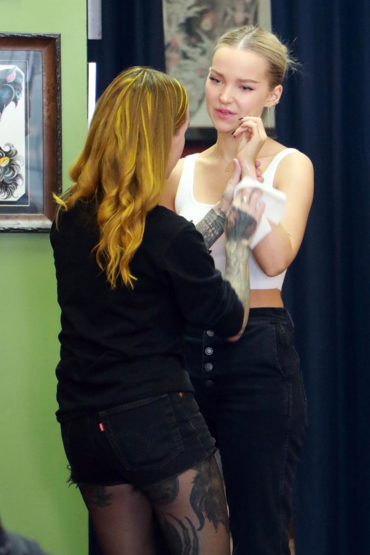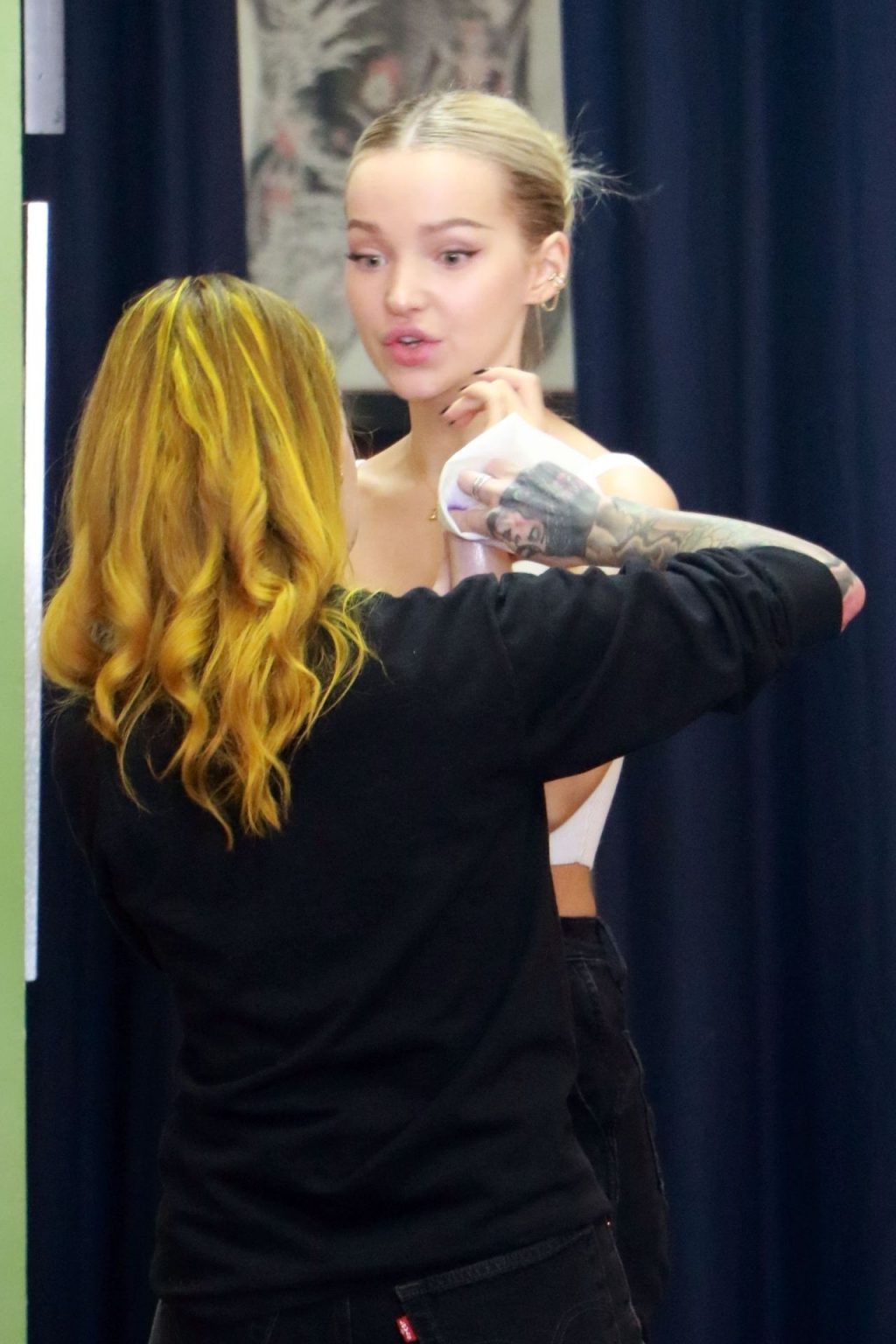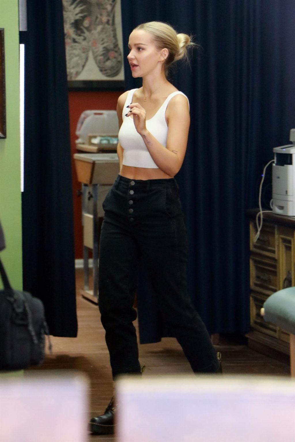 Dove Cameron muestra su figura en forma con un top corto blanco mientras se prepara para un nuevo tatuaje y filma una escena en un estudio de tatuajes local el jueves.
