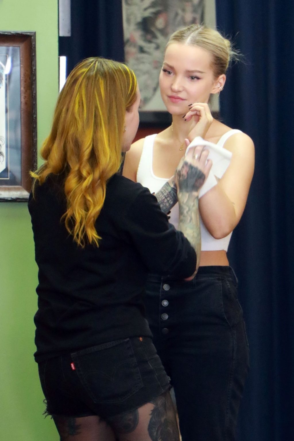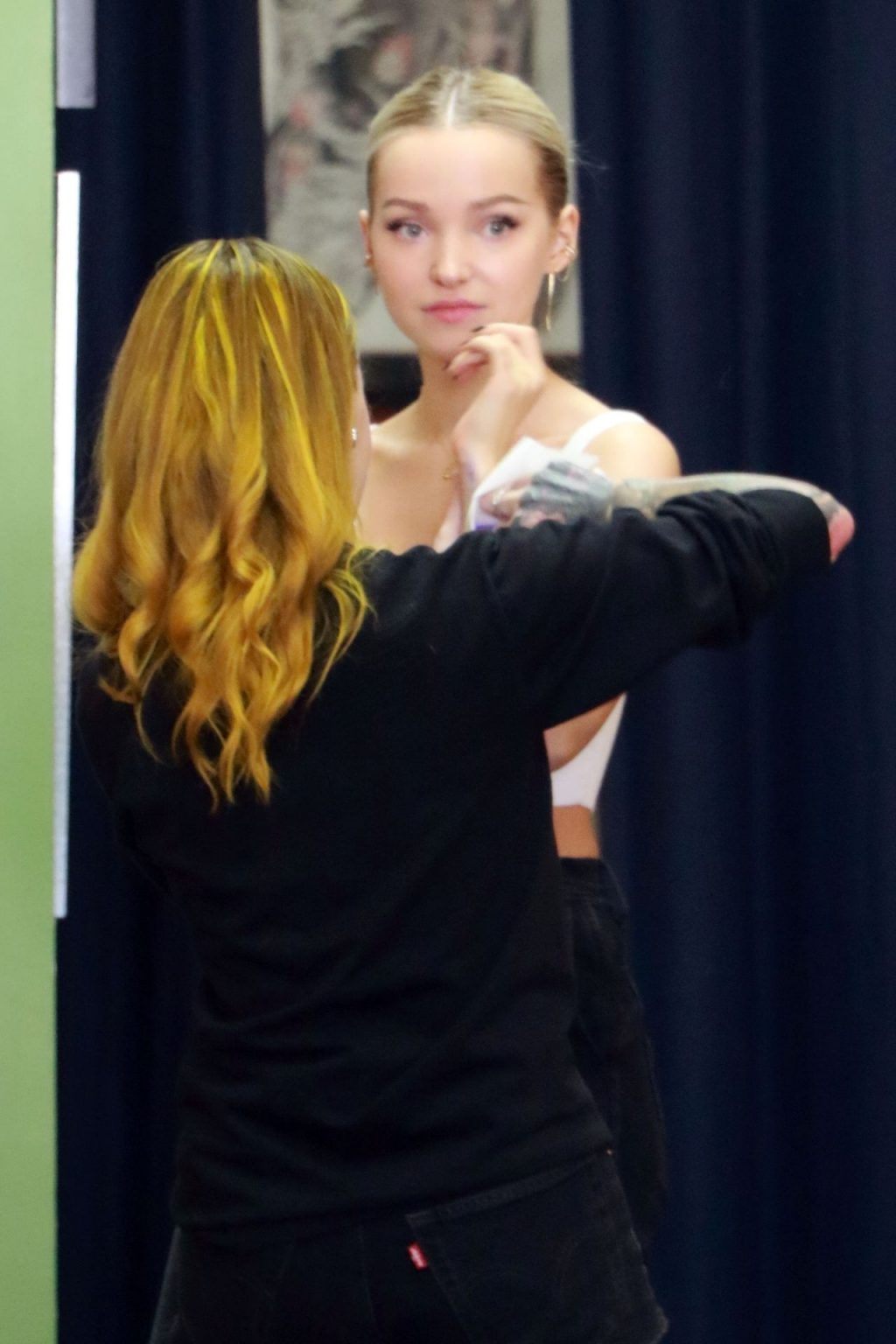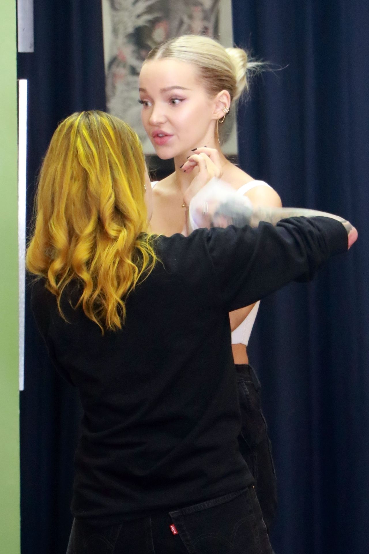 Dove Cameron muestra su figura en forma con un top corto blanco mientras se prepara para un nuevo tatuaje y filma una escena en un estudio de tatuajes local el jueves.