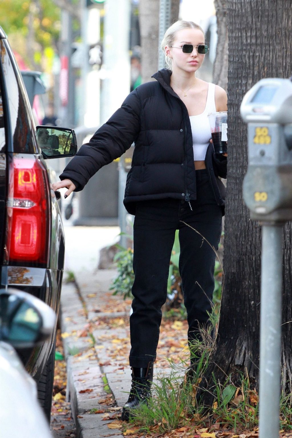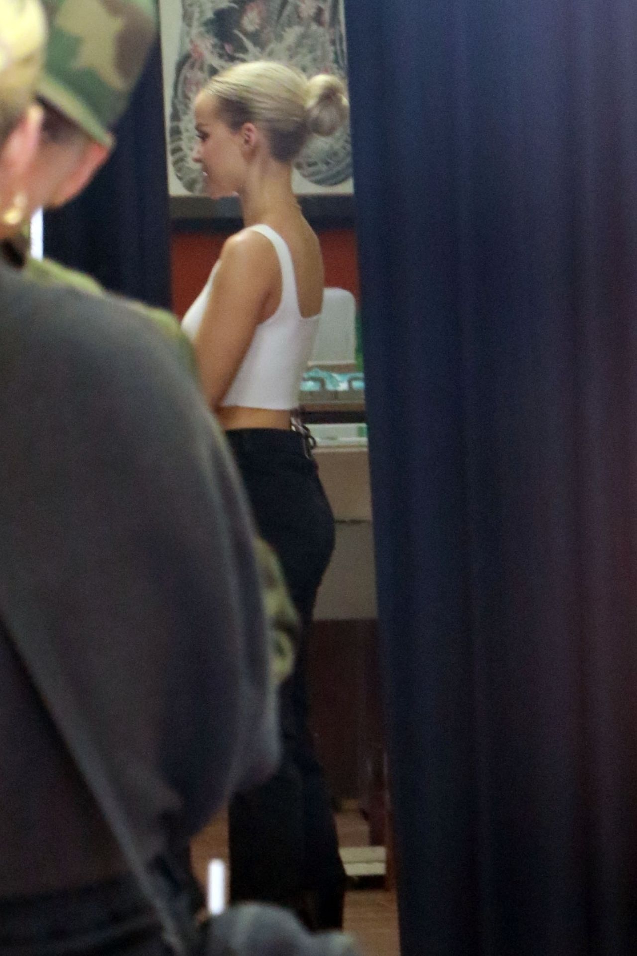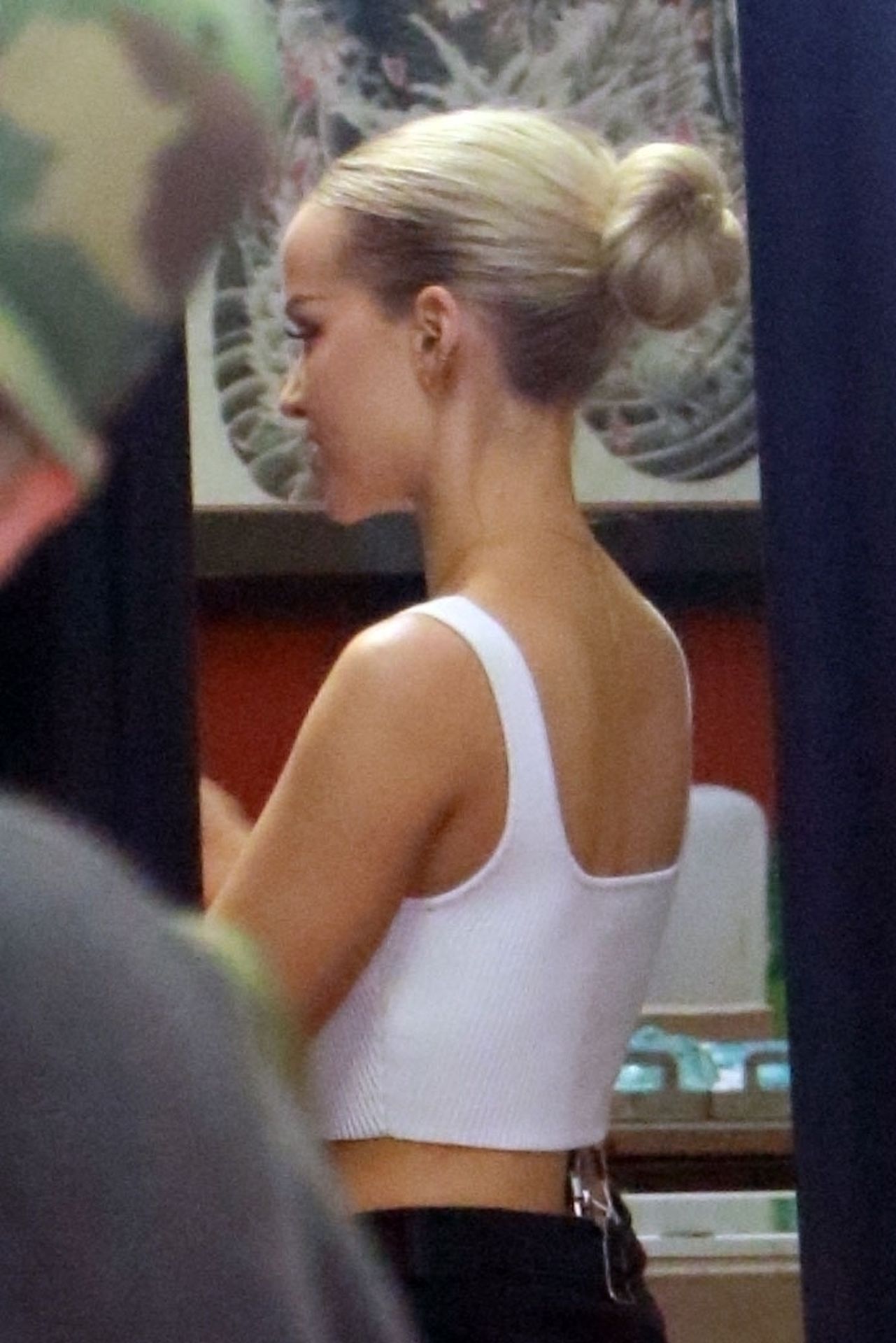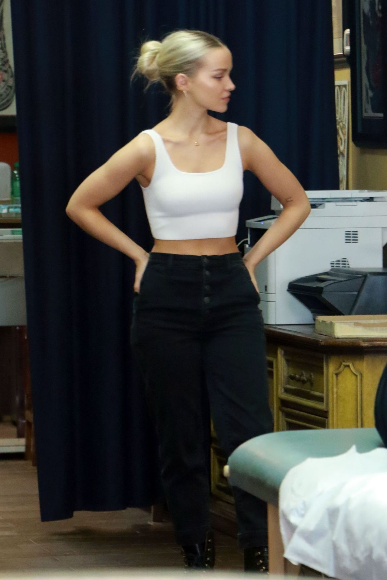 Dove Cameron muestra su figura en forma con un top corto blanco mientras se prepara para un nuevo tatuaje y filma una escena en un estudio de tatuajes local el jueves.