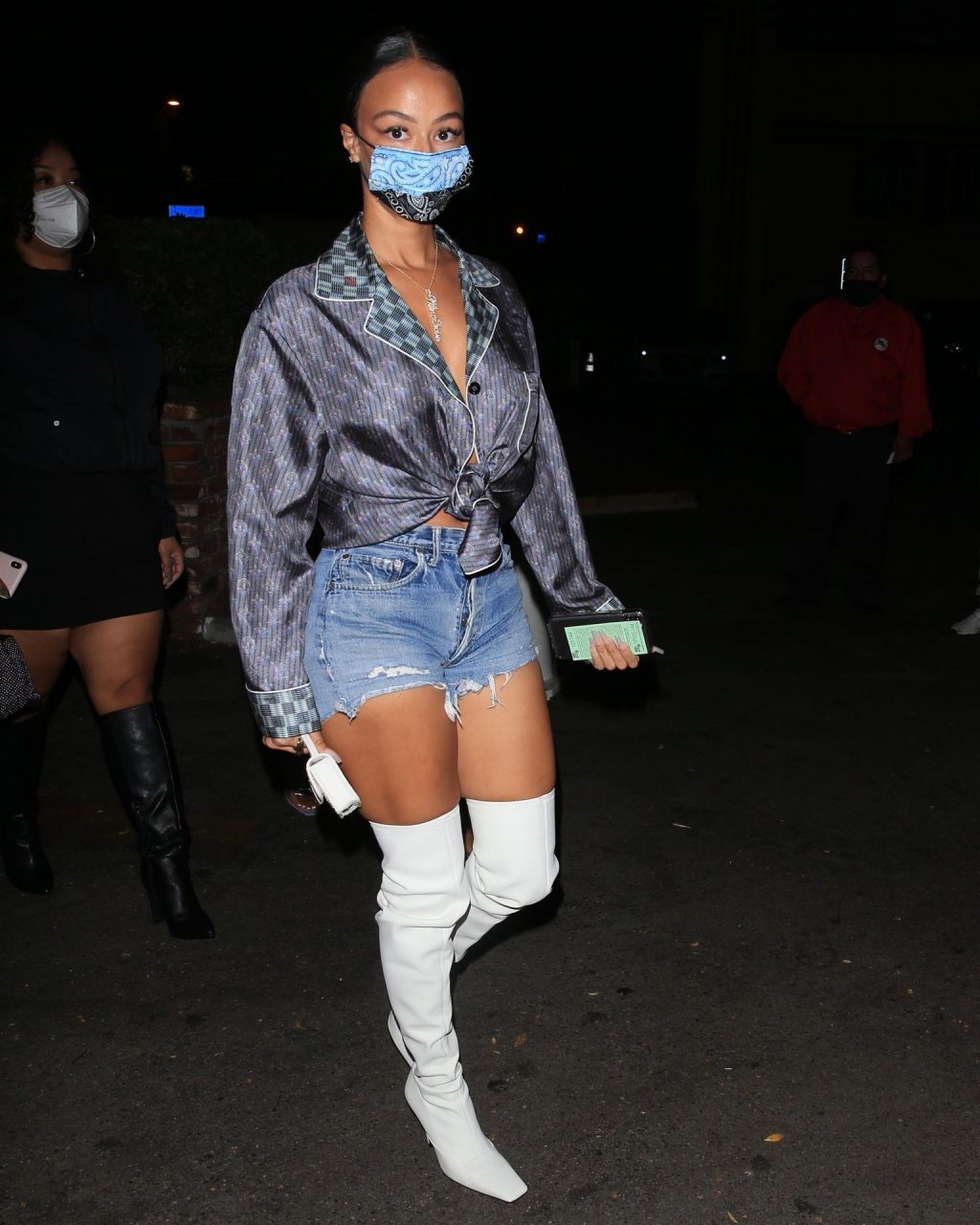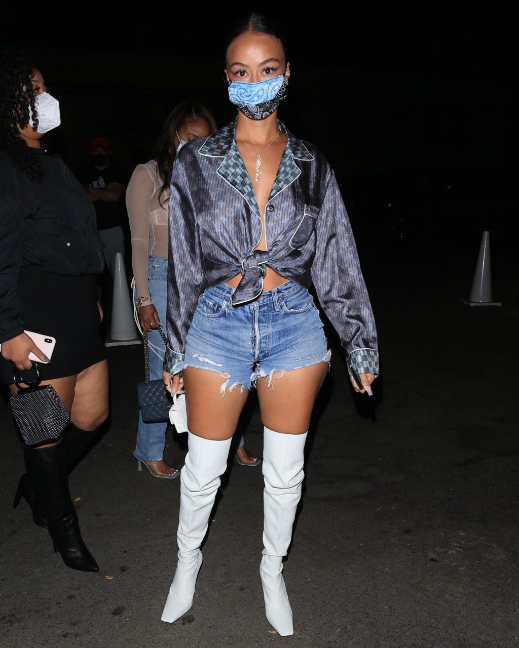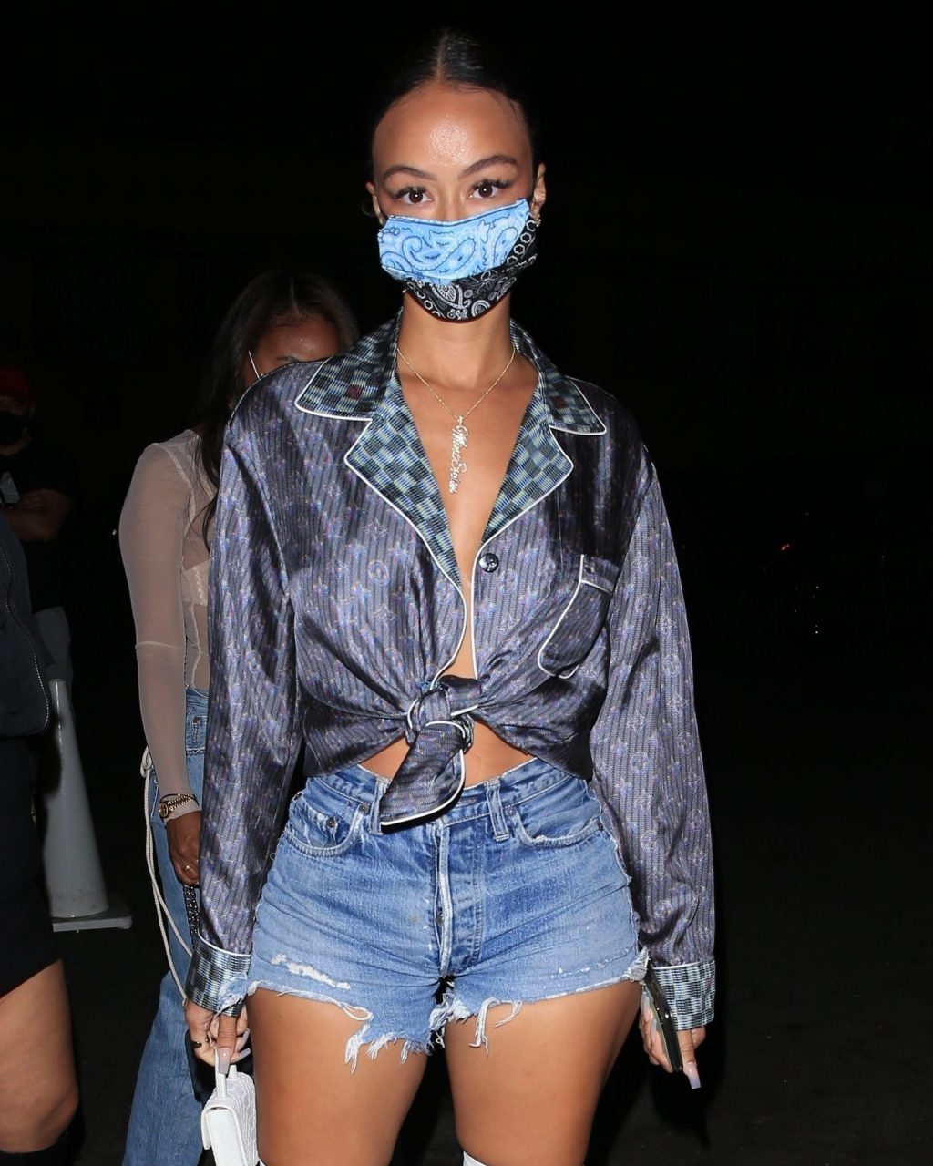 Draya llevaba una blusa de Louis Vuitton con shorts de mezclilla, botas blancas hasta la rodilla y una mascarilla facial con diseño de bandana.