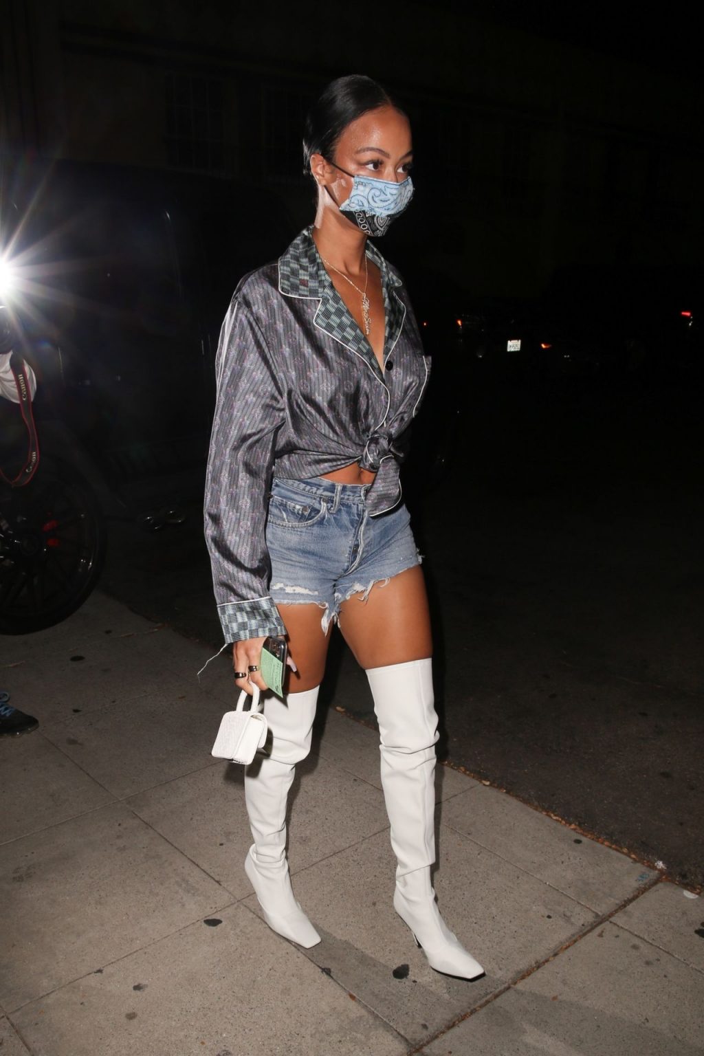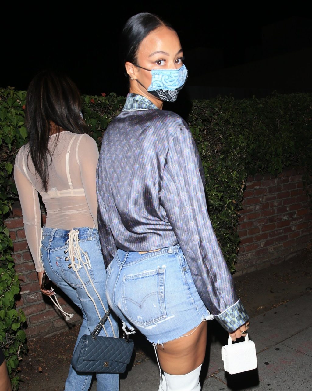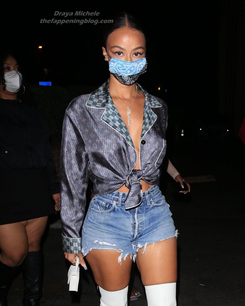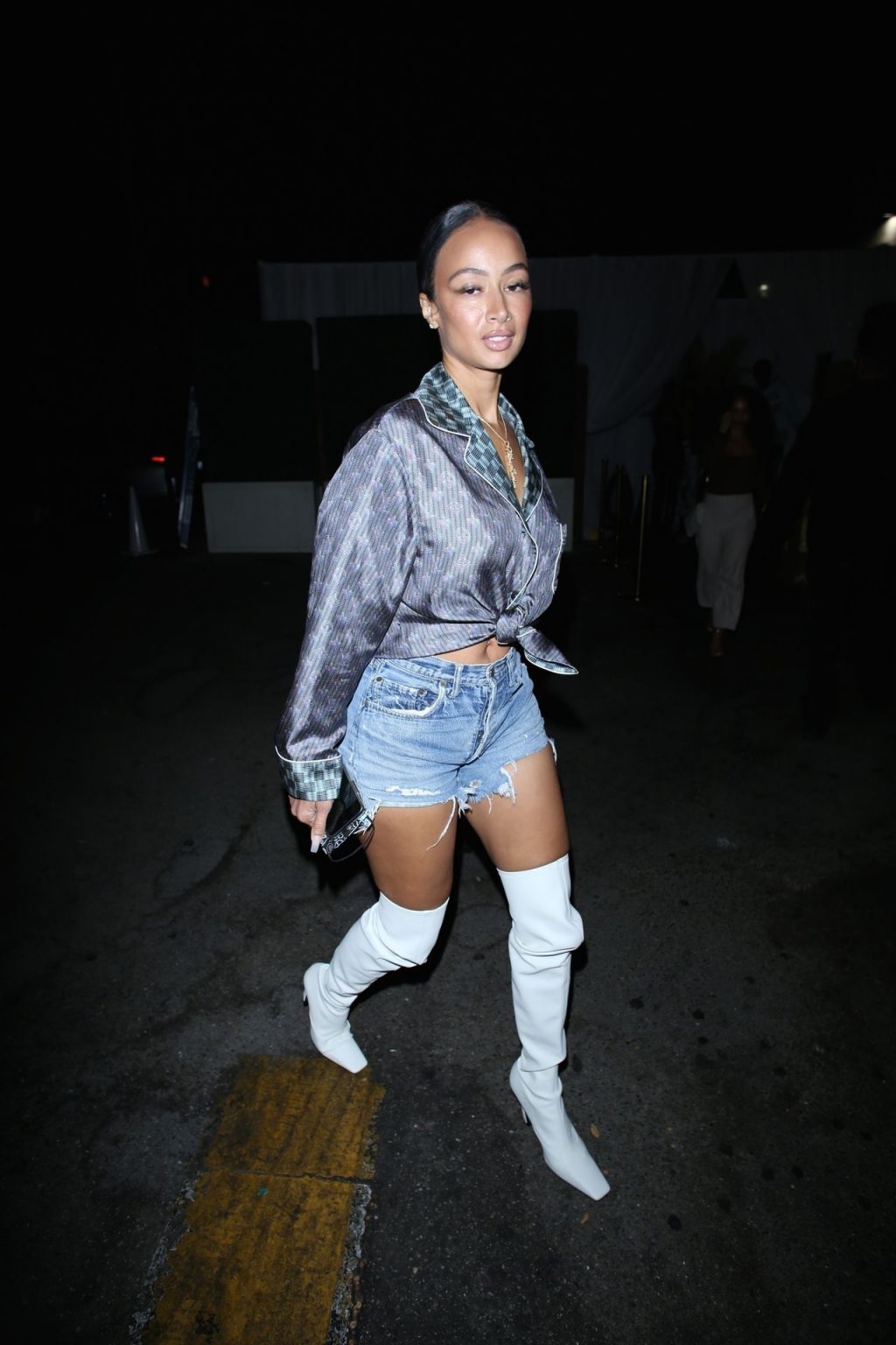 Draya llevaba una blusa de Louis Vuitton con shorts de mezclilla, botas blancas hasta la rodilla y una mascarilla facial con diseño de bandana.
