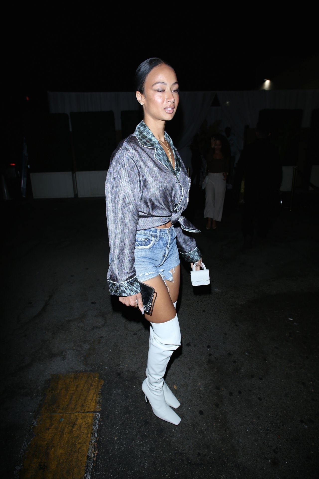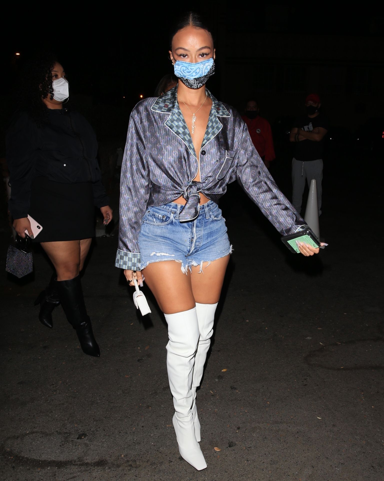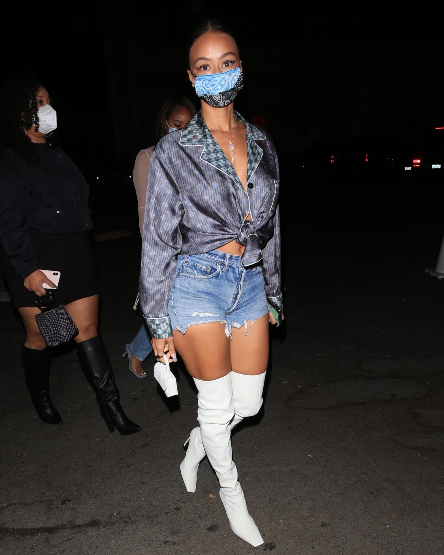 Draya llevaba una blusa de Louis Vuitton con shorts de mezclilla, botas blancas hasta la rodilla y una mascarilla facial con diseño de bandana.