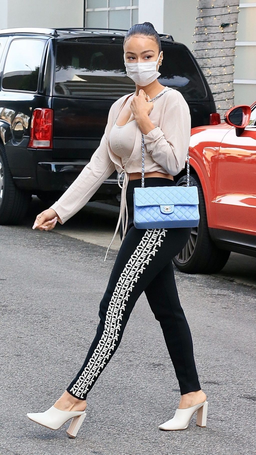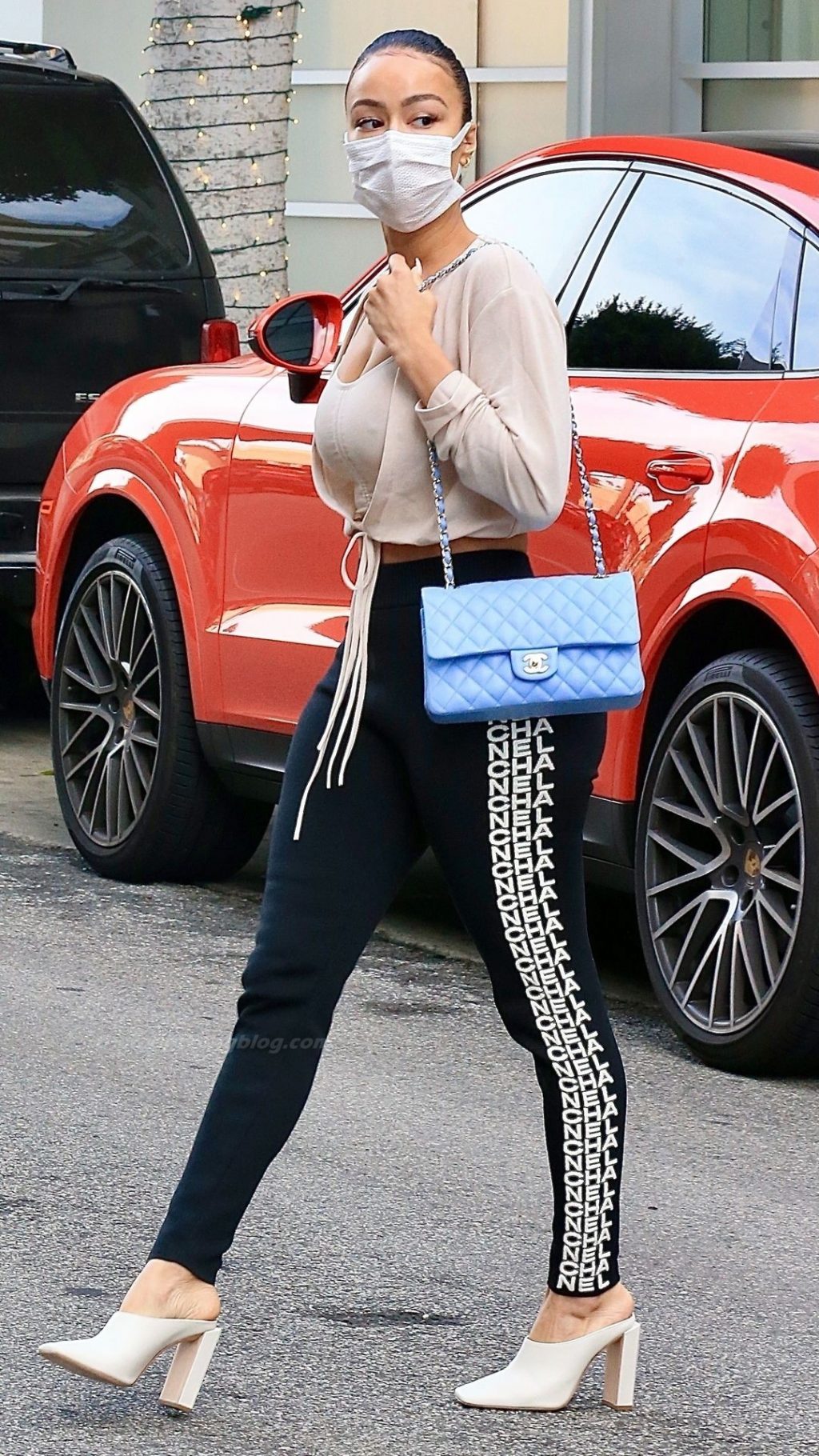 La hermosa empresaria lució sensacional con su top corto nude de Fashion Nova combinado con pantalones deportivos Chanel que se ajustaban a su figura curvilínea, tacones nude de Sebastian Milano y bolso azul polvo de Chanel. Draya se aseguró de mantenerse segura usando una mascarilla protectora según las regulaciones de Covid 19.