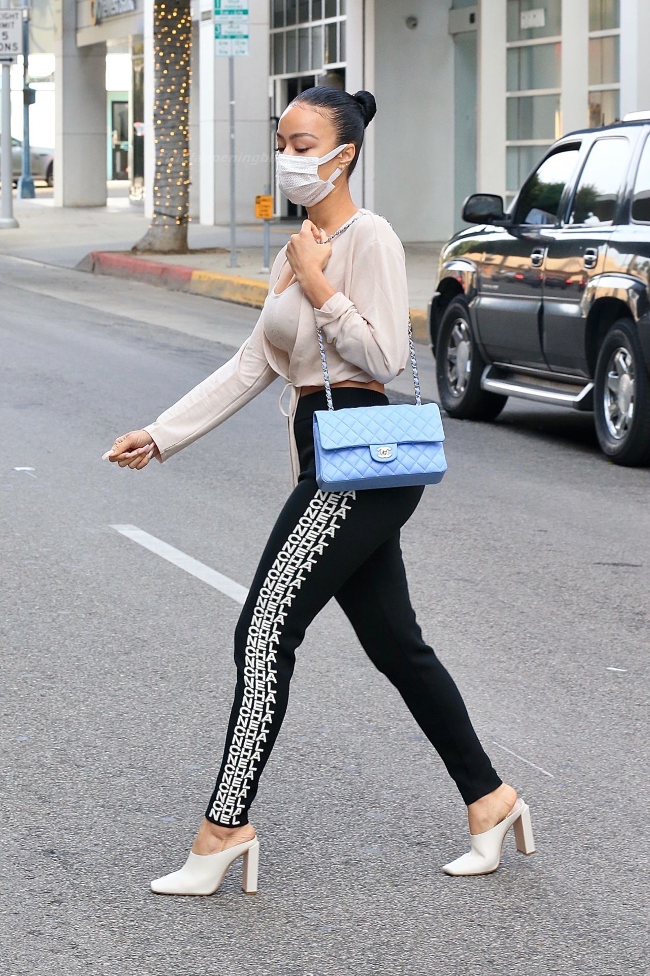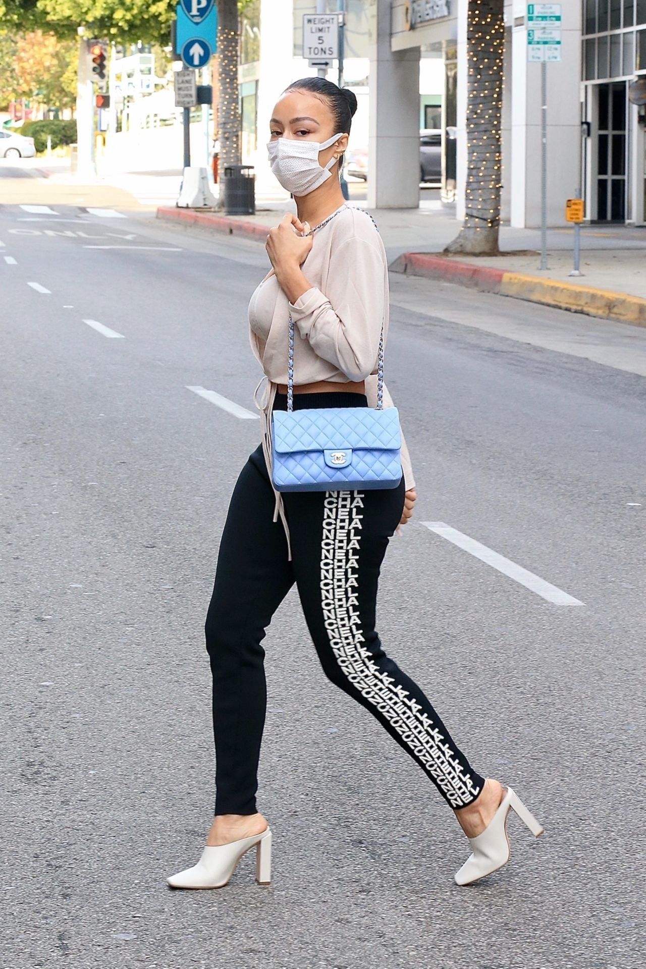 La hermosa empresaria lució sensacional con su top corto nude de Fashion Nova combinado con pantalones deportivos Chanel que se ajustaban a su figura curvilínea, tacones nude de Sebastian Milano y bolso azul polvo de Chanel. Draya se aseguró de mantenerse segura usando una mascarilla protectora según las regulaciones de Covid 19.