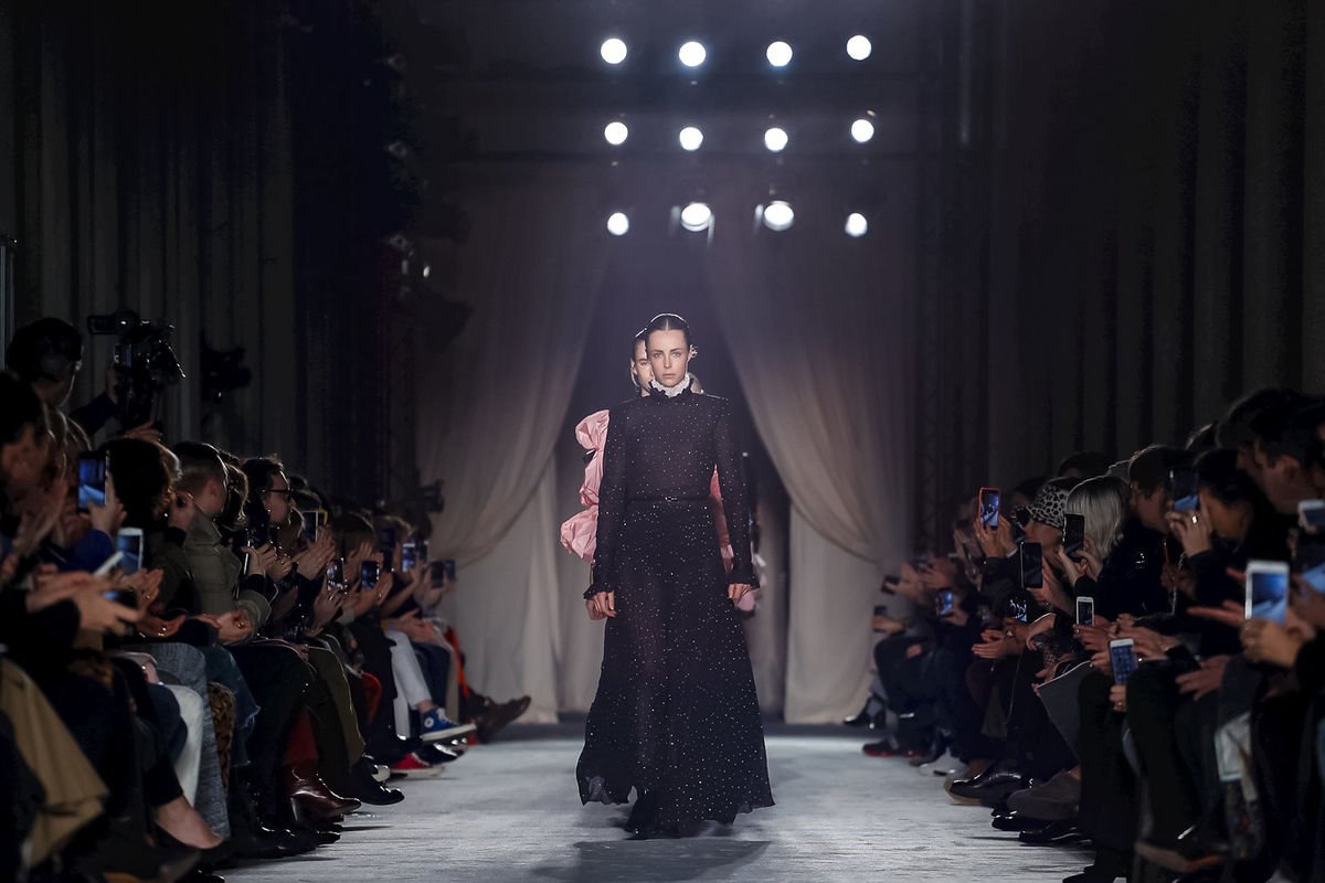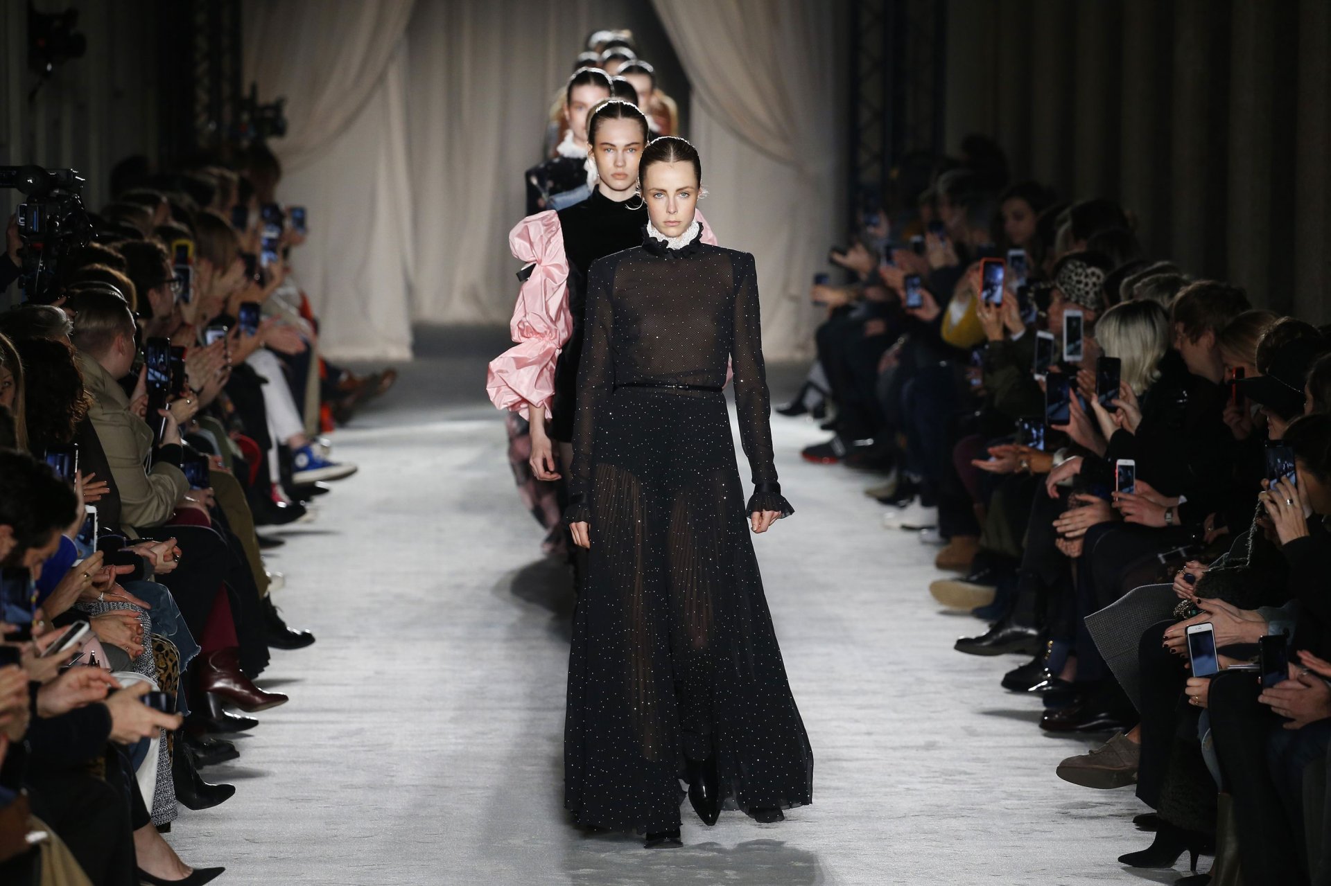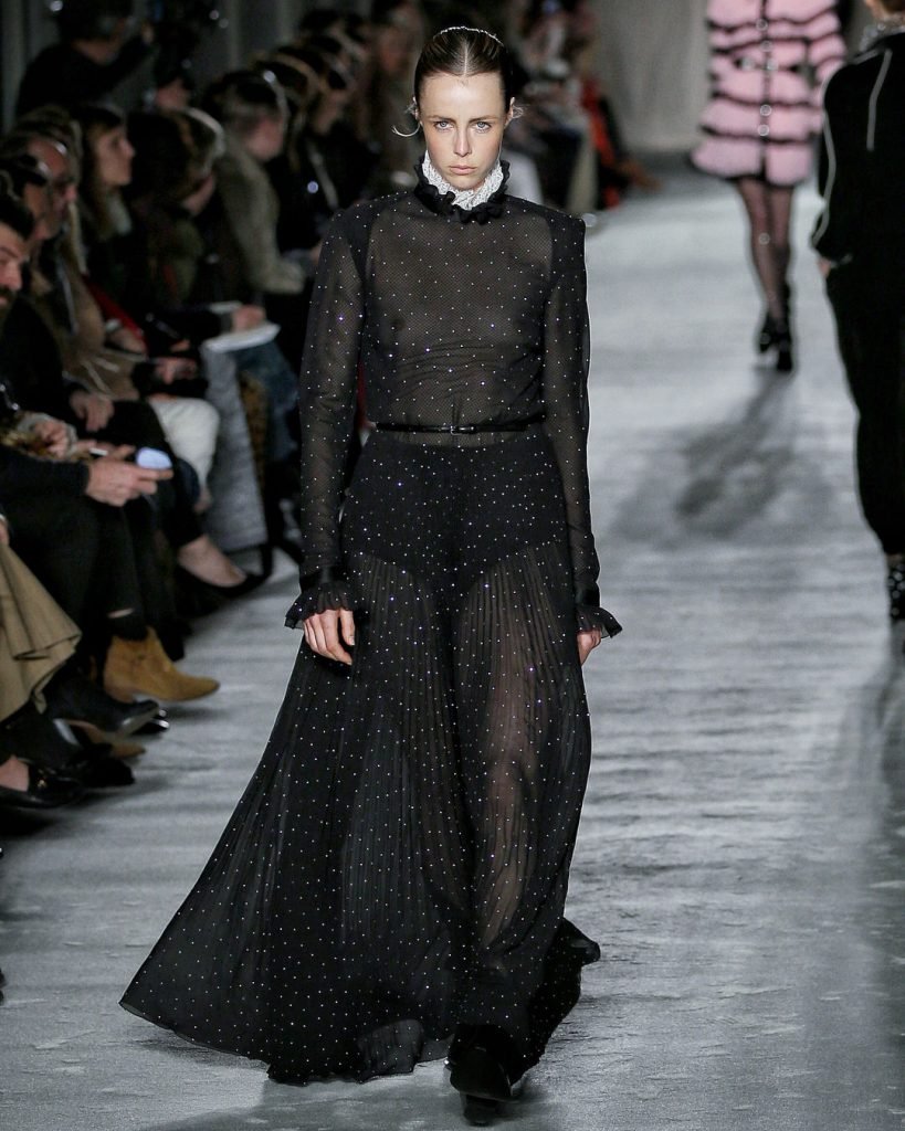 Modela Edie Campbell desfila con un vestido transparente en el desfile de moda Philosophy di Lorenzo Serafini en Milán, 24/02/2018.