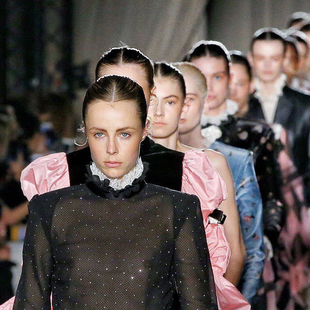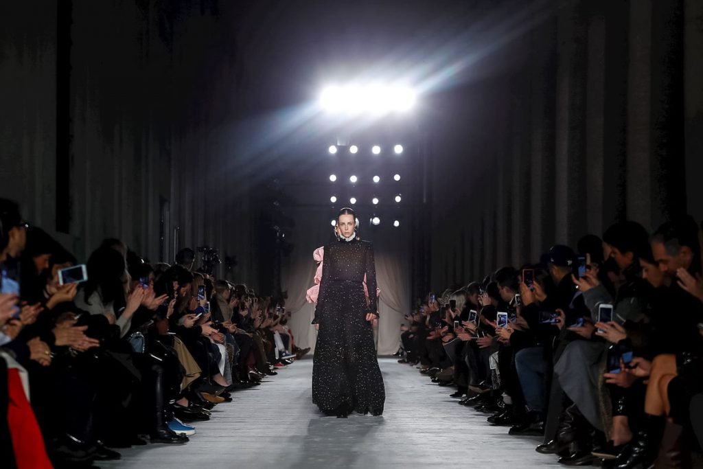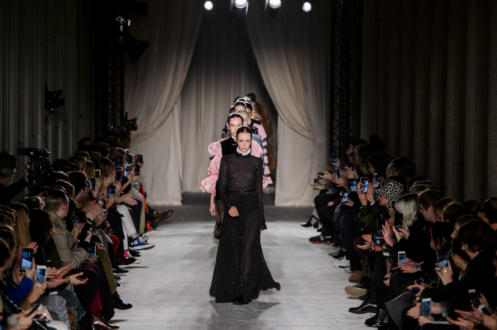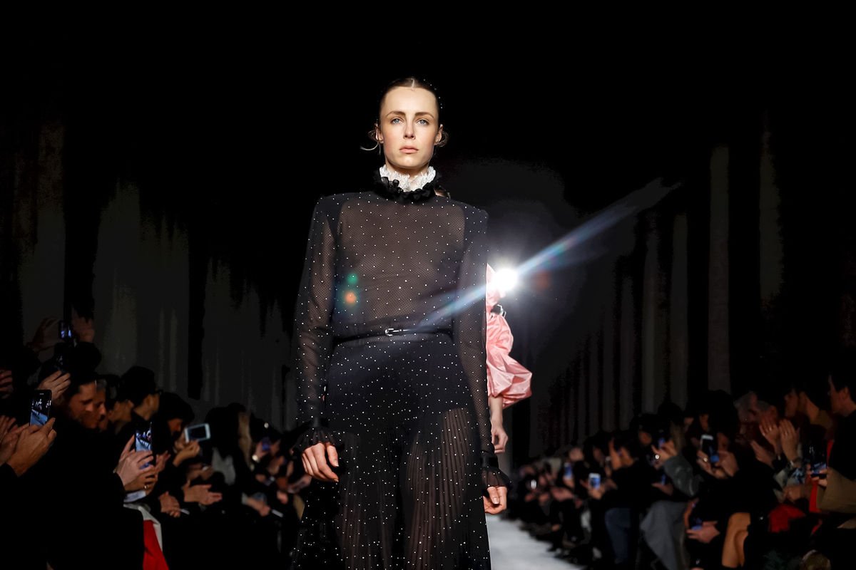 Modela Edie Campbell desfila con un vestido transparente en el desfile de moda Philosophy di Lorenzo Serafini en Milán, 24/02/2018.
