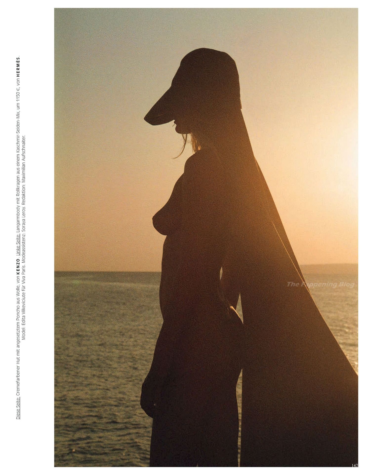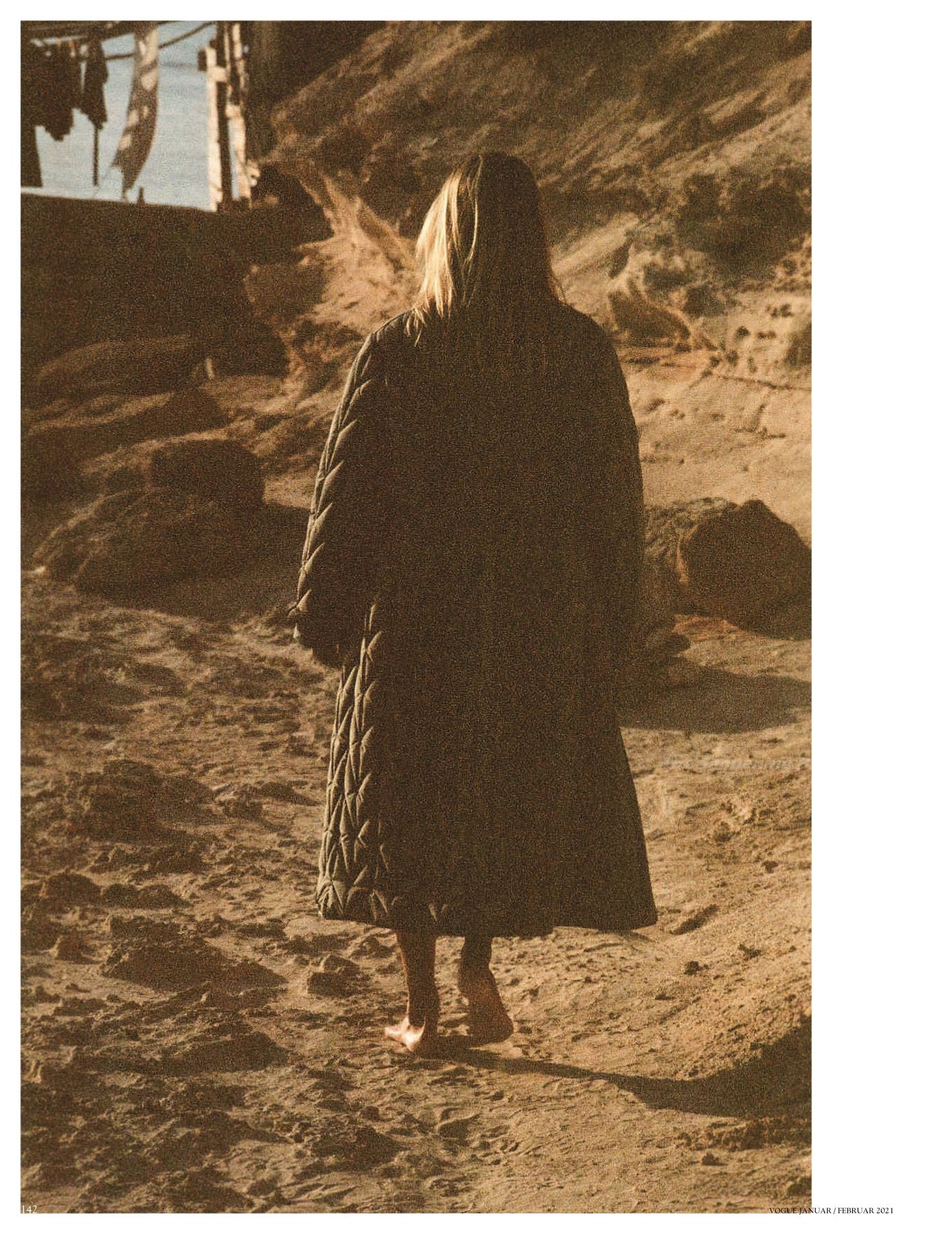 La modelo lituana besada por el sol Edita Vilkeviciute (32) muestra sus pechos desnudos, posando sin camiseta en la playa en una sesión fotográfica de Henrik Purienne para la revista Vogue Alemania, edición de enero/febrero 2021.