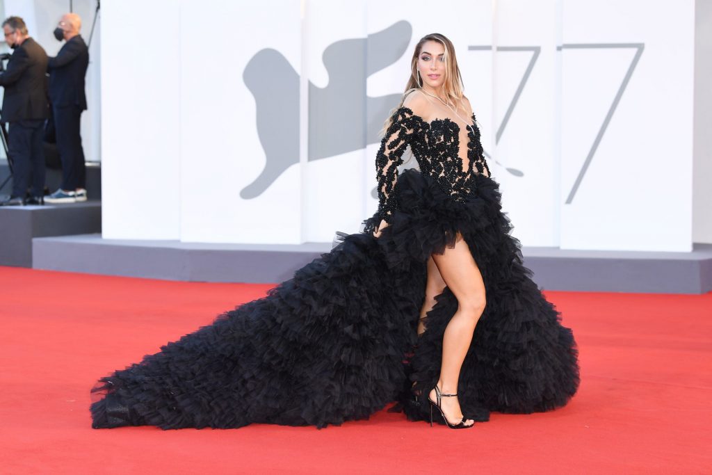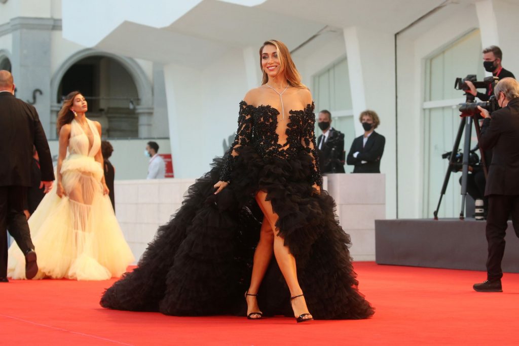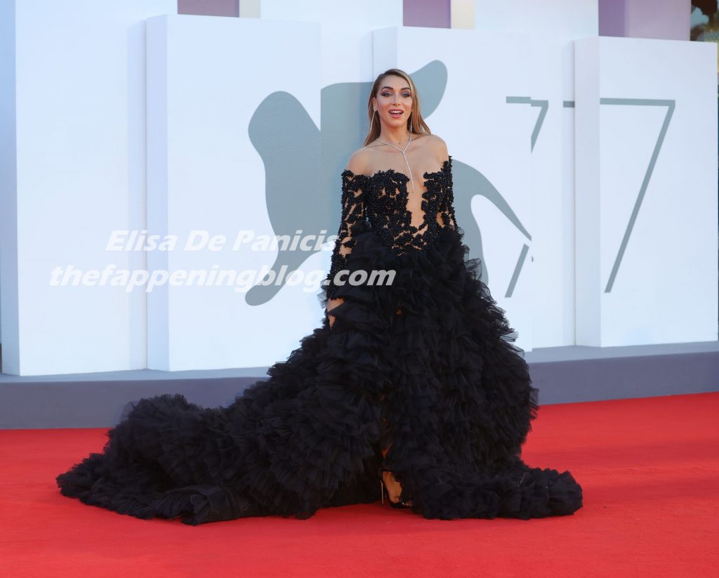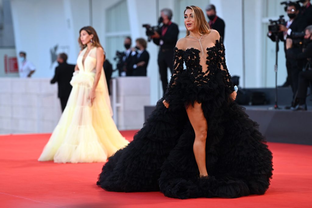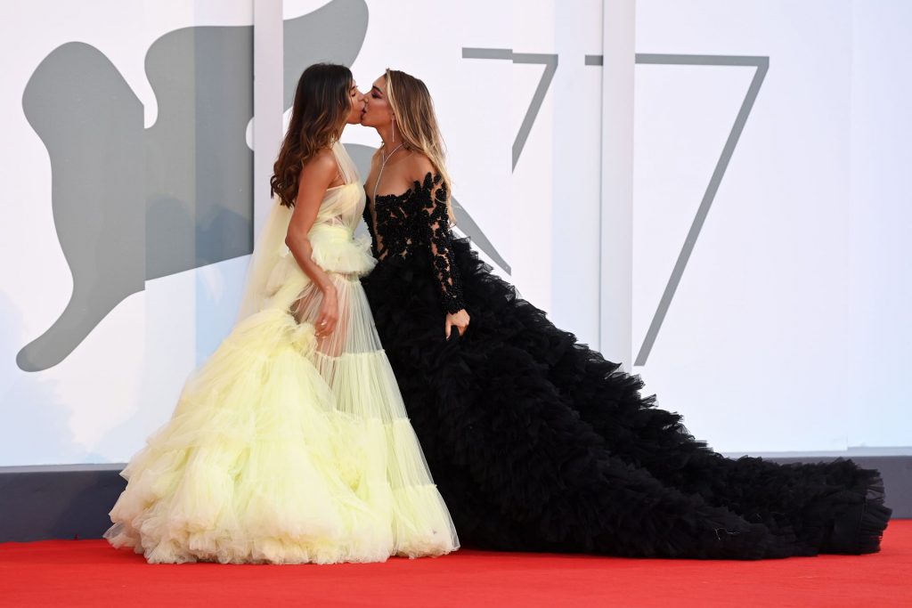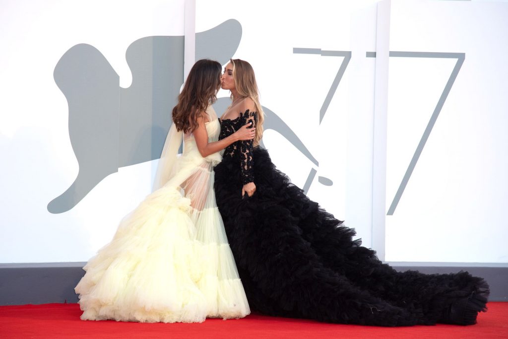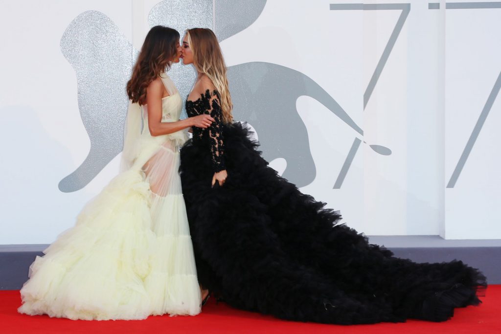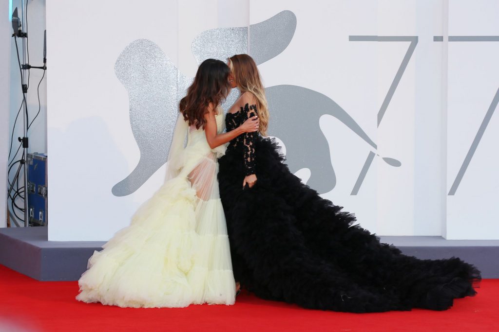 La alta modelo italiana Elisa De Panicis Agnelli (27) muestra su hermosa figura mientras posa con un hermoso vestido negro y besa a Mila Suarez en la alfombra roja antes de la película “Le Sorelle Macaluso” en el 77º Festival de Cine de Venecia en Venecia, 09/09/2020.