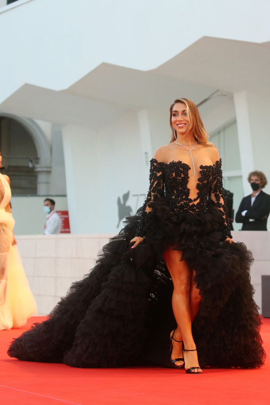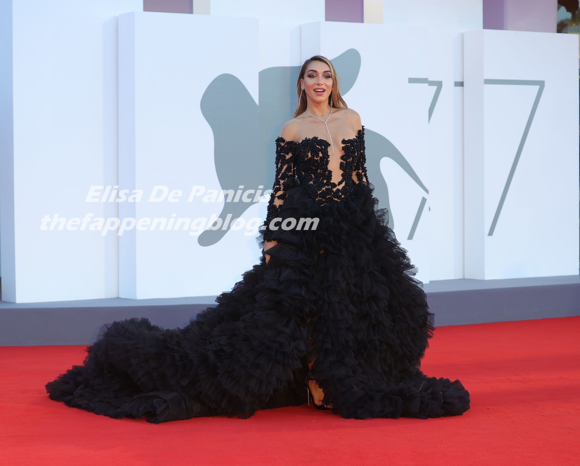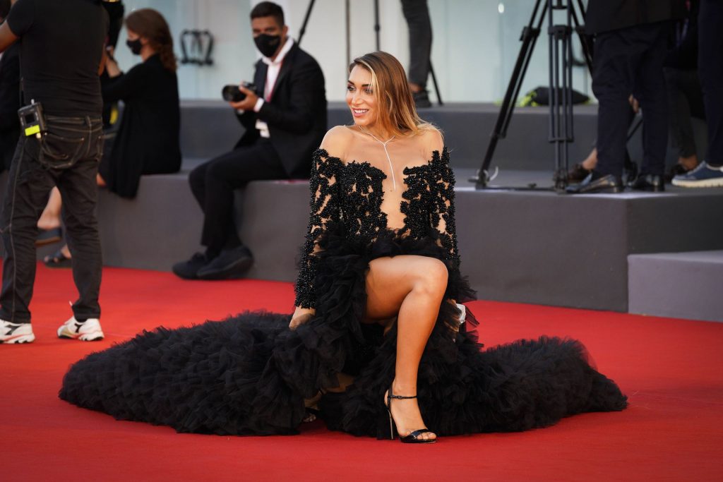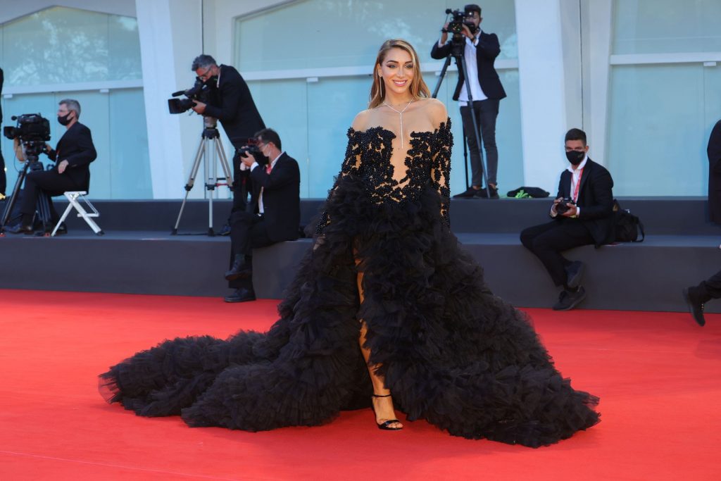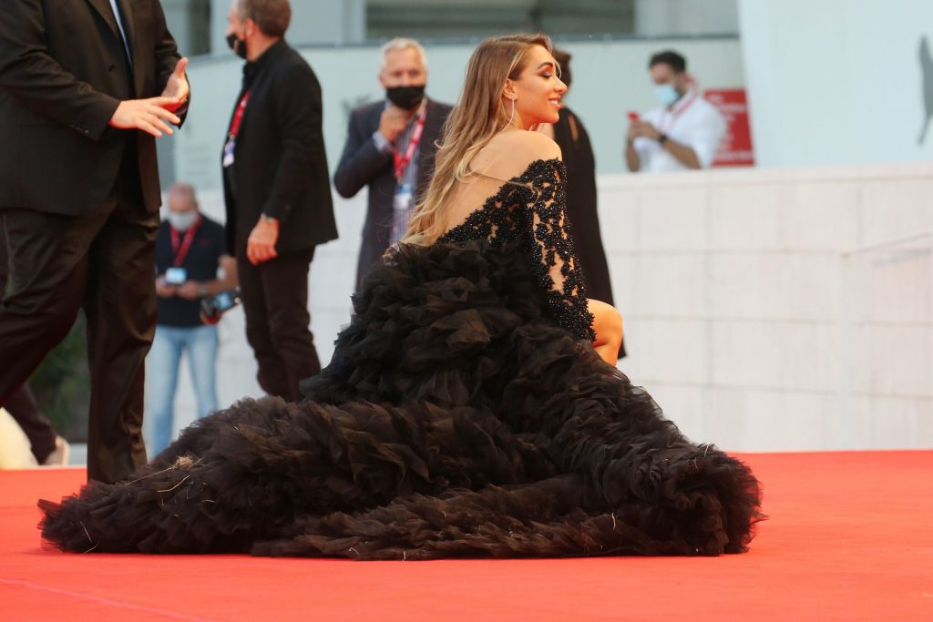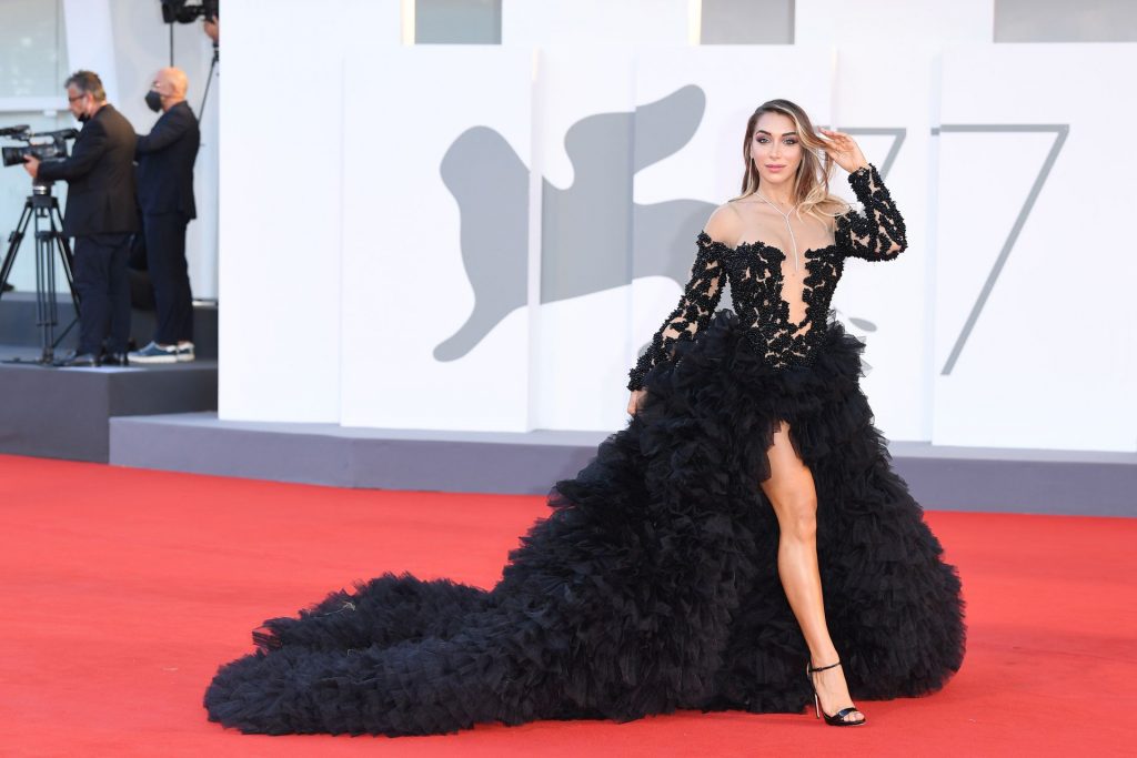 La alta modelo italiana Elisa De Panicis Agnelli (27) muestra su hermosa figura mientras posa con un hermoso vestido negro y besa a Mila Suarez en la alfombra roja antes de la película “Le Sorelle Macaluso” en el 77º Festival de Cine de Venecia en Venecia, 09/09/2020.