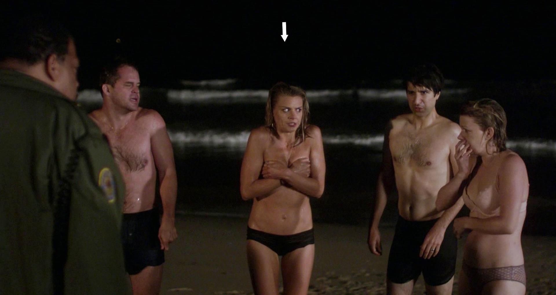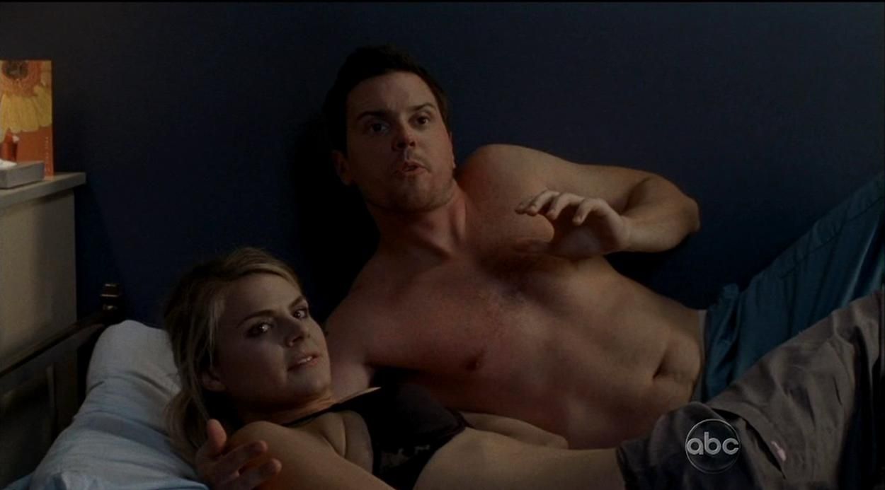 Eliza Coupe is having sex with a guy on the edge of a bed, naked in his lap as she rides him and we see her breasts and butt. She then dismounts and walks into another room naked to talk to a different guy. We see more of her breasts when she turns around and walks back to the bed, where she sits next to the first guy and wraps herself with the covers.