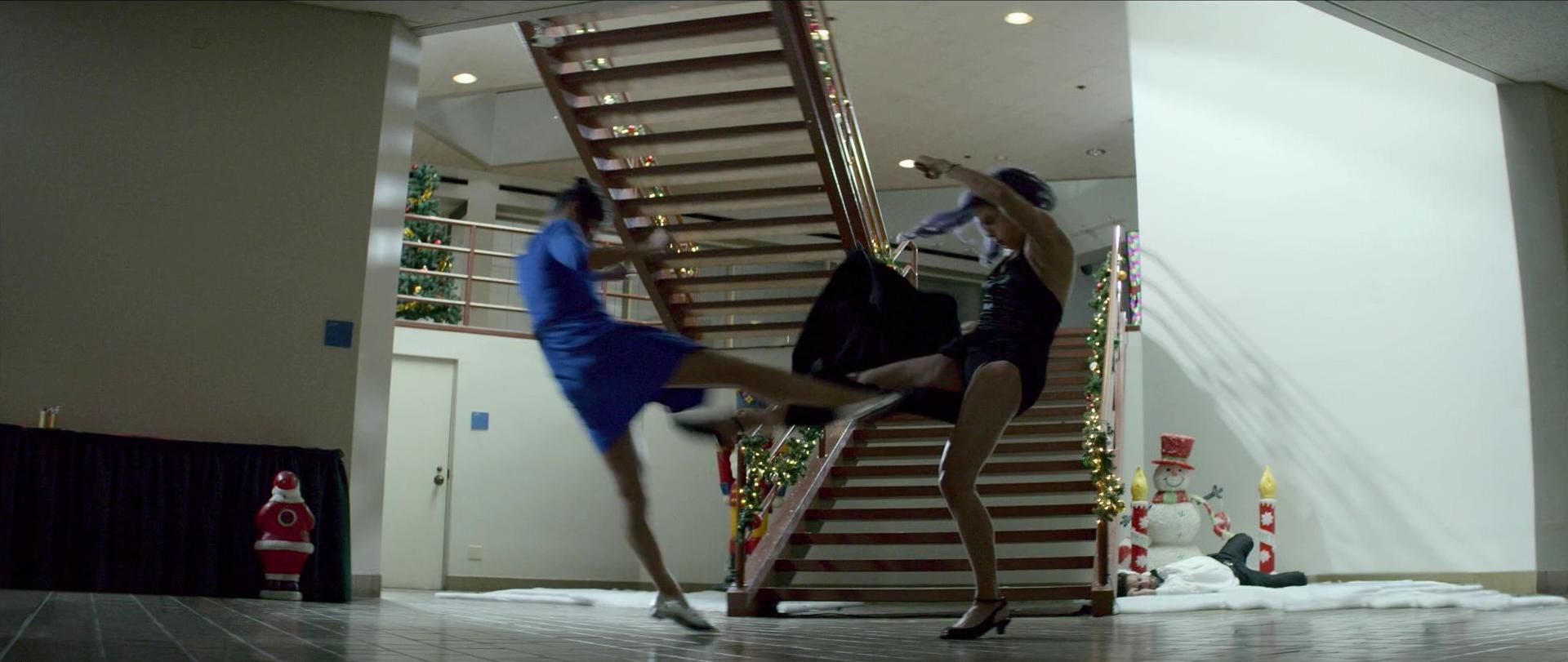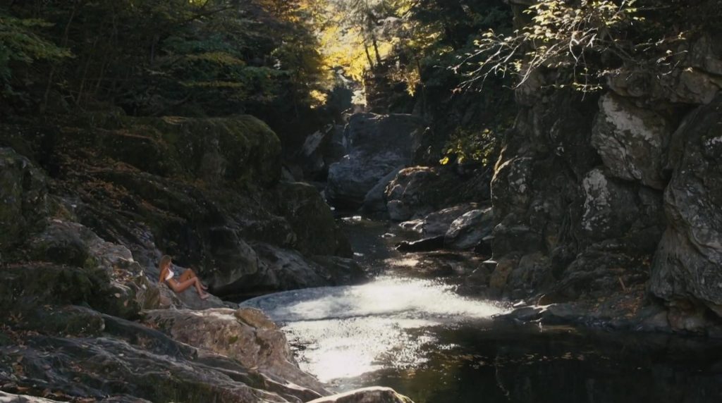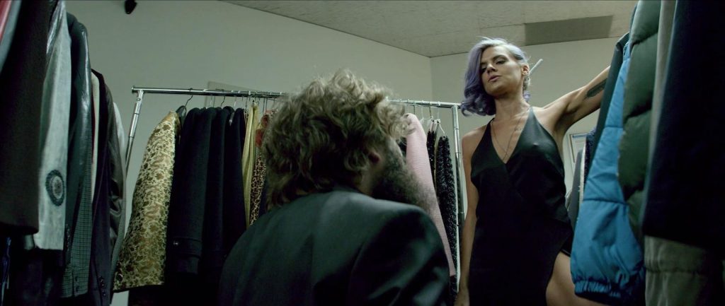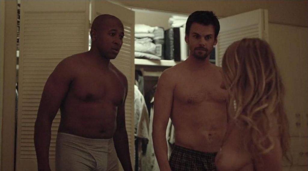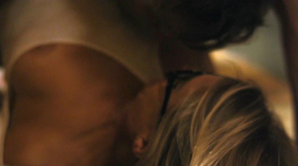 Eliza is seen having sex with a guy in a montage where we see her wearing a white tank top that lets her left nipple peek out into view when she is on her back. This alternates with footage of Eliza in the same tank top kissing the guy, this time with some pink panties on.