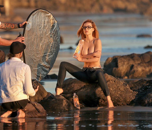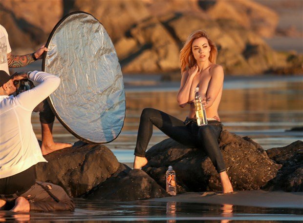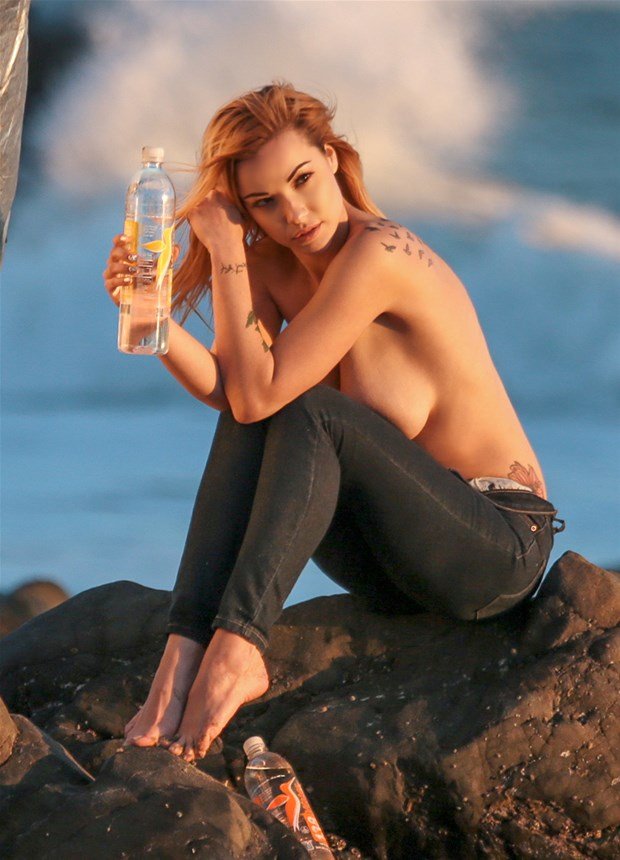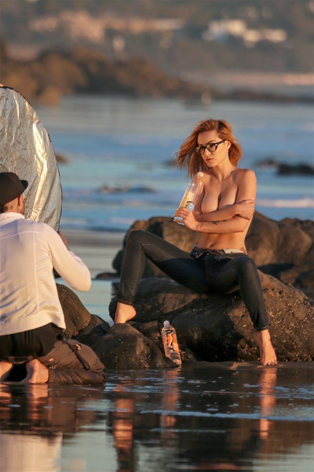 Elizabeth Marxs posando sin camiseta para una sesión de 138 Water en Malibu, 02/02/2016. Sirena con jeans… Elizabeth Marxs es una modelo. Edad: 24 (13 de junio de 1991).