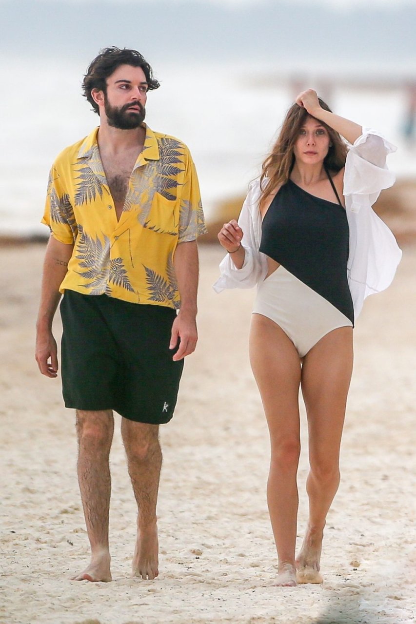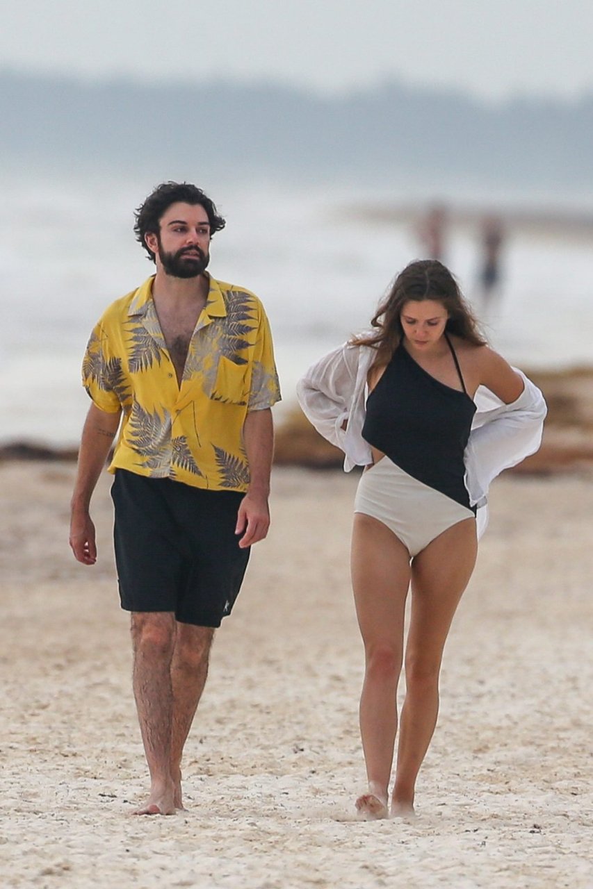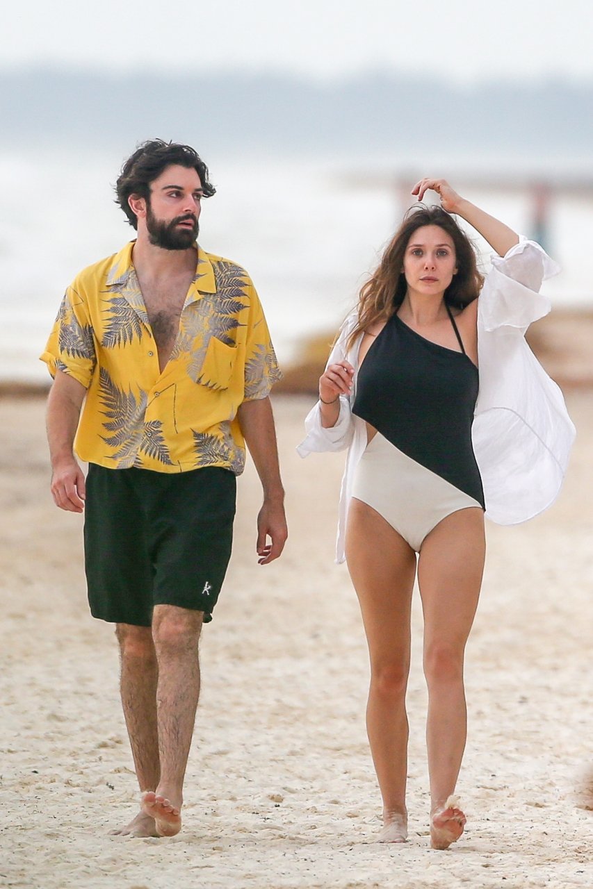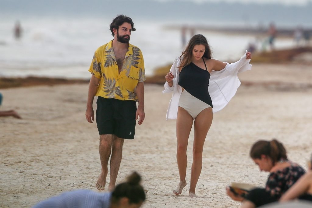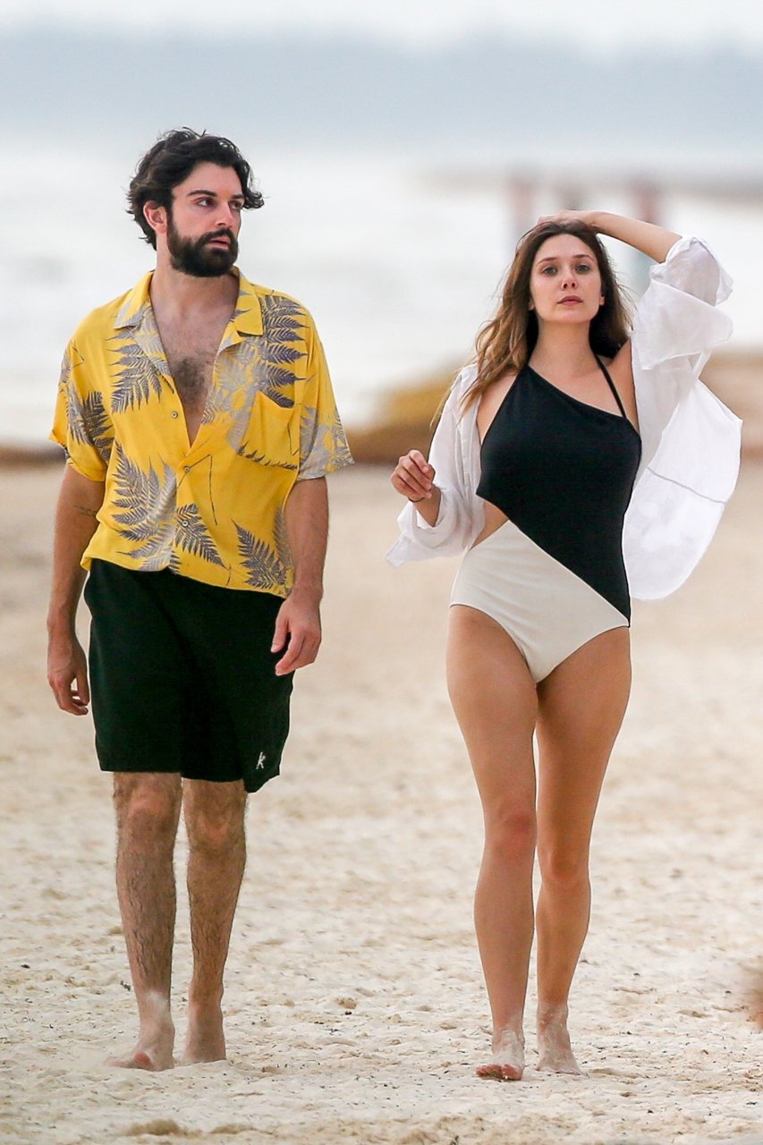 La actriz estadounidense Elizabeth Olsen (29) fue vista usando un traje de baño blanco y negro con su novio Robbie Arnett en la playa en México, 28/07/2018.