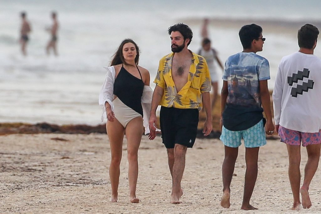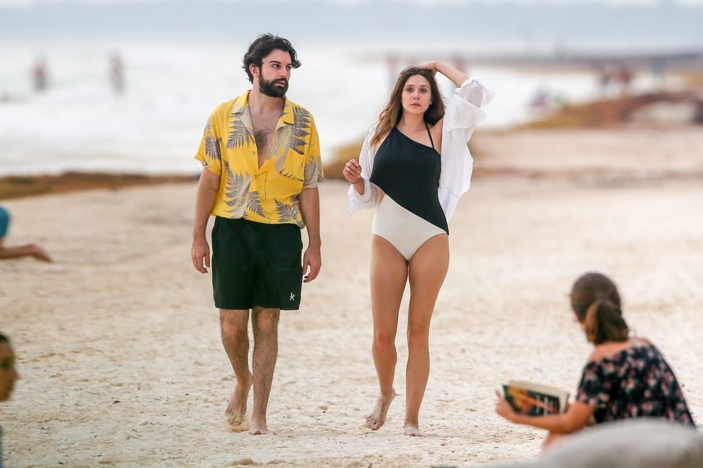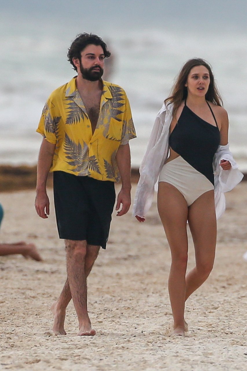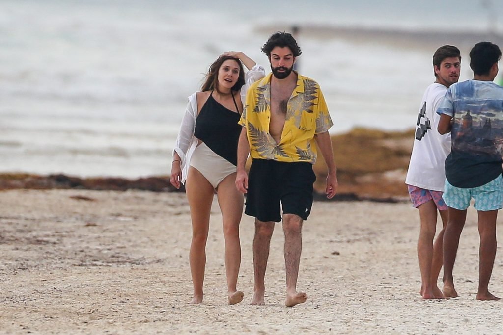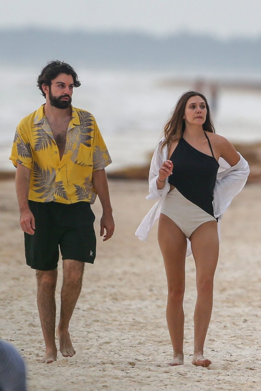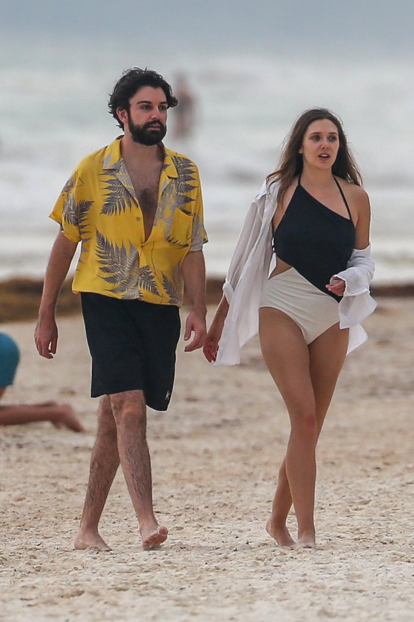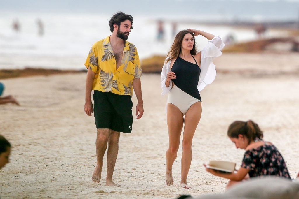 La actriz estadounidense Elizabeth Olsen (29) fue vista usando un traje de baño blanco y negro con su novio Robbie Arnett en la playa en México, 28/07/2018.