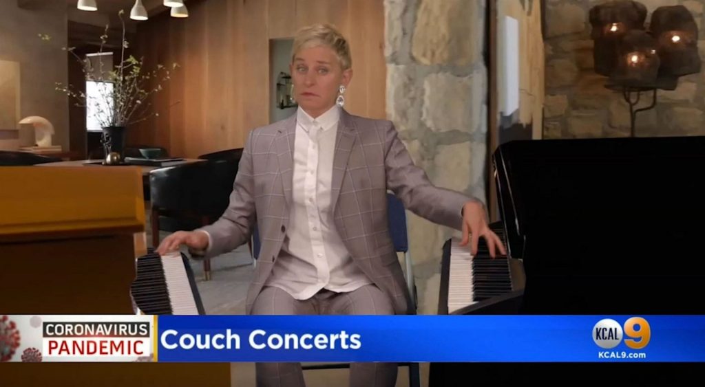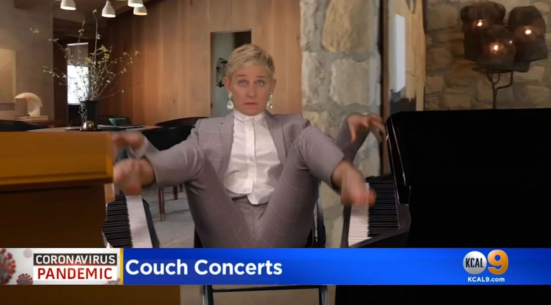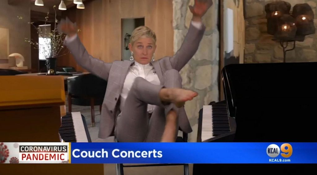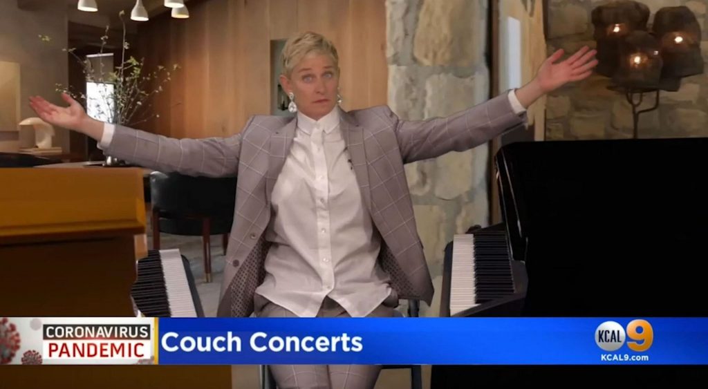 Ellen DeGeneres se burla de las celebridades que realizan conciertos en video para sus fans mientras protagoniza su propio ‘Concierto en el sofá’ (marzo de 2020).