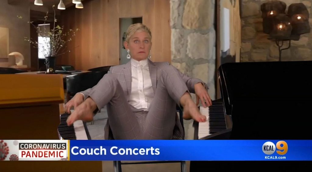 La presentadora del programa de entrevistas ha estado entreteniendo a sus propios fans con varios clips de video mientras su programa diurno está en pausa debido al brote de Coronavirus. En el último clip, se ve a Ellen sentada de manera divertida entre dos pianos, vestida con un traje gris, con los pies descalzos y las uñas de los pies pintadas de rojo brillante. Después de mostrar imágenes de Chris Martin de Coldplay, Keith Urban con su esposa Nicole Kidman y John Legend con su esposa Chrissy Teigen tocando sus canciones para los fans, Ellen lanza un video parodia donde toca ambos pianos con las manos Y los pies. La cámara luego enfoca a su audiencia sentada en su ‘sofá’ escuchando su concierto: cuatro de sus perros.