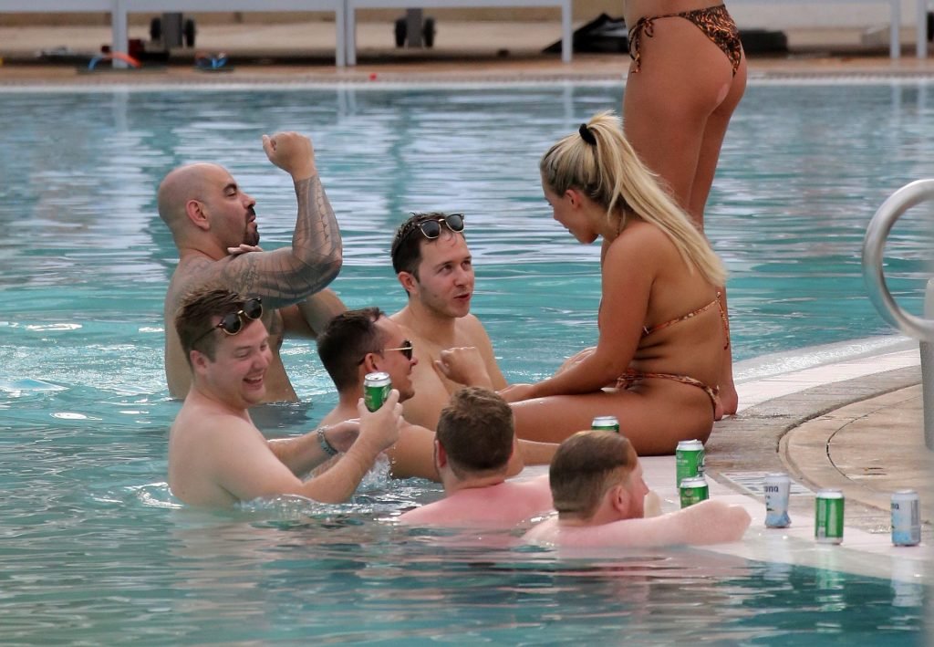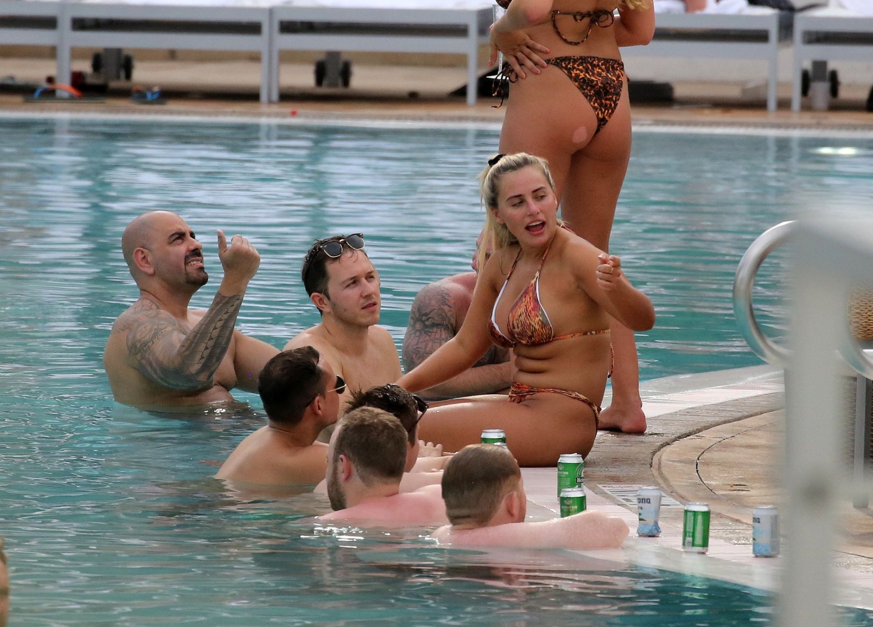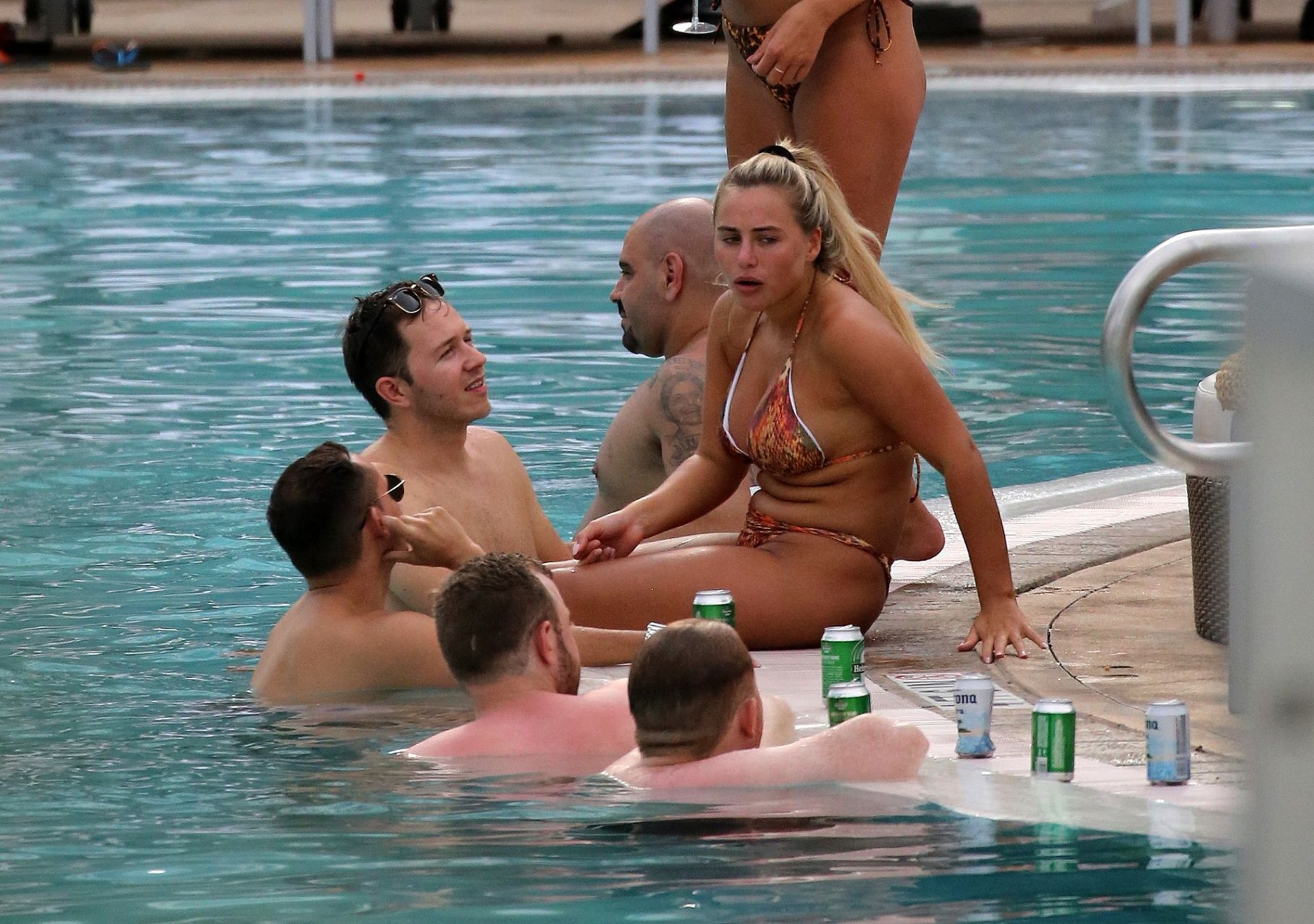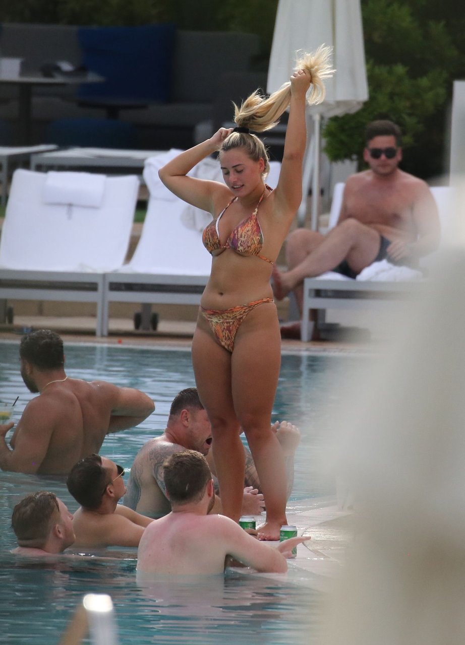 La estrella inglesa de la televisión reality Ellie Brown (21) lleva un bikini diminuto y atrae mucha atención junto a la piscina en Miami, 13/06/2019.