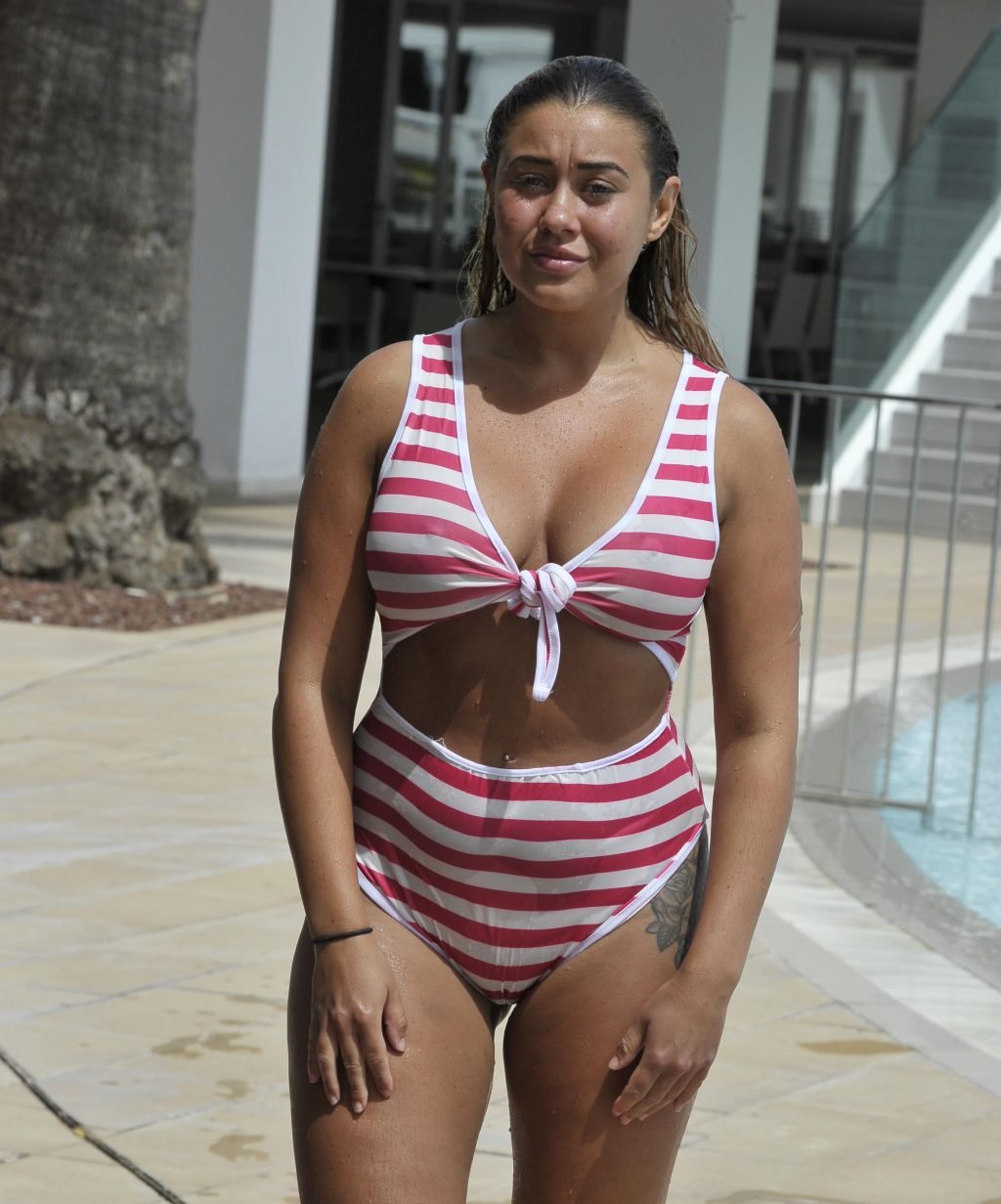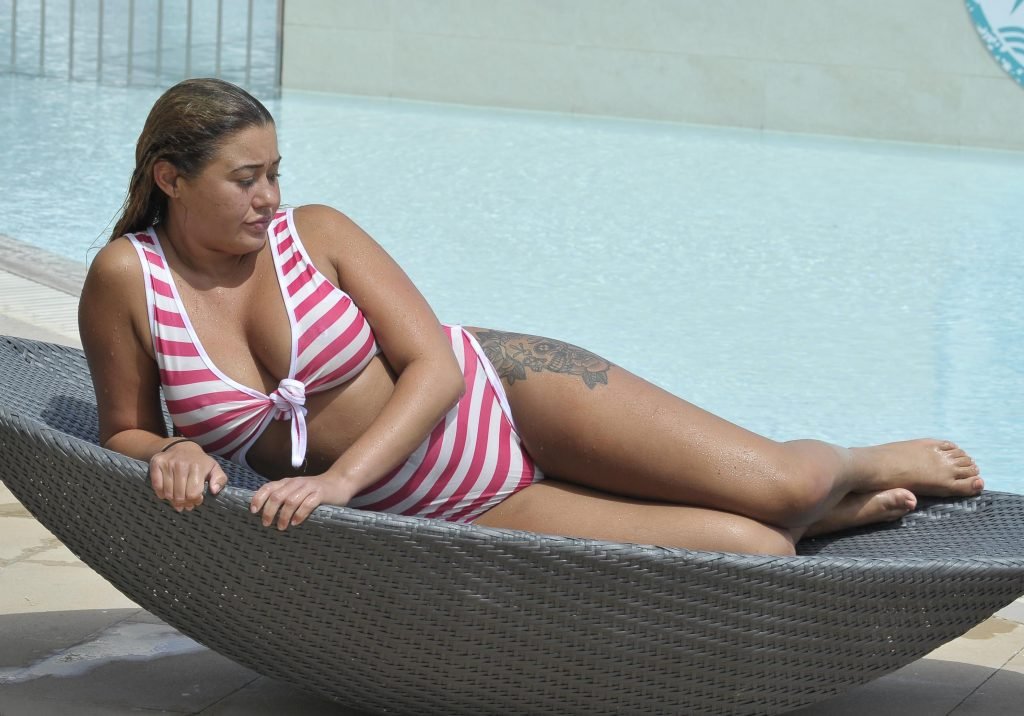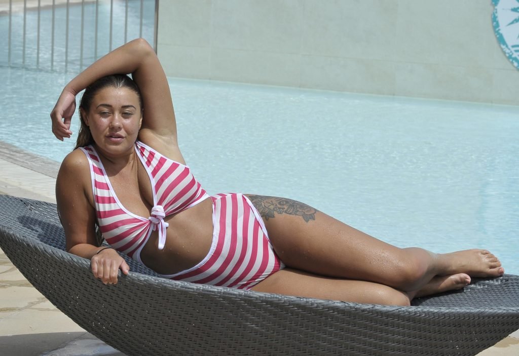 Big Brother’s Ellie Young fue vista con un bikini rojo y blanco mientras muestra un busto exuberante junto a la piscina mientras toma el sol en Palma, España, 04/08/2018.